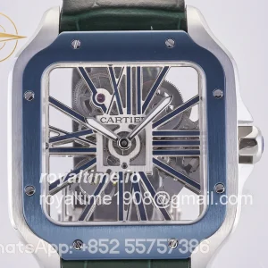 Cartier Santos Skeleton SS RF Skeleton Dial Blue Bezel on Green Leather Strap 9611MC