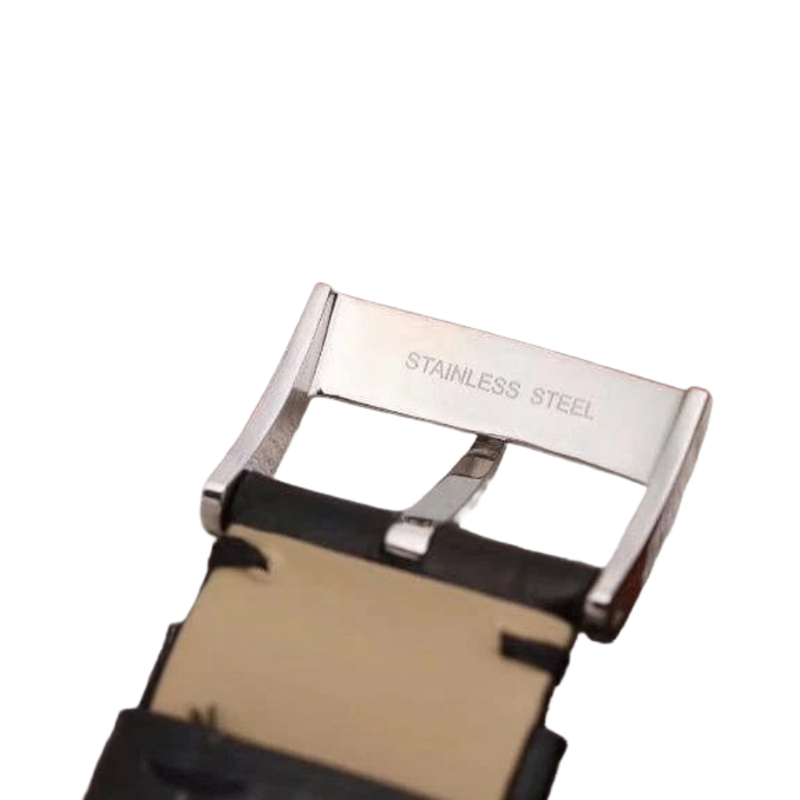 , the 40mm case showcases a polished steel finish, providing exceptional durability and corrosion resistance while maintaining a refined shine. The case is matched with a slim profile and a scratch-resistant