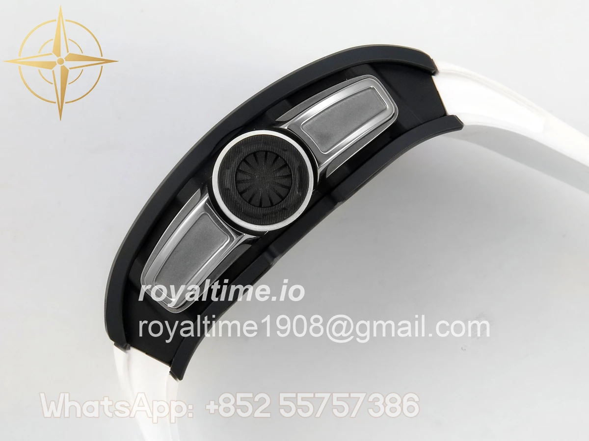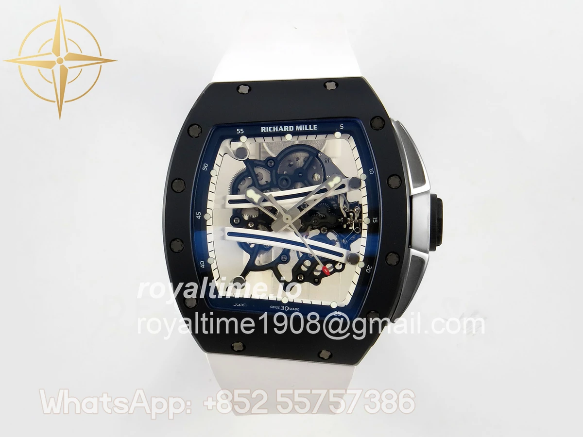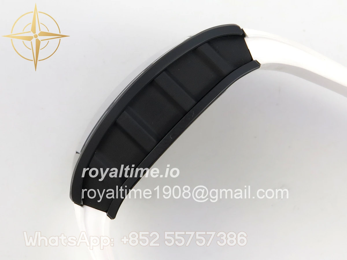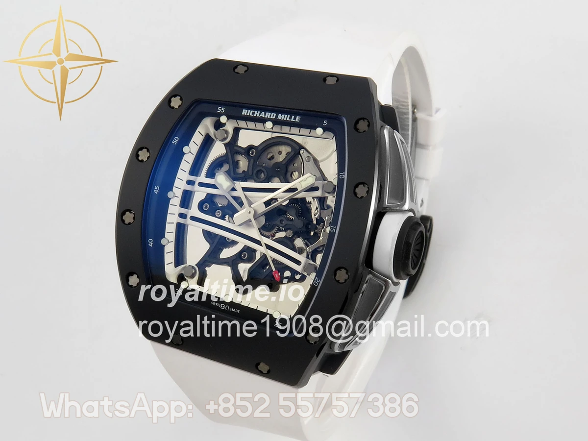 Size 43mm x 14.5mm Movement Free Sprung Vaucher RMUL2 skeleton movement, the best asian RM movement at the moment, same as genuine Functions Hours, minutes and seconds display Case Black ceramic case Crystal Scratch-proof sapphire crystal with AR coating Dial Skeleton dial Bezel Black ceramic bezel Strap White rubber strap Clasp Deployant clasp Water resistance >50 Meters Please be informed that this rating is merely a guide. We do do not advise submerging or immersing any replica watch in water unless you have had your watch water-proofed by a professional. We do not guarantee the product’s water-resistance and as such we do not refund, offer store credit, exchange or do a free repair on any watch that has water damage.