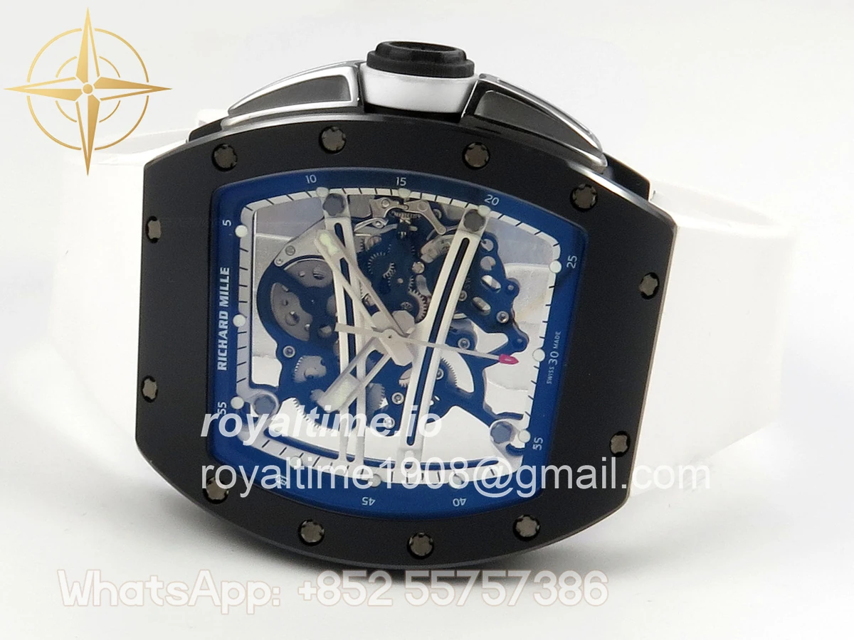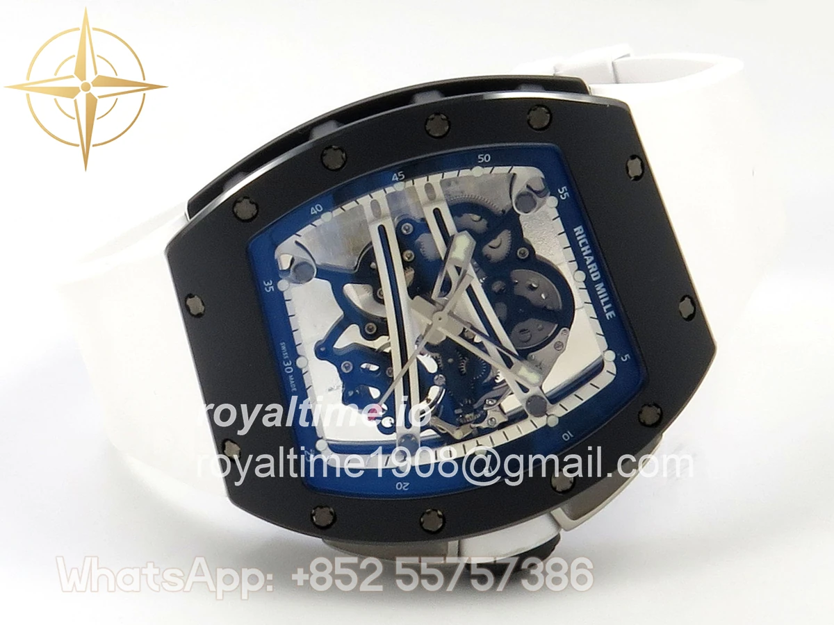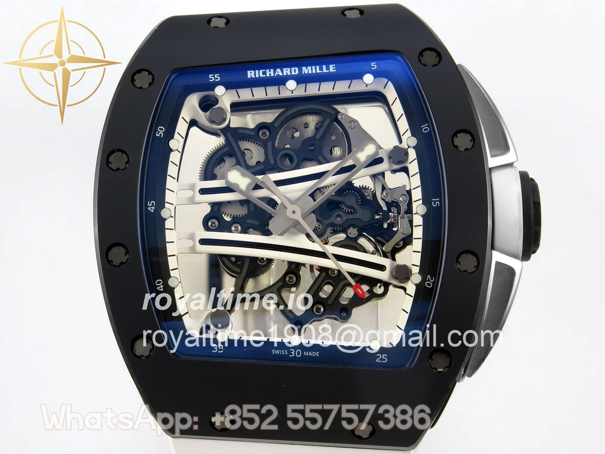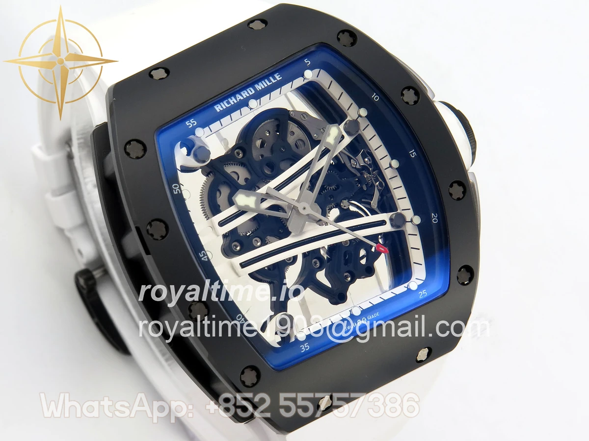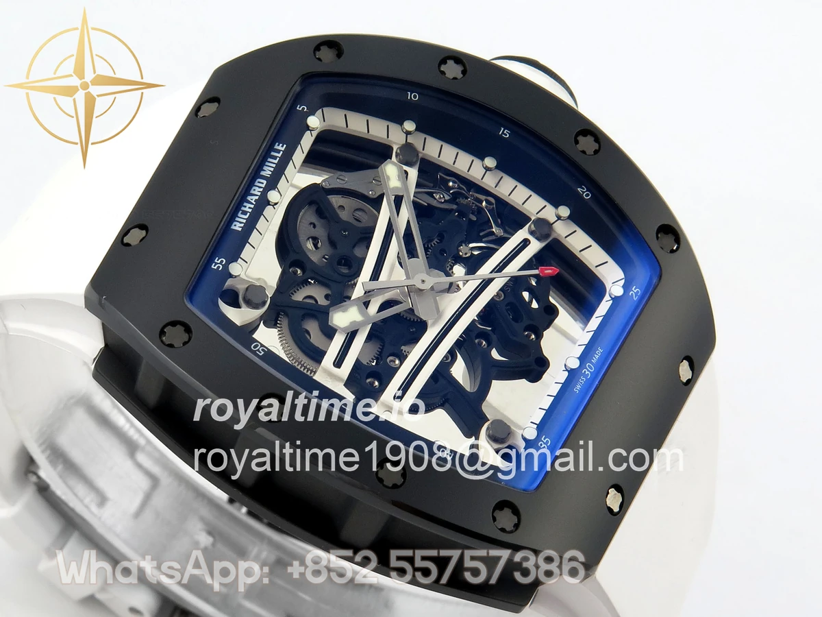 Size 43mm x 14.5mm Movement Free Sprung Vaucher RMUL2 skeleton movement, the best asian RM movement at the moment, same as genuine Functions Hours, minutes and seconds display Case Black ceramic case Crystal Scratch-proof sapphire crystal with AR coating Dial Skeleton dial Bezel Black ceramic bezel Strap White rubber strap Clasp Deployant clasp Water resistance >50 Meters Please be informed that this rating is merely a guide. We do do not advise submerging or immersing any replica watch in water unless you have had your watch water-proofed by a professional. We do not guarantee the product’s water-resistance and as such we do not refund, offer store credit, exchange or do a free repair on any watch that has water damage.