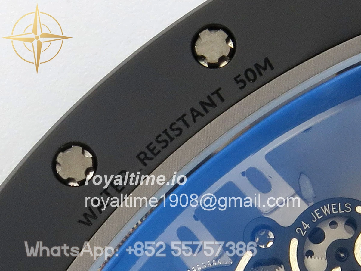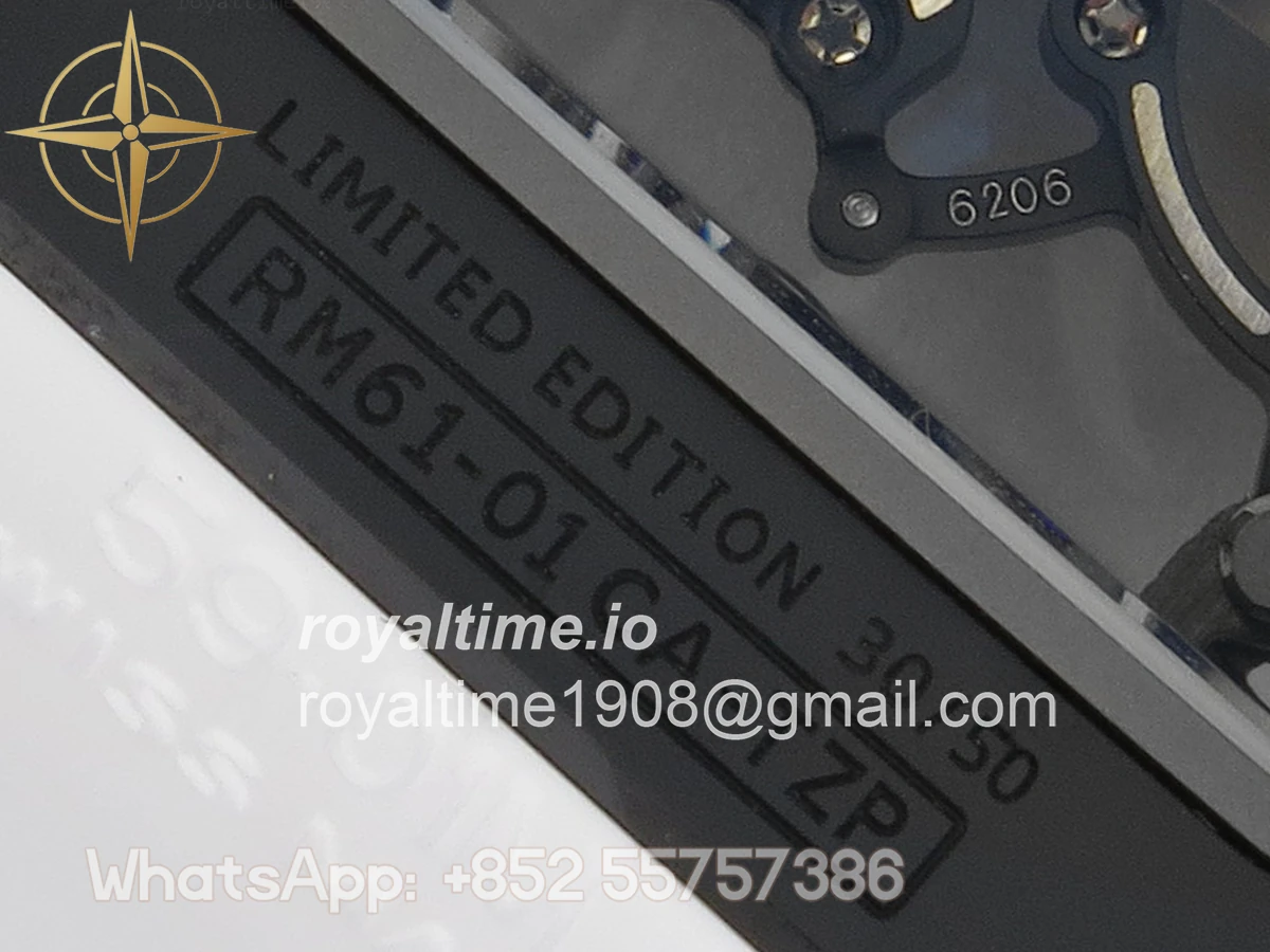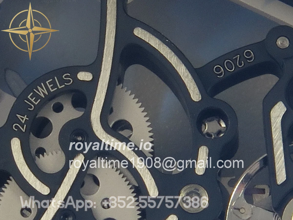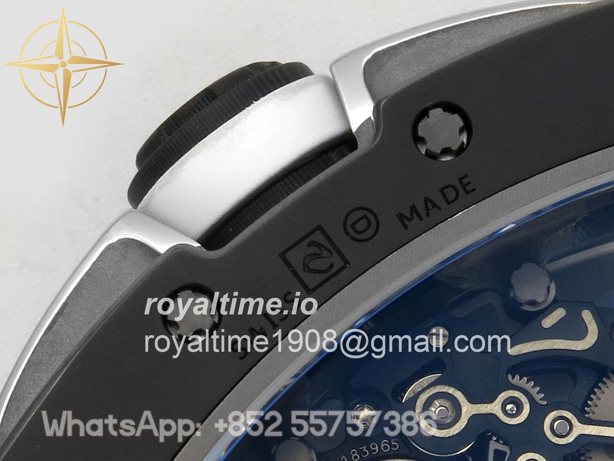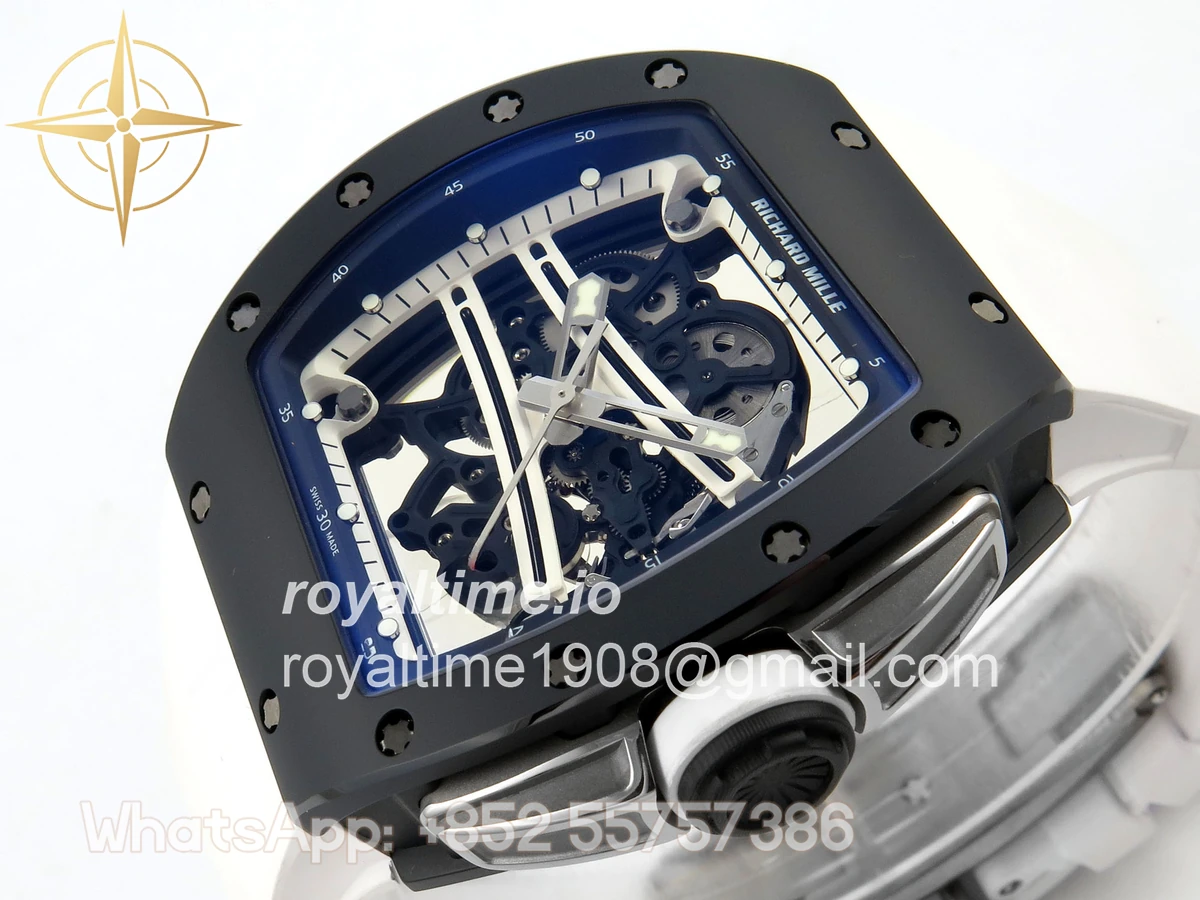 Size 43mm x 14.5mm Movement Free Sprung Vaucher RMUL2 skeleton movement, the best asian RM movement at the moment, same as genuine Functions Hours, minutes and seconds display Case Black ceramic case Crystal Scratch-proof sapphire crystal with AR coating Dial Skeleton dial Bezel Black ceramic bezel Strap White rubber strap Clasp Deployant clasp Water resistance >50 Meters Please be informed that this rating is merely a guide. We do do not advise submerging or immersing any replica watch in water unless you have had your watch water-proofed by a professional. We do not guarantee the product’s water-resistance and as such we do not refund, offer store credit, exchange or do a free repair on any watch that has water damage.