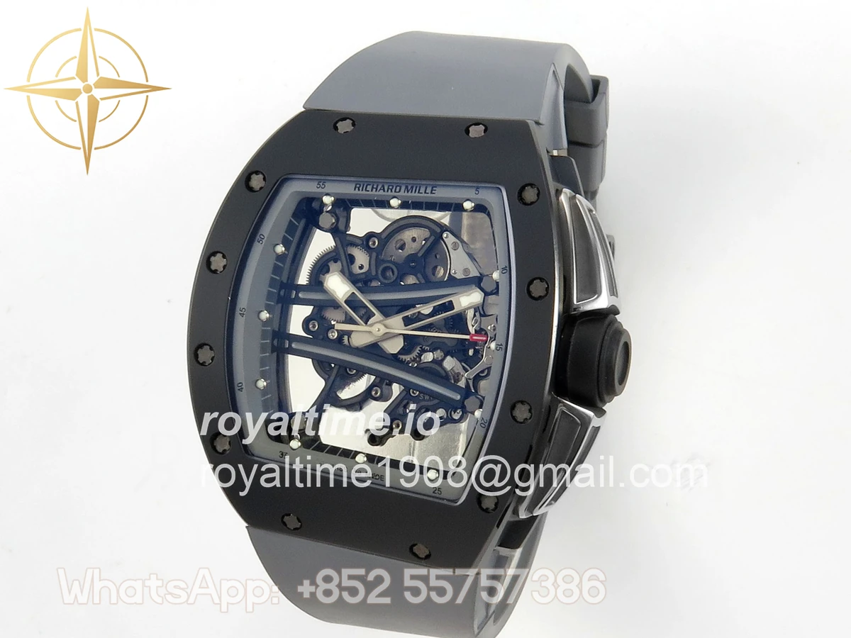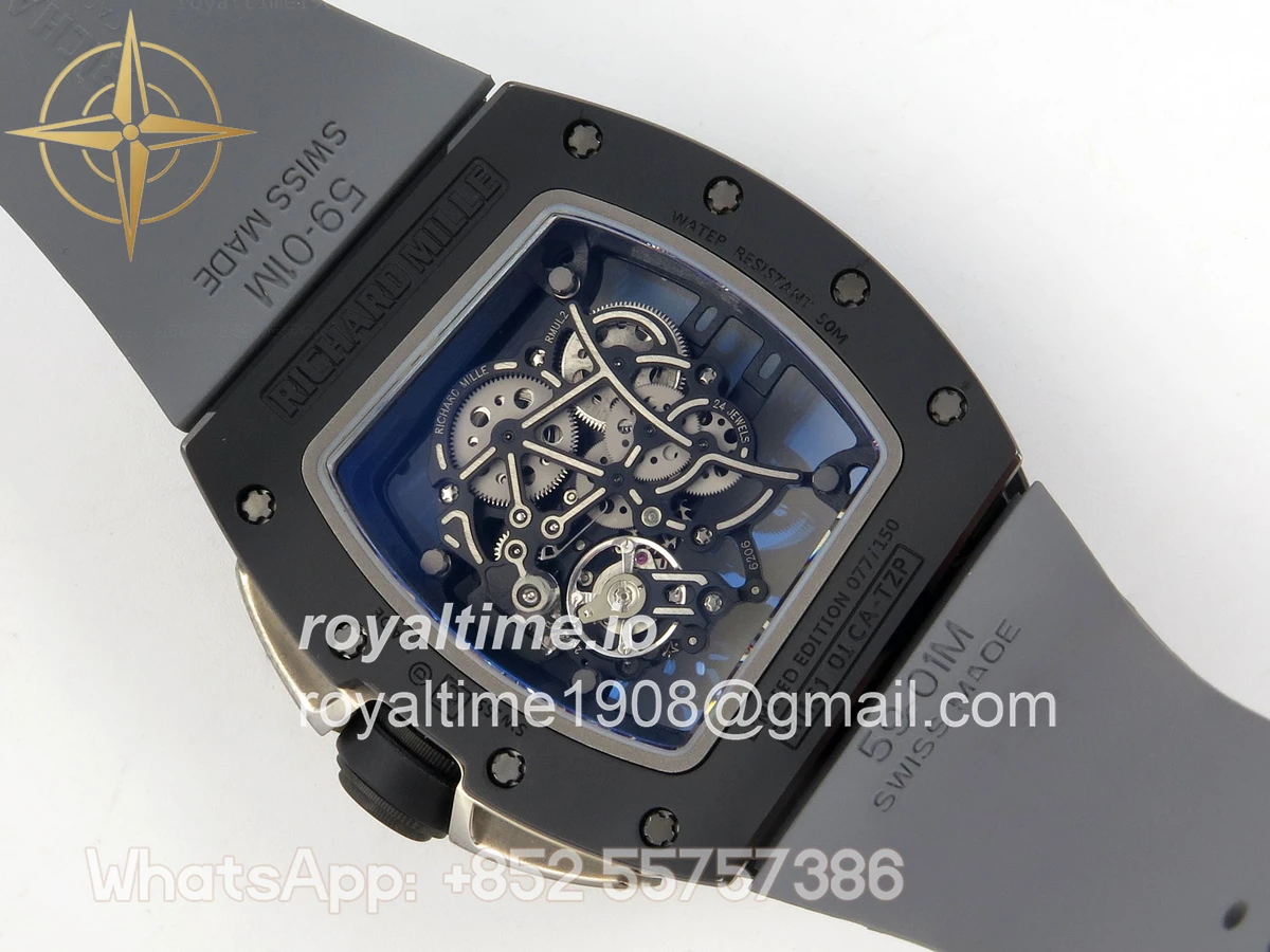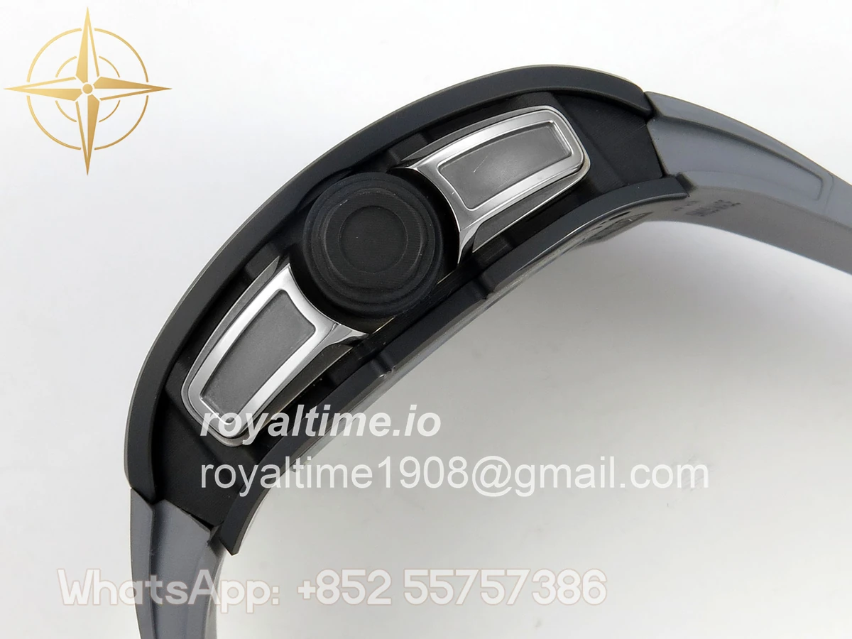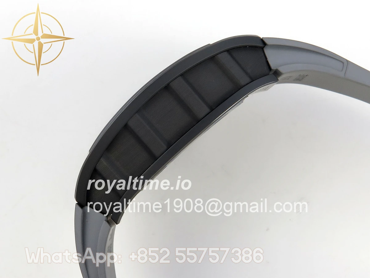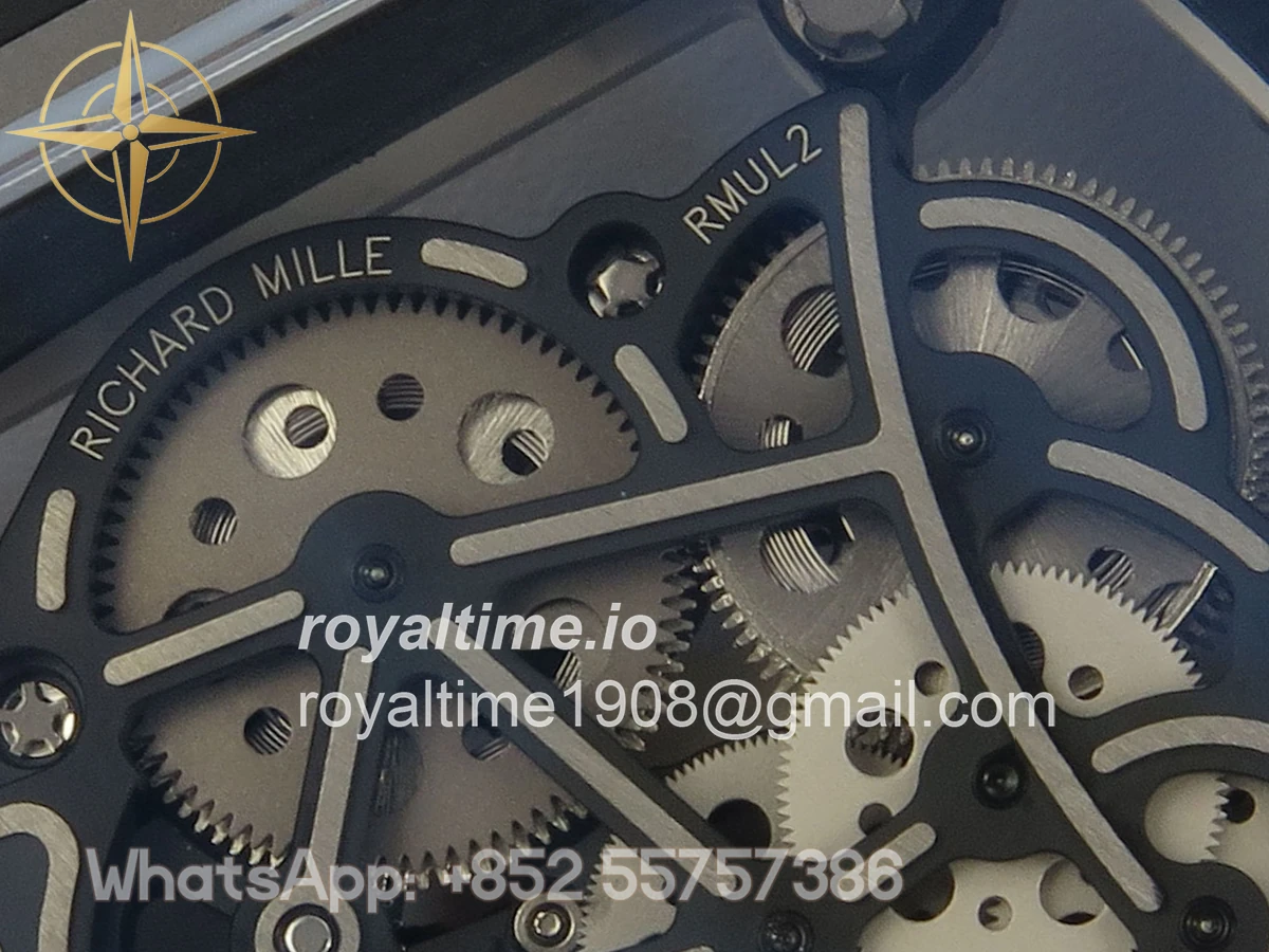 Size 43mm x 13.5mm Movement Free Sprung Vaucher RMUL2 skeleton movement, the best asian RM movement at the moment, same as genuine Functions Hours, minutes and seconds display Case Gray ceramic case Crystal Scratch-proof sapphire crystal with AR coating Dial Skeleton dial Bezel Gray ceramic bezel Strap Gray rubber strap Clasp Deployant clasp Water resistance >50 Meters Please be informed that this rating is merely a guide. We do do not advise submerging or immersing any replica watch in water unless you have had your watch water-proofed by a professional. We do not guarantee the product’s water-resistance and as such we do not refund, offer store credit, exchange or do a free repair on any watch that has water damage.