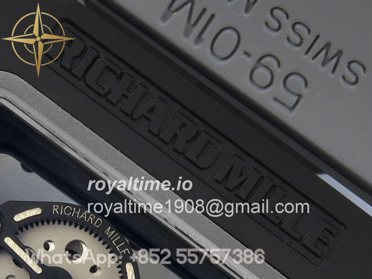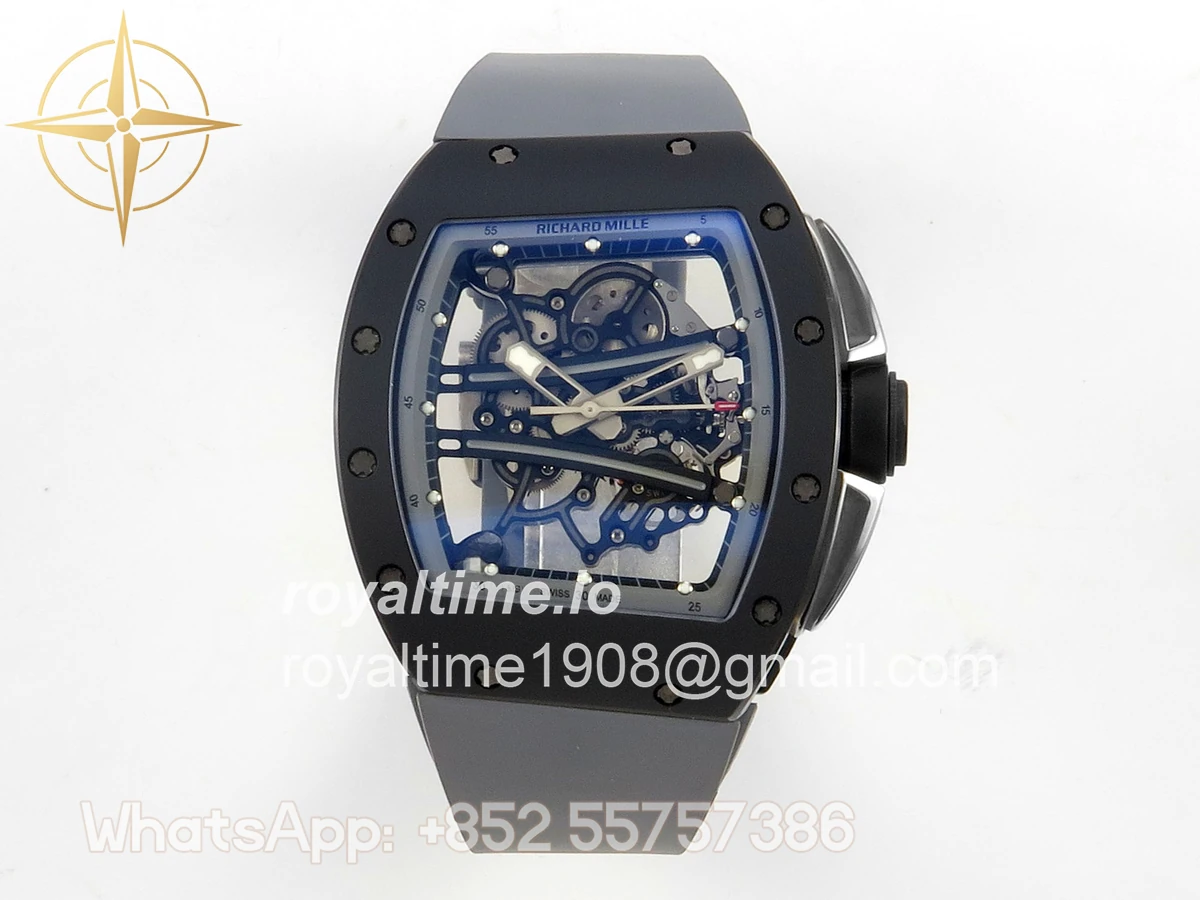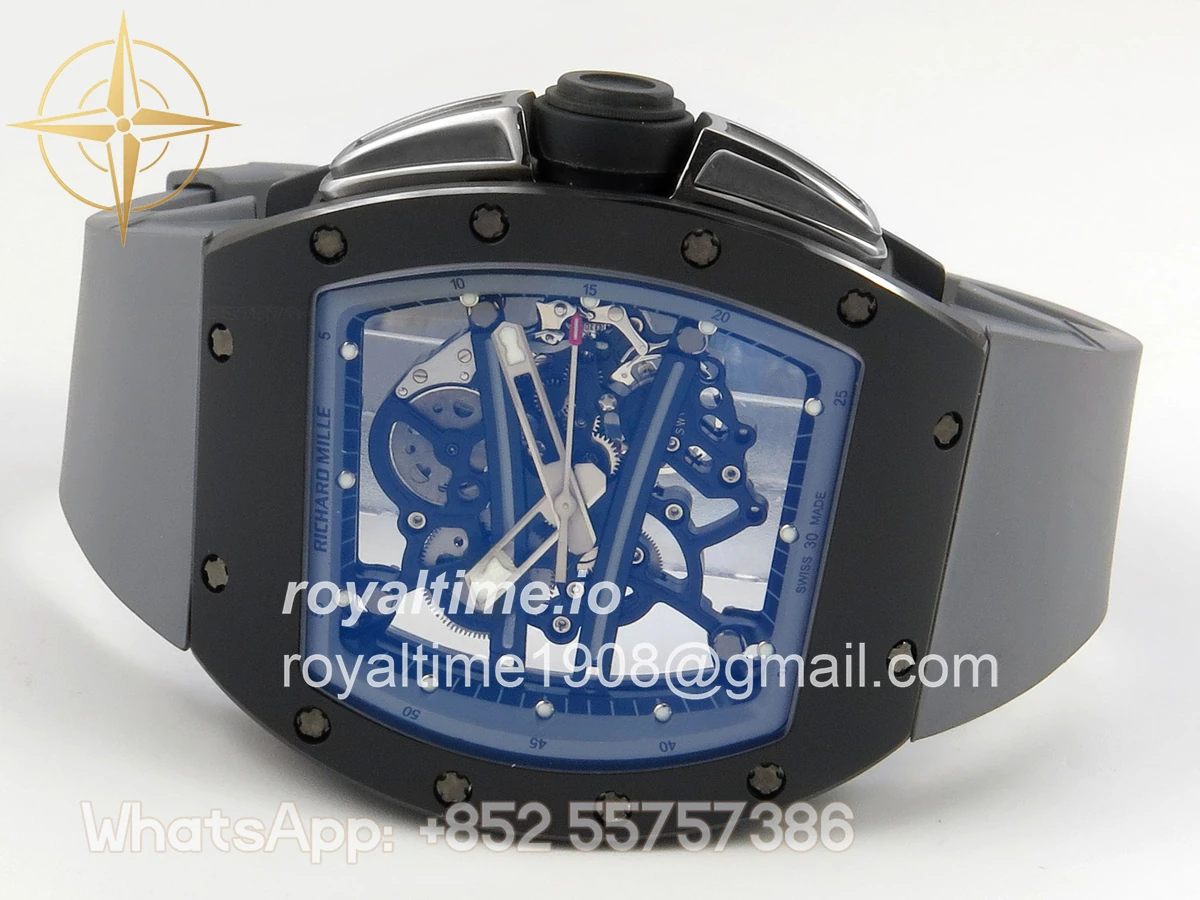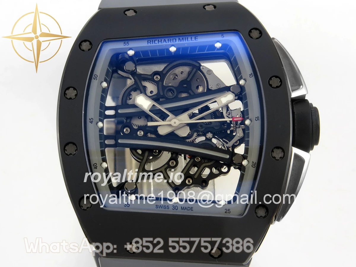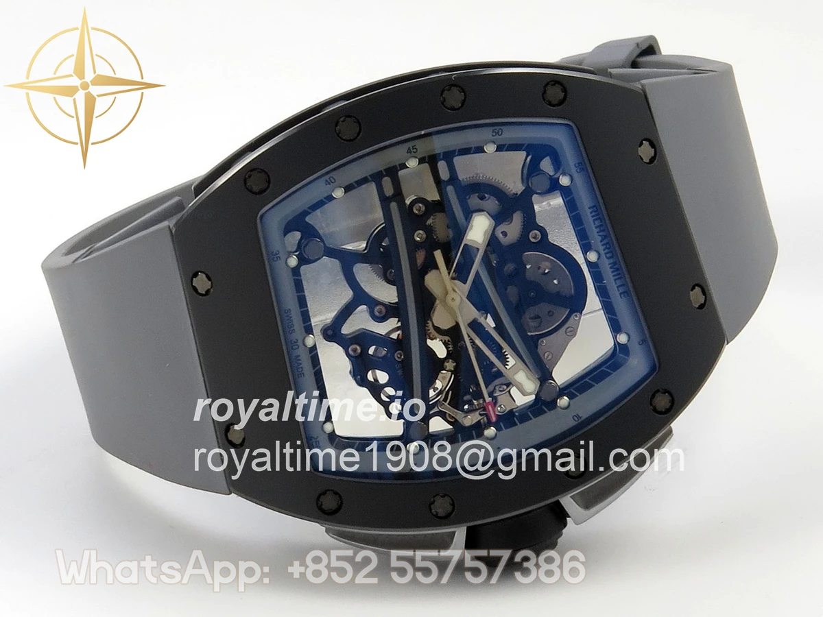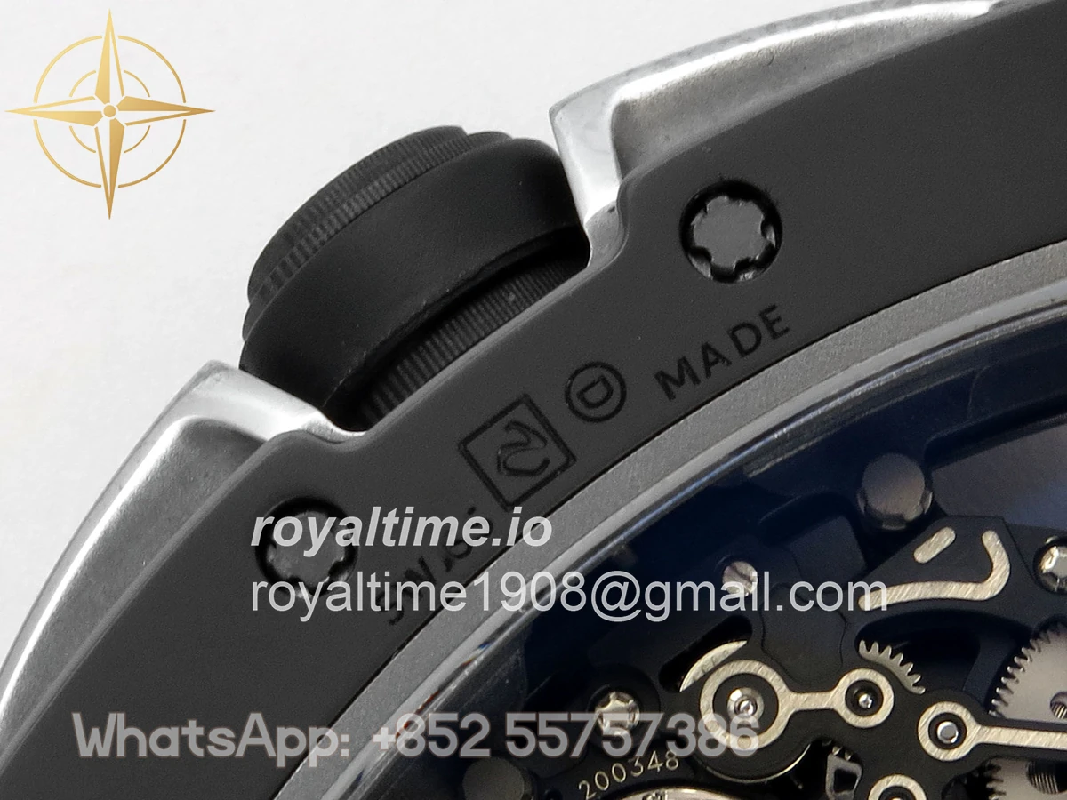 Size 43mm x 13.5mm Movement Free Sprung Vaucher RMUL2 skeleton movement, the best asian RM movement at the moment, same as genuine Functions Hours, minutes and seconds display Case Gray ceramic case Crystal Scratch-proof sapphire crystal with AR coating Dial Skeleton dial Bezel Gray ceramic bezel Strap Gray rubber strap Clasp Deployant clasp Water resistance >50 Meters Please be informed that this rating is merely a guide. We do do not advise submerging or immersing any replica watch in water unless you have had your watch water-proofed by a professional. We do not guarantee the product’s water-resistance and as such we do not refund, offer store credit, exchange or do a free repair on any watch that has water damage.