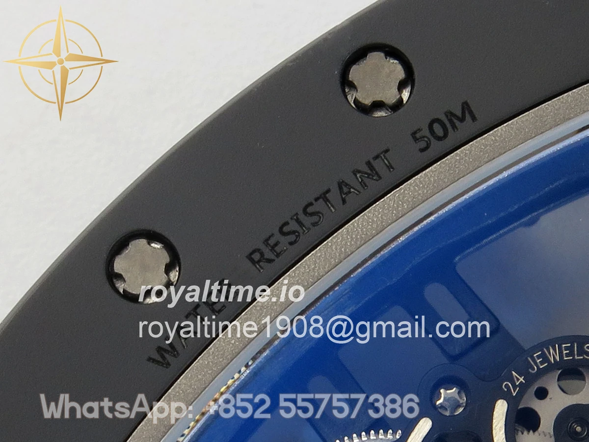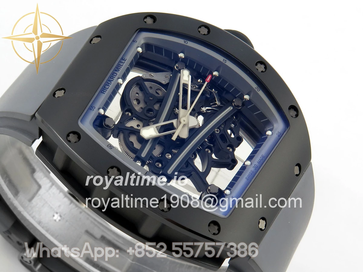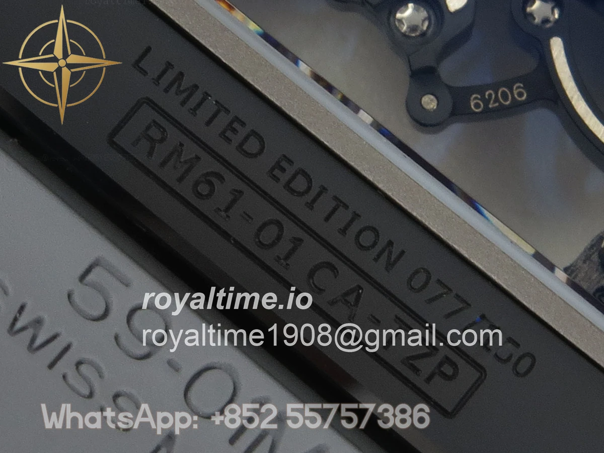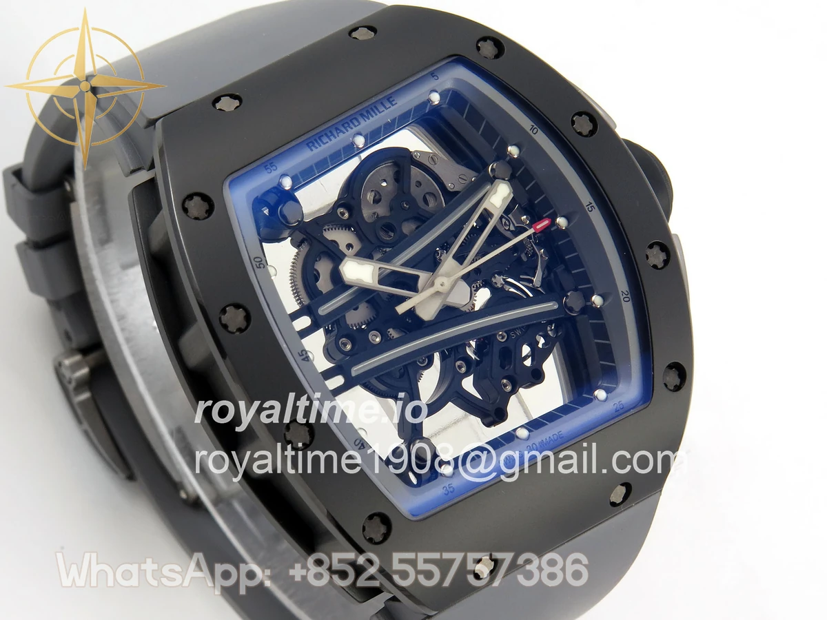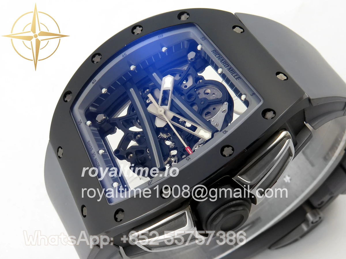 Size 43mm x 13.5mm Movement Free Sprung Vaucher RMUL2 skeleton movement, the best asian RM movement at the moment, same as genuine Functions Hours, minutes and seconds display Case Gray ceramic case Crystal Scratch-proof sapphire crystal with AR coating Dial Skeleton dial Bezel Gray ceramic bezel Strap Gray rubber strap Clasp Deployant clasp Water resistance >50 Meters Please be informed that this rating is merely a guide. We do do not advise submerging or immersing any replica watch in water unless you have had your watch water-proofed by a professional. We do not guarantee the product’s water-resistance and as such we do not refund, offer store credit, exchange or do a free repair on any watch that has water damage.