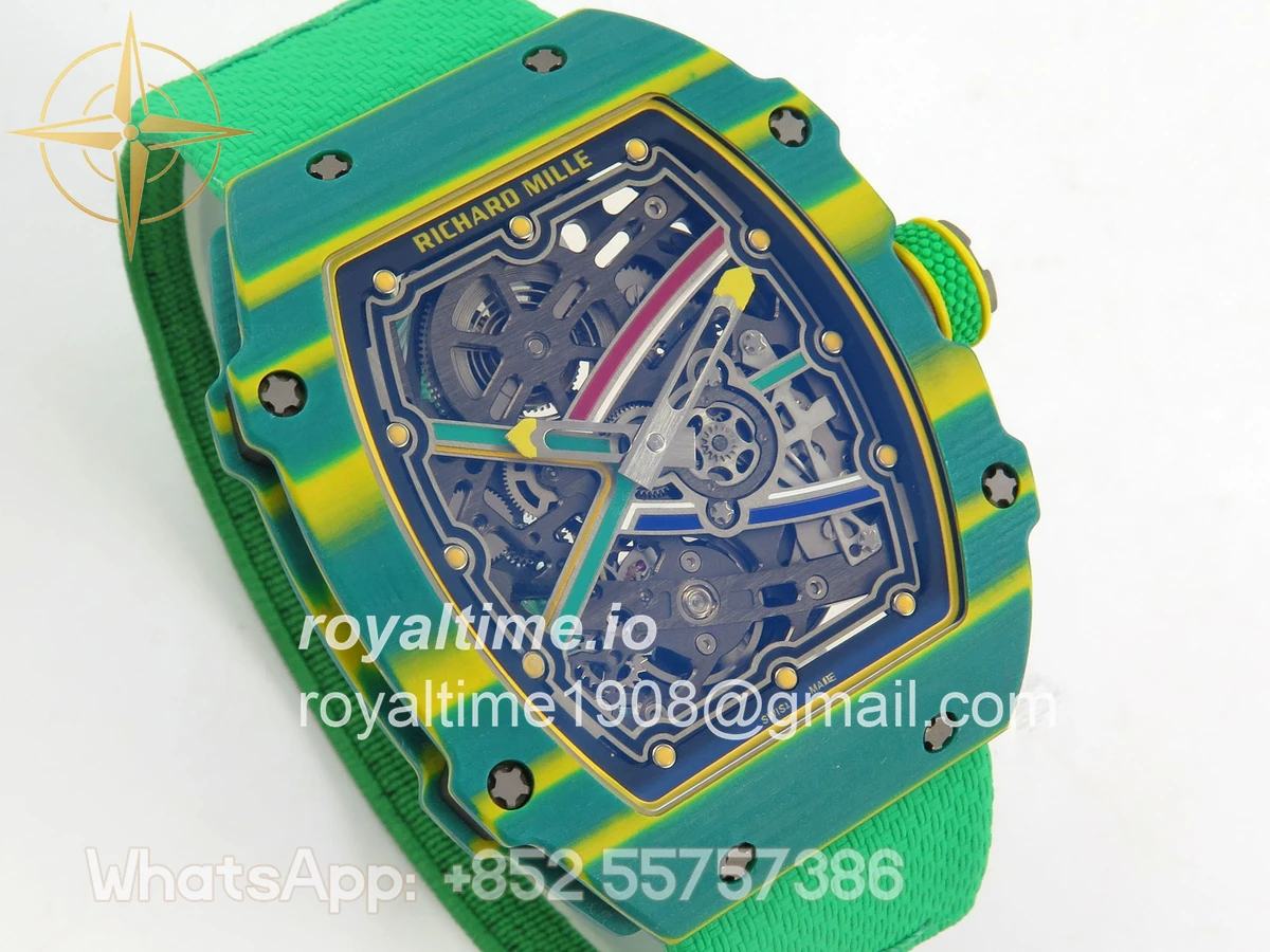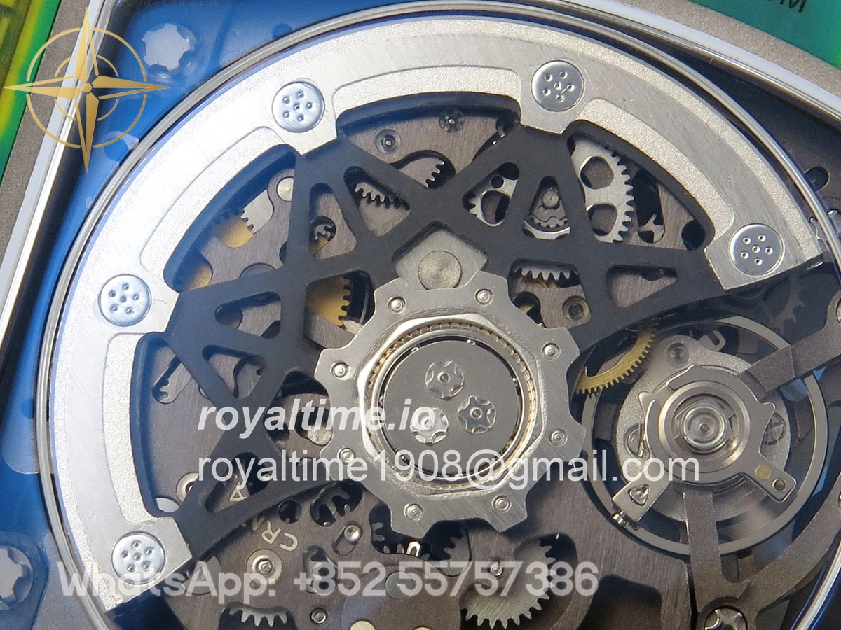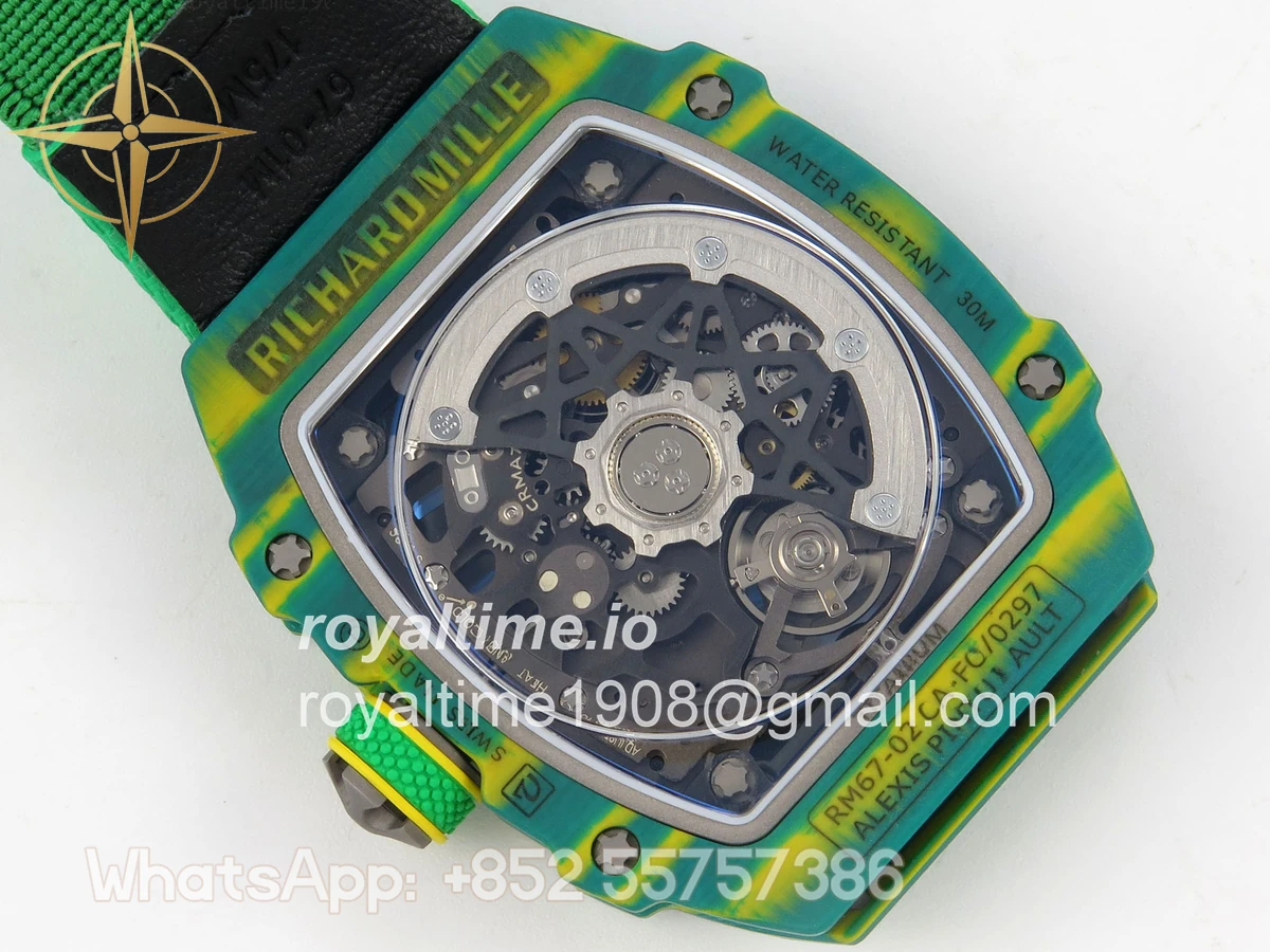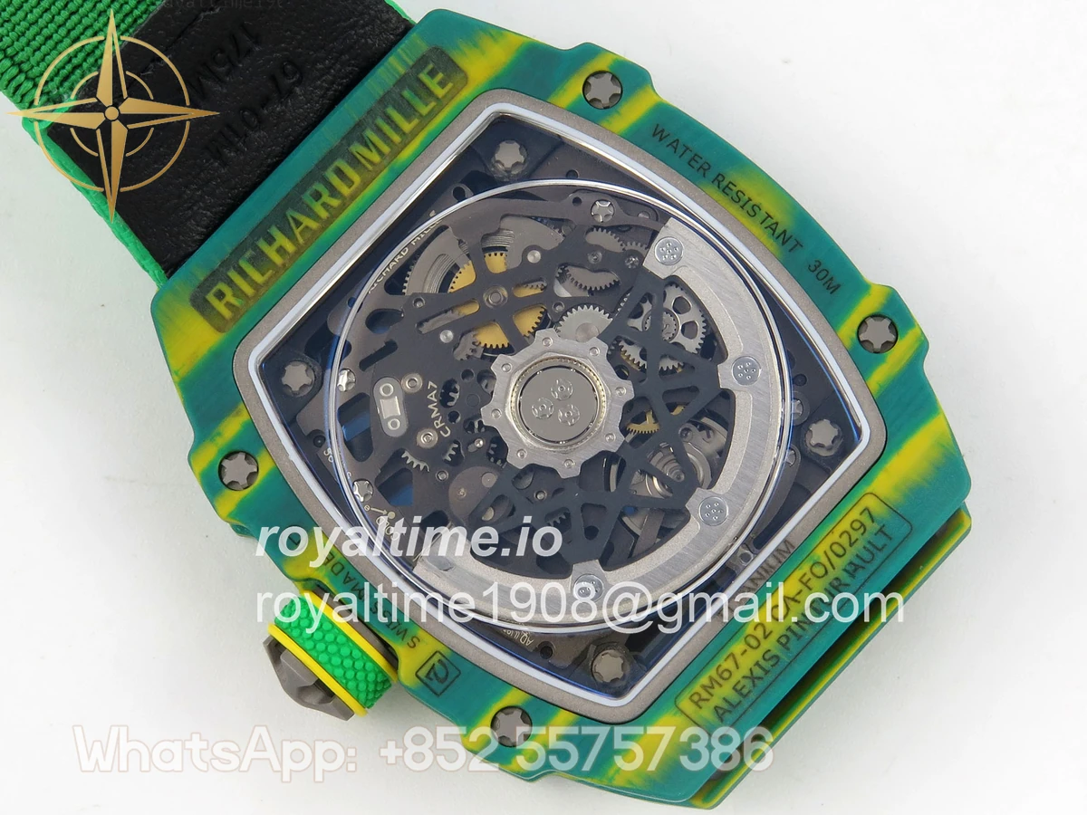 Size 39mm x 7.8mm (same size as genuine) Movement Asian modified clone CRMA7 skeleton movement Functions Hours and minutes display Case Green NTPT case with unique pattern Crystal Arc scratch-proof sapphire crystal with AR coating Dial Skeleton dial Strap Green Elastic strap Clasp Deployant clasp Water resistance >50 Meters Please be informed that this rating is merely a guide. We do do not advise submerging or immersing any replica watch in water unless you have had your watch water-proofed by a professional. We do not guarantee the product’s water-resistance and as such we do not refund, offer store credit, exchange or do a free repair on any watch that has water damage.