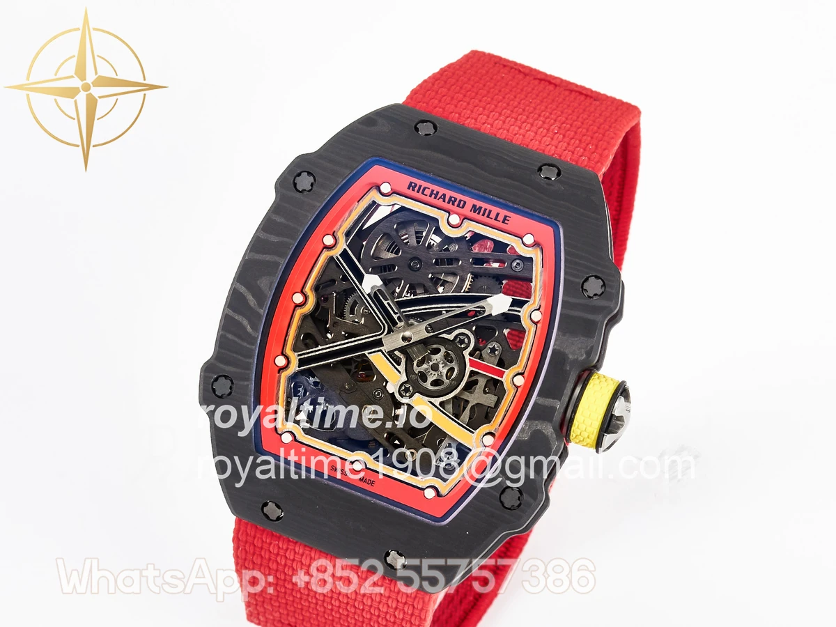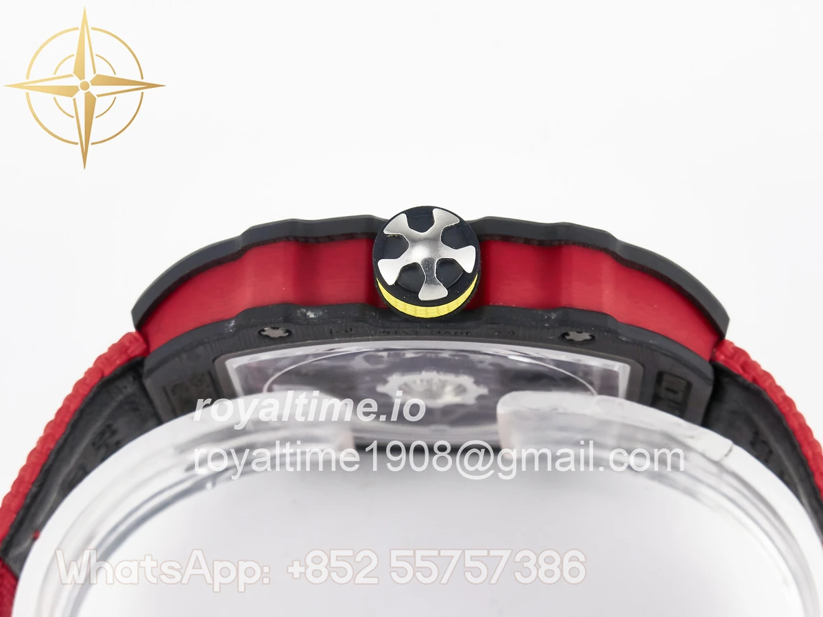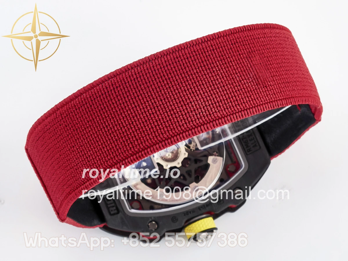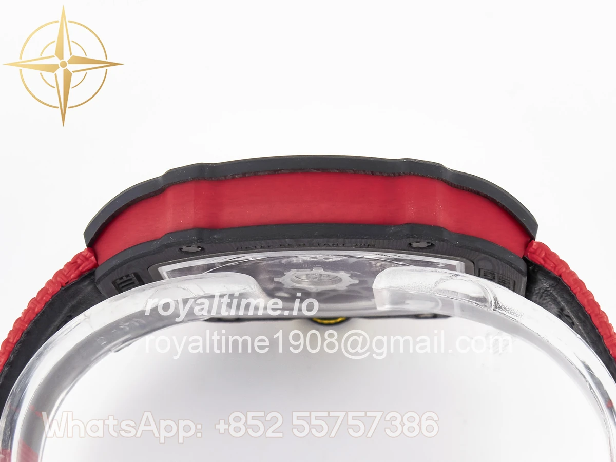Size 39mm x 9mm Movement Asian modified clone CRMA7 skeleton movement Functions Hours and minutes display Case Black NTPT case Crystal Scratch-proof sapphire crystal with AR coating Dial Skeleton dial Strap Red nylon strap Water resistance >50 Meters