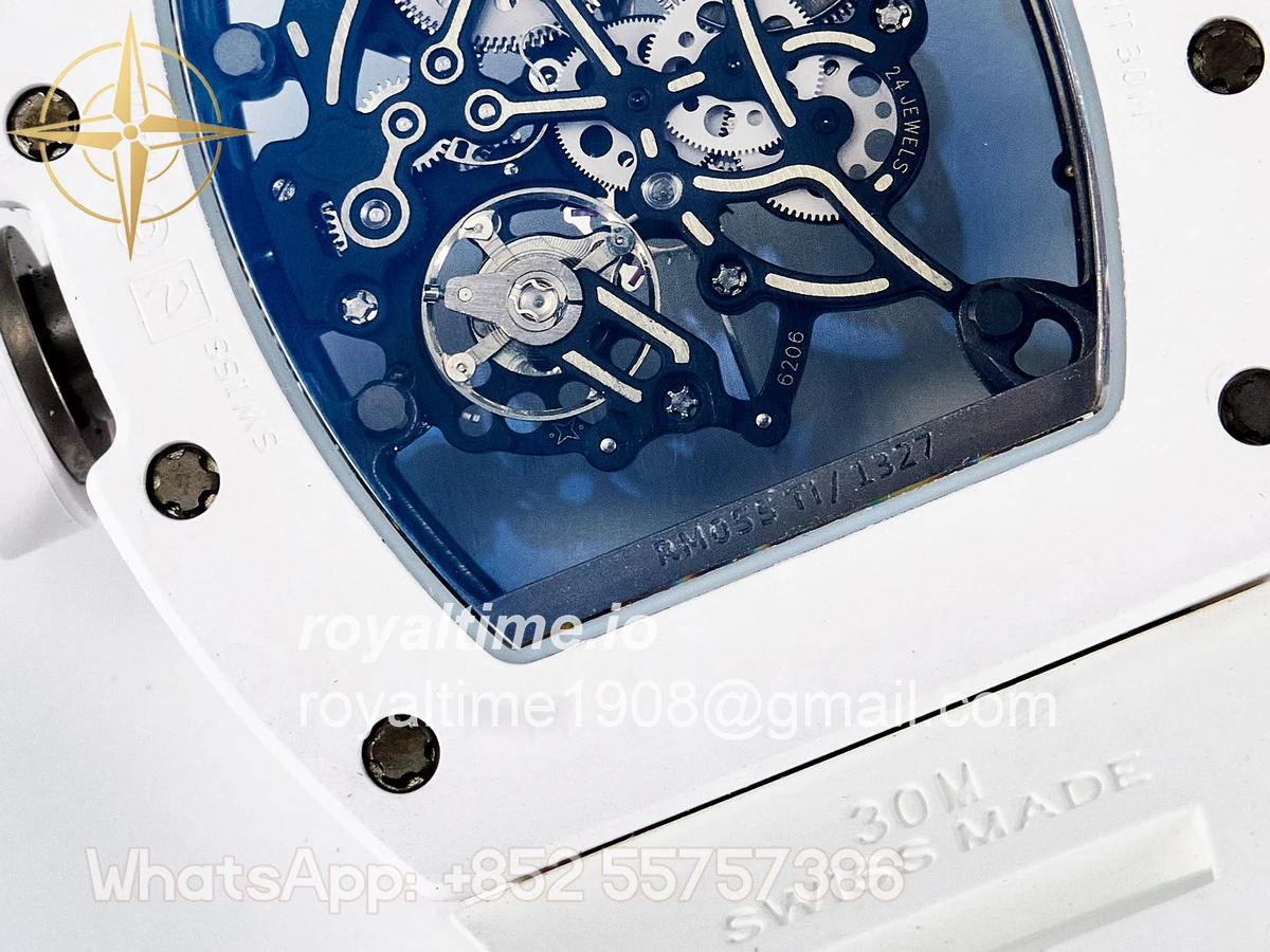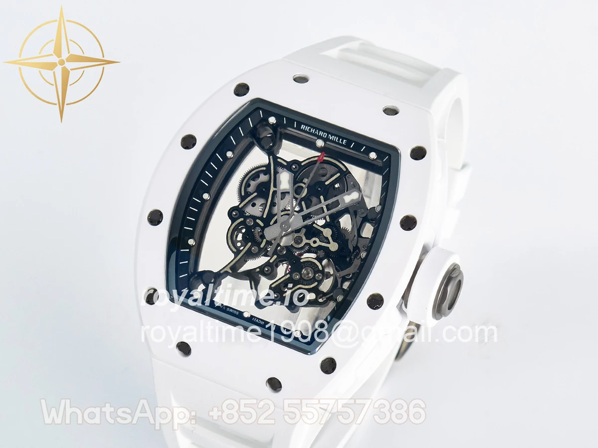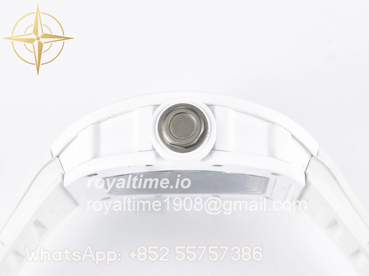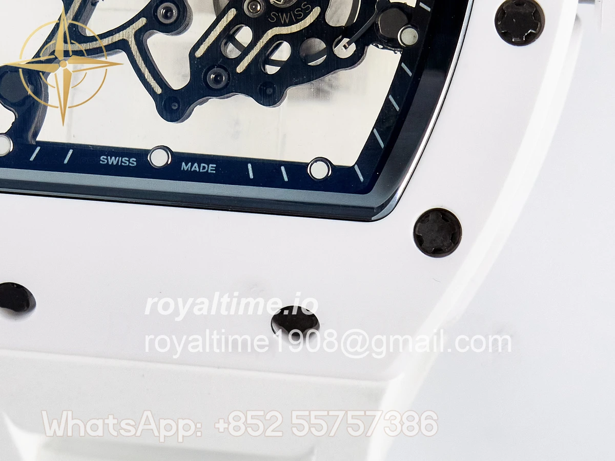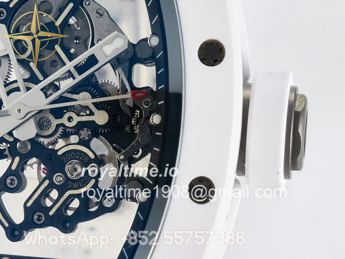 Size 43mm x 13.5mm Movement Based Genuine Vaucher Manufacture Fleurier movement custom modded to RM055 Free spring counter balance movement Functions Hours, minutes and seconds display Case White ceramic case , case crown and caseback, The screws are interchangeable with genuine watch part. Crystal Super clear scratch-proof sapphire crystal same shape and size as genuine watch, can be replaced with genuine watch parts. Dial Skeleton dial Bezel White ceramic bezel Strap High quality white rubber strap, same quality as genuine strap, interchangeable with genuine watch strap Clasp High quality deployment clasp, same as genuine clasp Water resistance >50 Meters