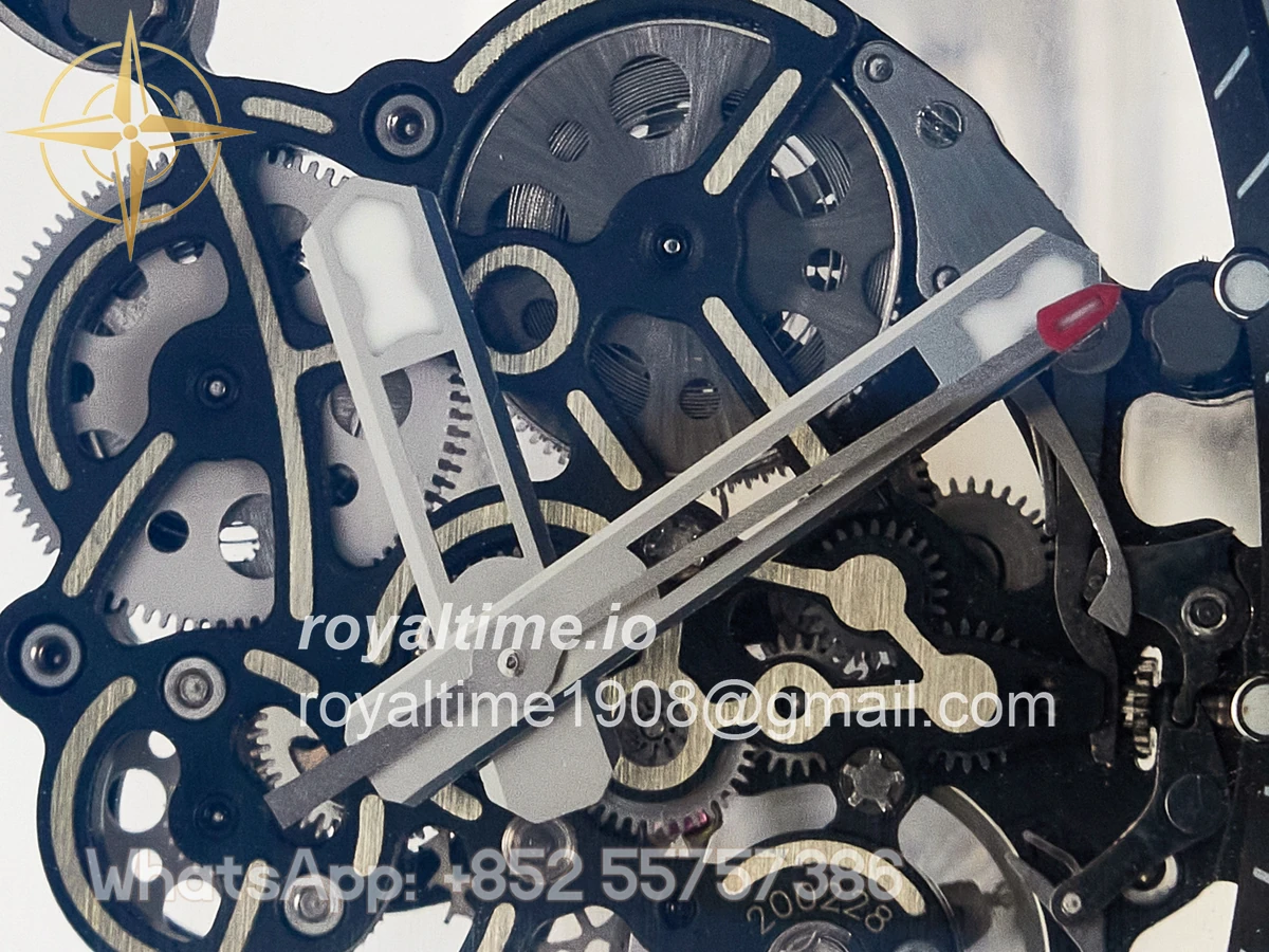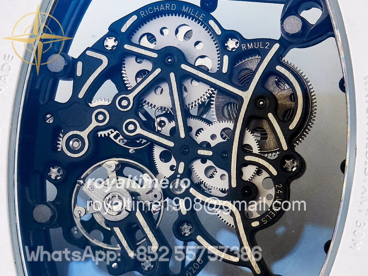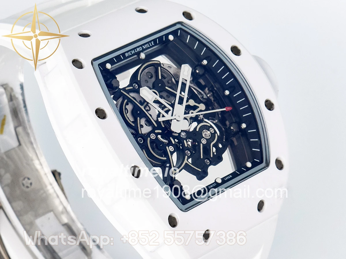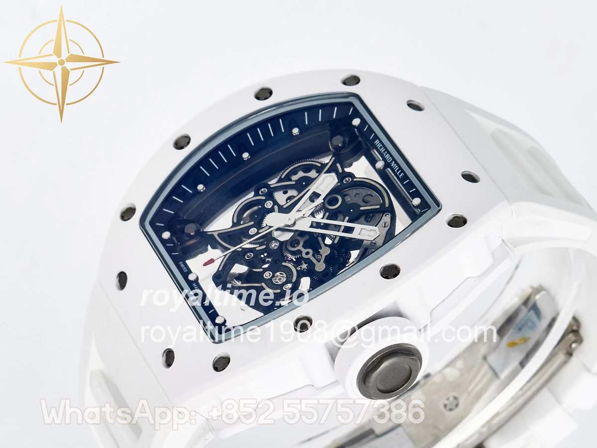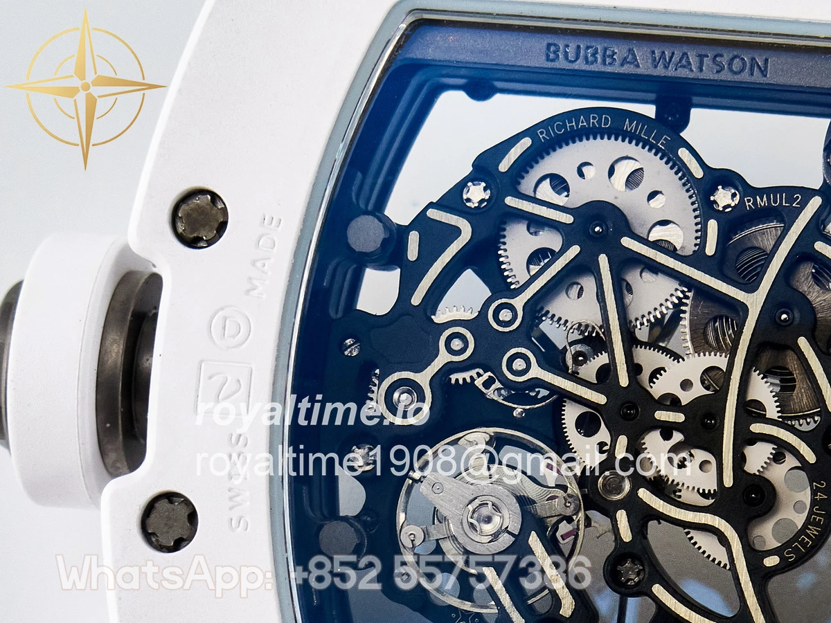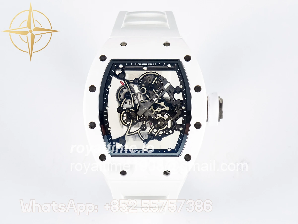 Size 43mm x 13.5mm Movement Based Genuine Vaucher Manufacture Fleurier movement custom modded to RM055 Free spring counter balance movement Functions Hours, minutes and seconds display Case White ceramic case , case crown and caseback, The screws are interchangeable with genuine watch part. Crystal Super clear scratch-proof sapphire crystal same shape and size as genuine watch, can be replaced with genuine watch parts. Dial Skeleton dial Bezel White ceramic bezel Strap High quality white rubber strap, same quality as genuine strap, interchangeable with genuine watch strap Clasp High quality deployment clasp, same as genuine clasp Water resistance >50 Meters