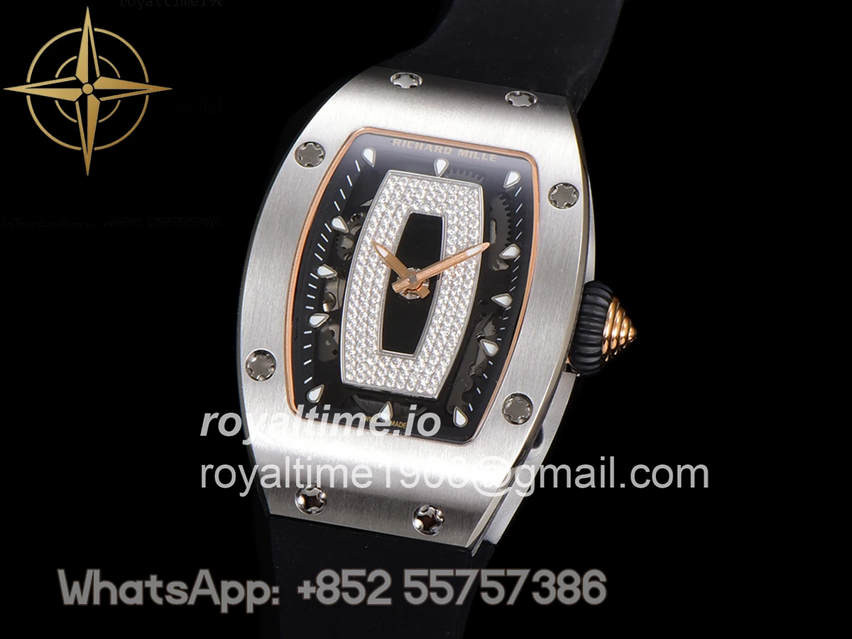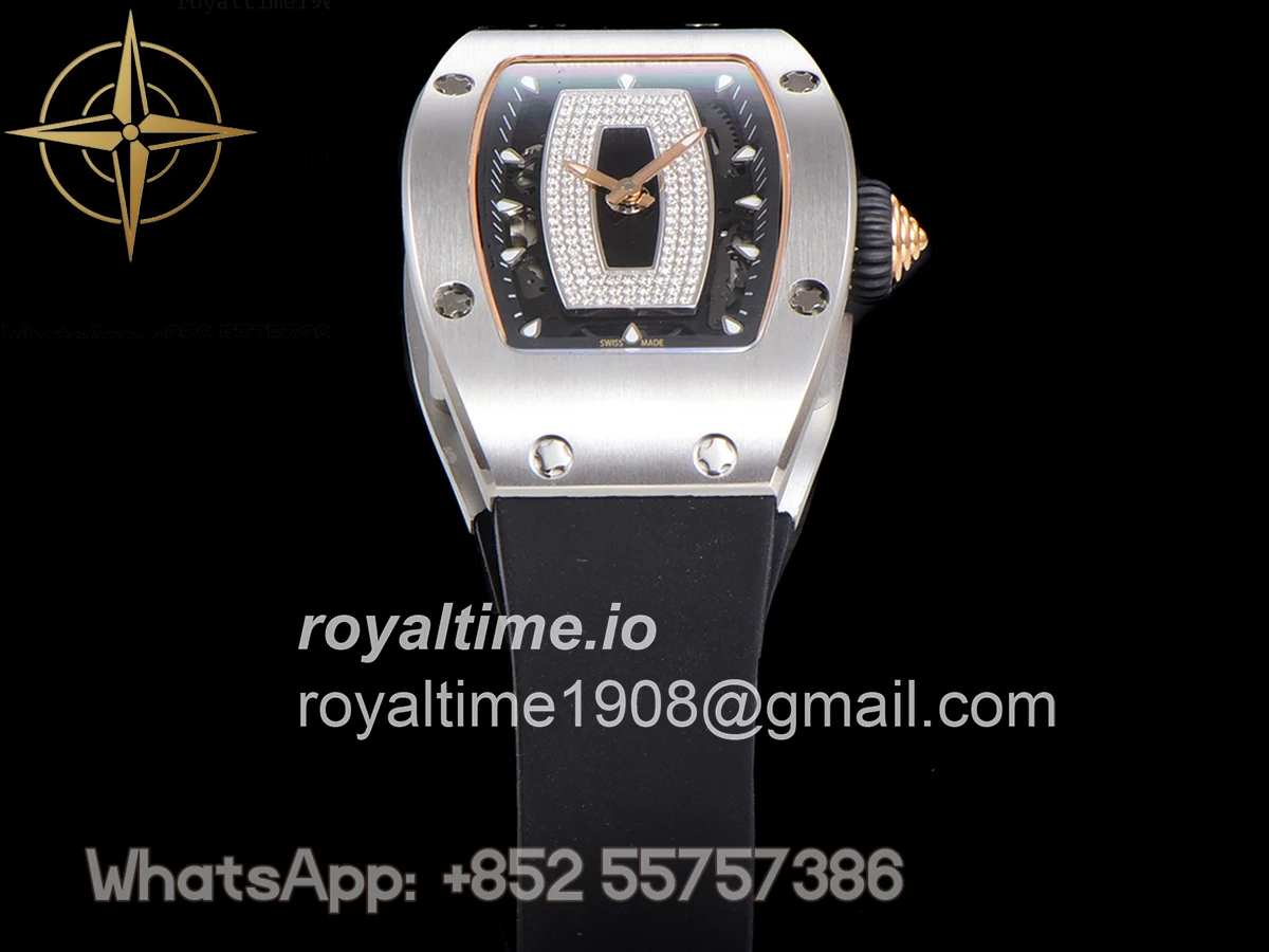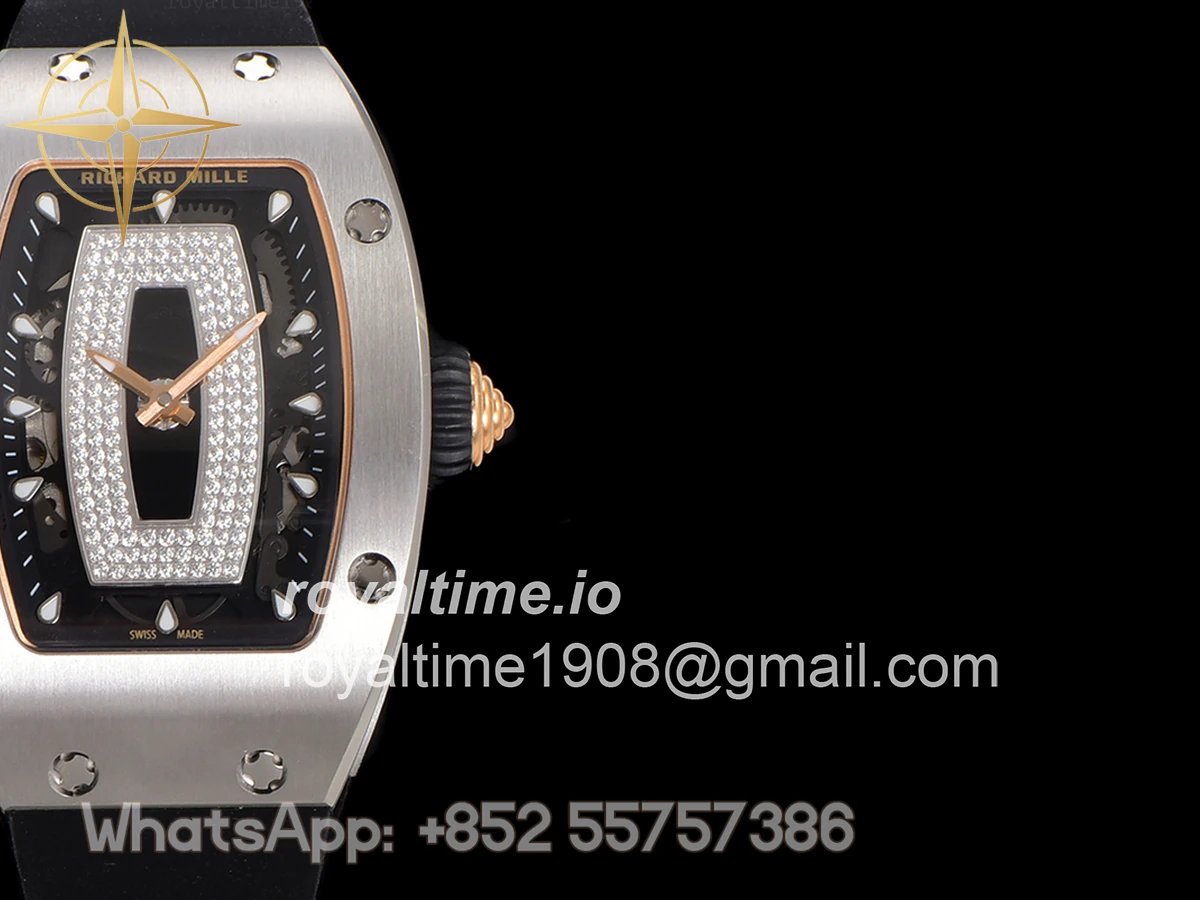 Size: 44mm x 31mm x 15mm Movement: Japanese Automatic Self-winding movement at 28800vph Functions: Hours and minutes display Case: Solid 316L stainless steel case Crystal: Scratch-proof sapphire crystal Dial: Diamond encrusted dial Bezel: Solid 316L stainless steel bezel Strap: Black rubber strap Clasp: Deployant clasp Water resistance: <20 Meters