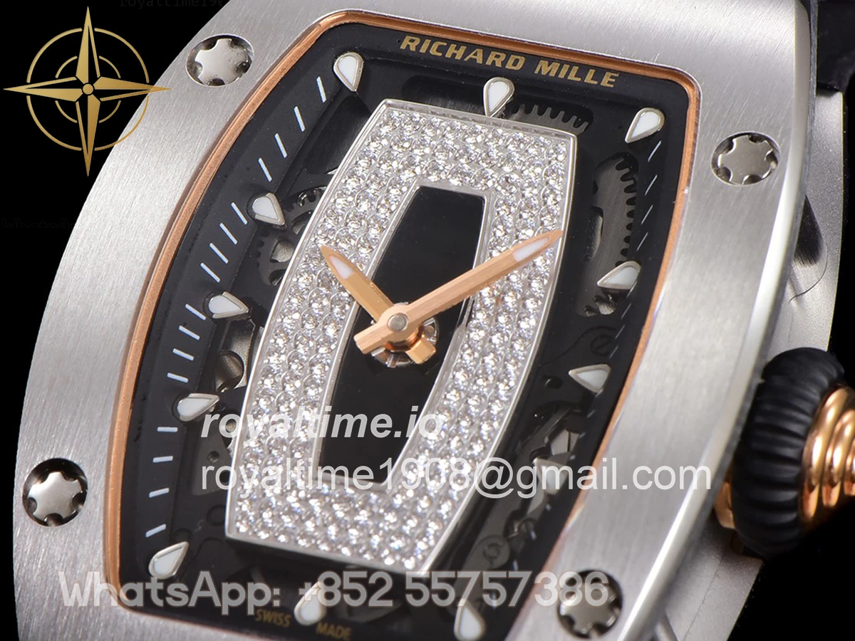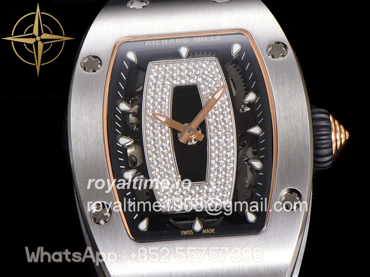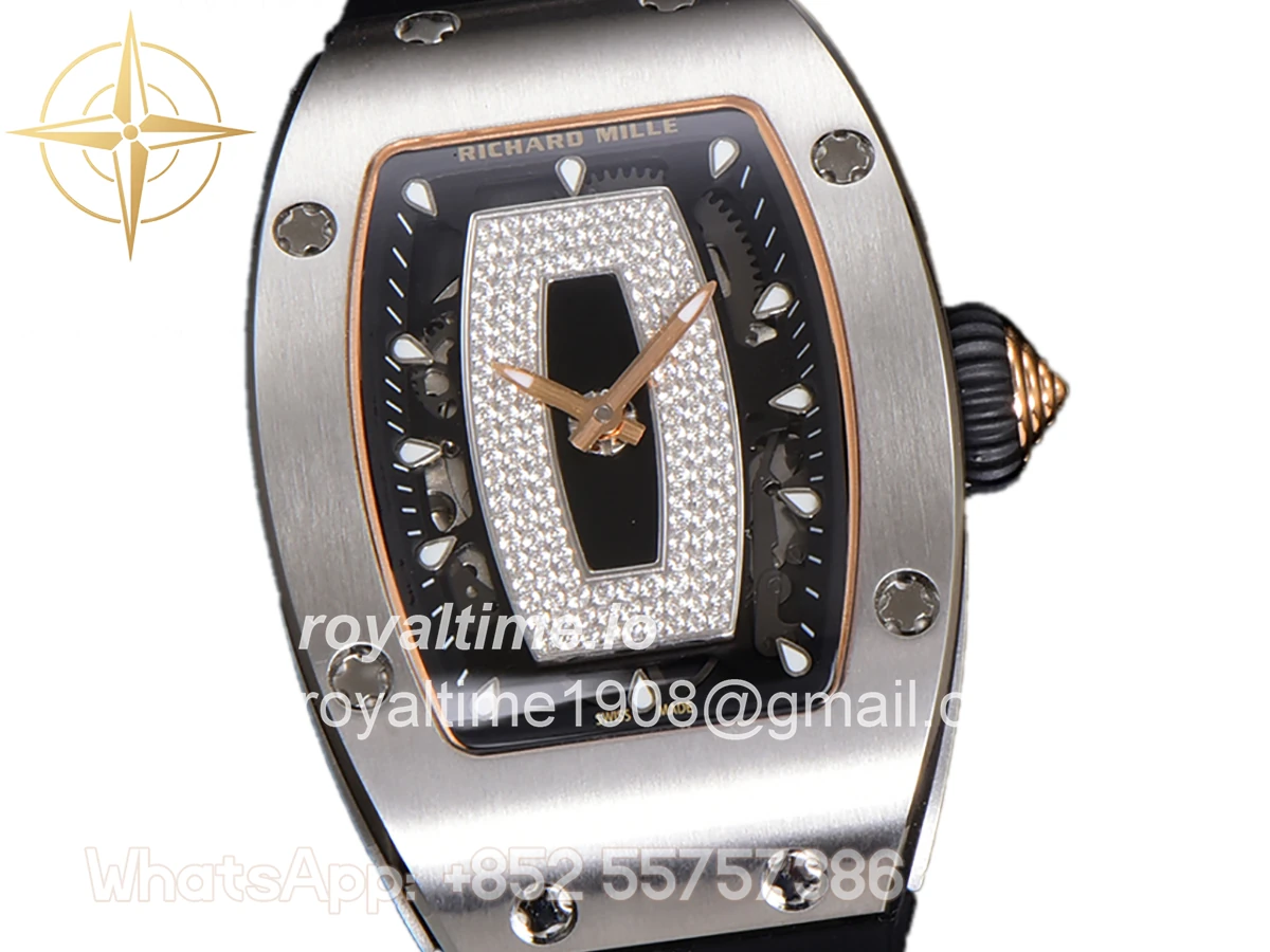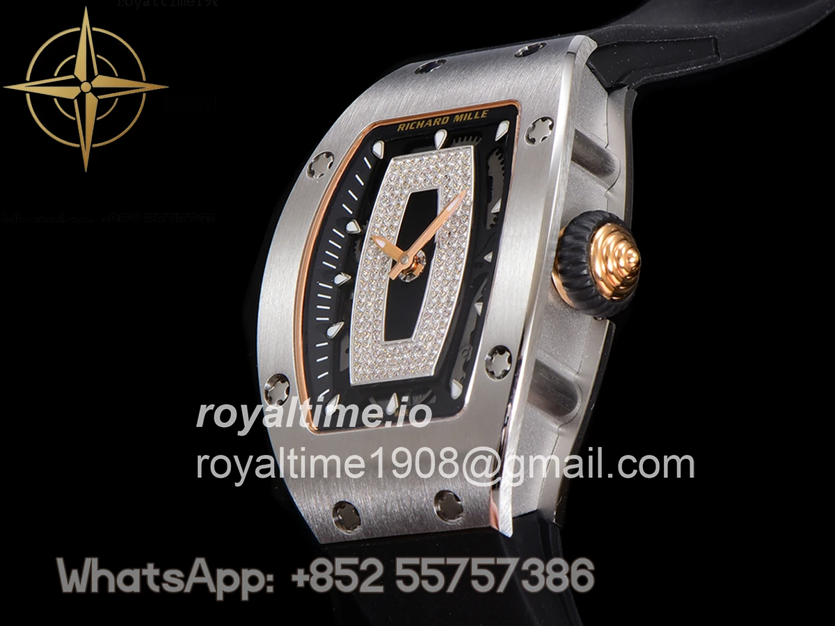 Size: 44mm x 31mm x 15mm Movement: Japanese Automatic Self-winding movement at 28800vph Functions: Hours and minutes display Case: Solid 316L stainless steel case Crystal: Scratch-proof sapphire crystal Dial: Diamond encrusted dial Bezel: Solid 316L stainless steel bezel Strap: Black rubber strap Clasp: Deployant clasp Water resistance: <20 Meters