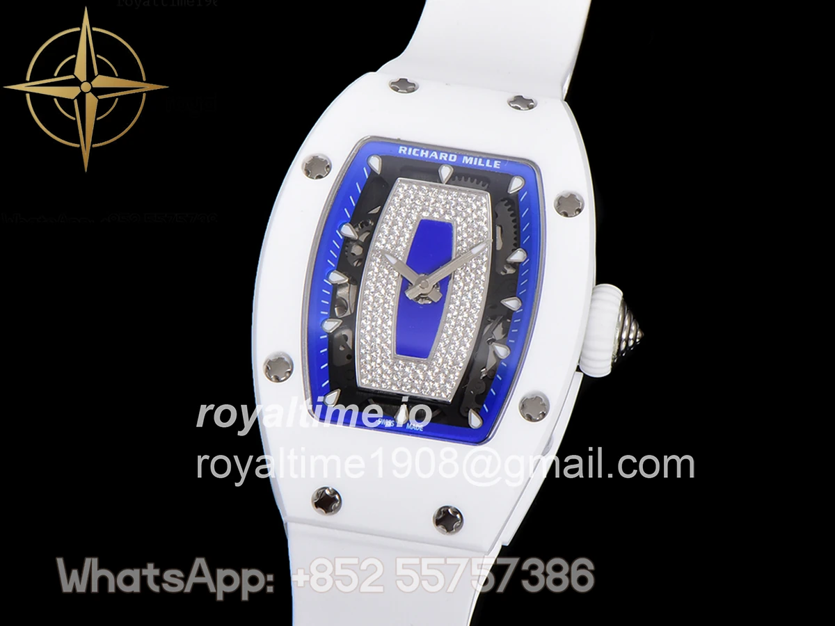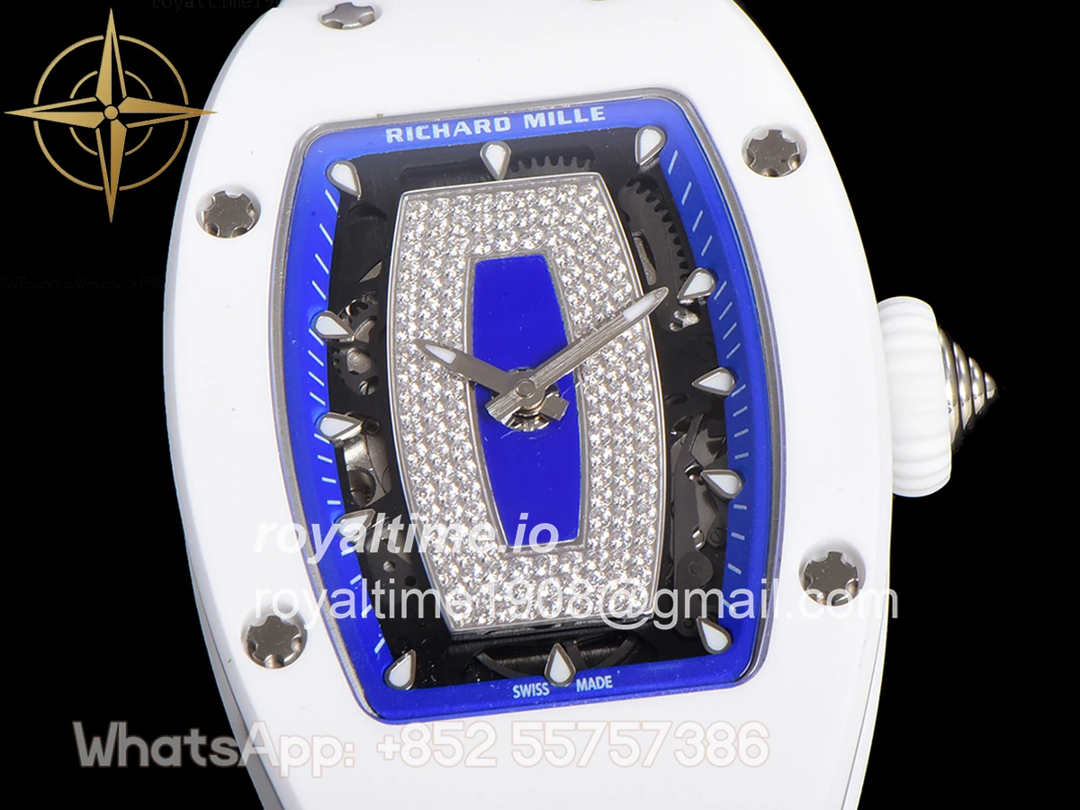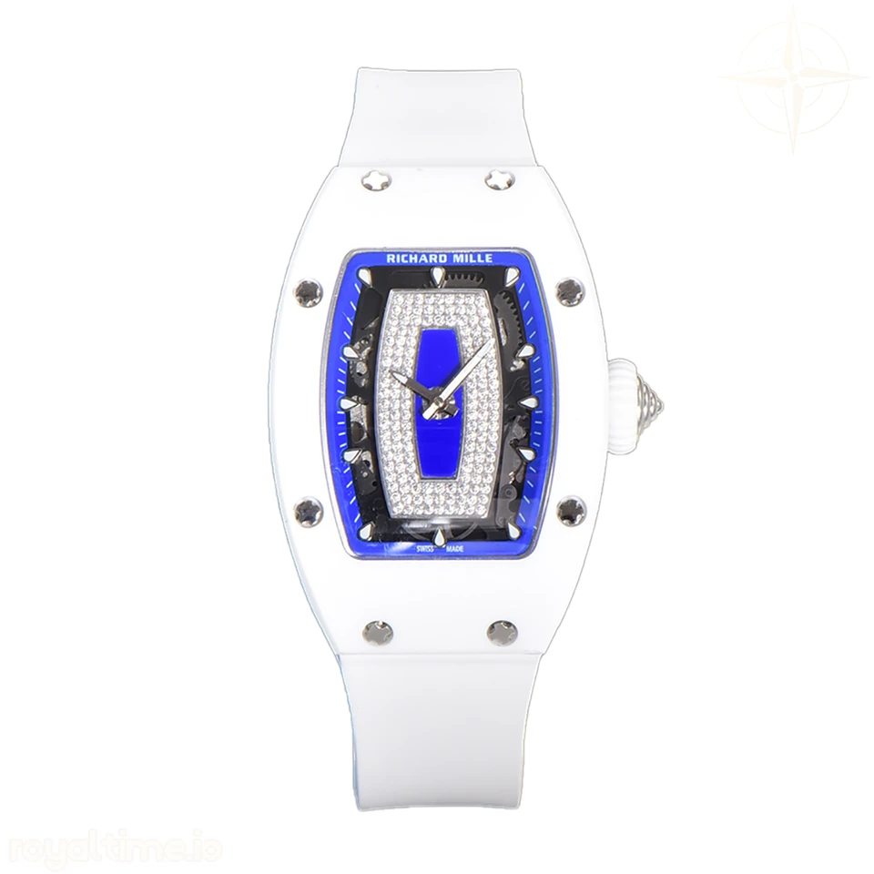 Size: 44mm x 31mm x 15mm Movement: Japanese Automatic Self-winding movement at 28800vph Functions: Hours and minutes display Case: Solid 316L stainless steel case Crystal: Scratch-proof sapphire crystal Dial: Diamond encrusted dial Bezel: Ceramic bezel Strap: White rubber strap Clasp: Deployant clasp Water resistance: <20 Meters
