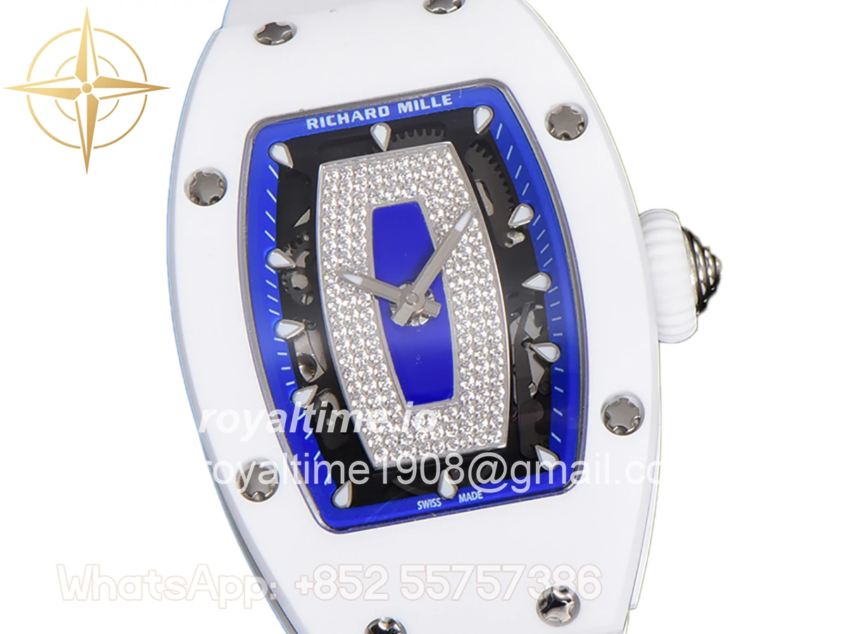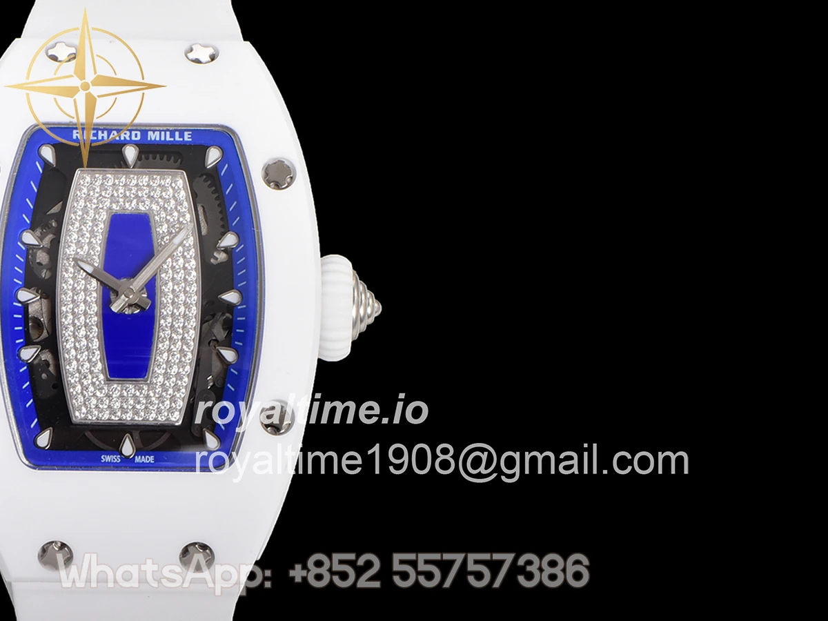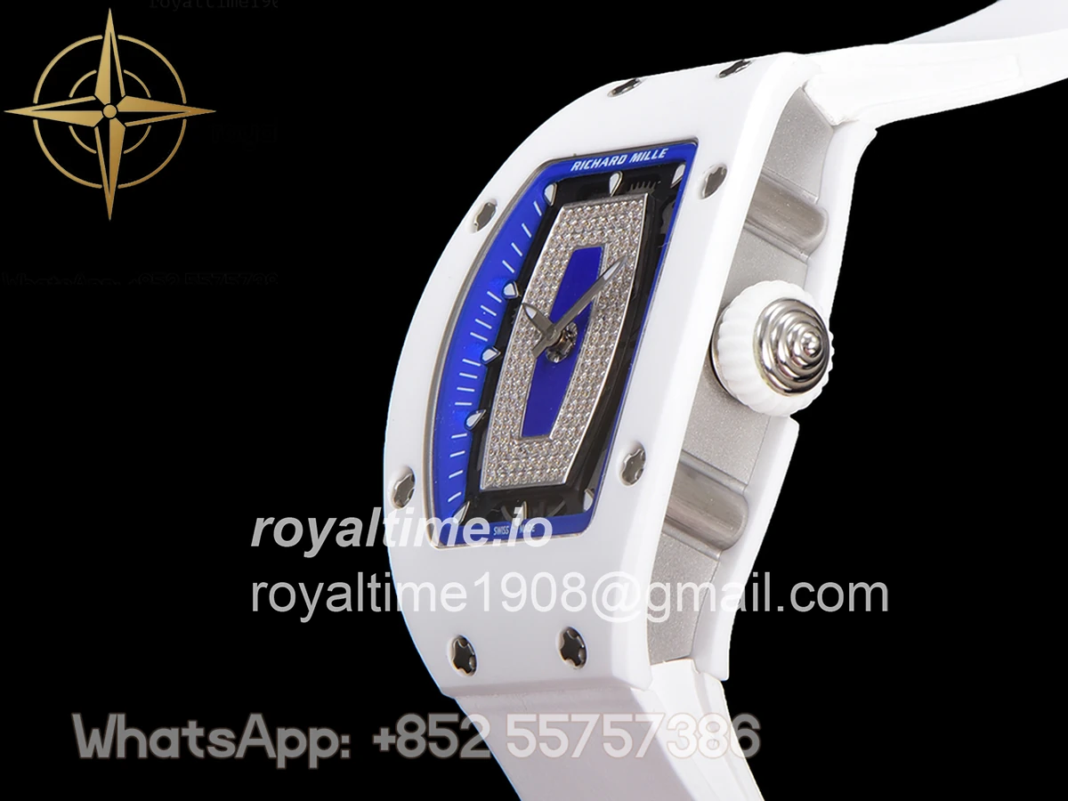 Size: 44mm x 31mm x 15mm Movement: Japanese Automatic Self-winding movement at 28800vph Functions: Hours and minutes display Case: Solid 316L stainless steel case Crystal: Scratch-proof sapphire crystal Dial: Diamond encrusted dial Bezel: Ceramic bezel Strap: White rubber strap Clasp: Deployant clasp Water resistance: <20 Meters