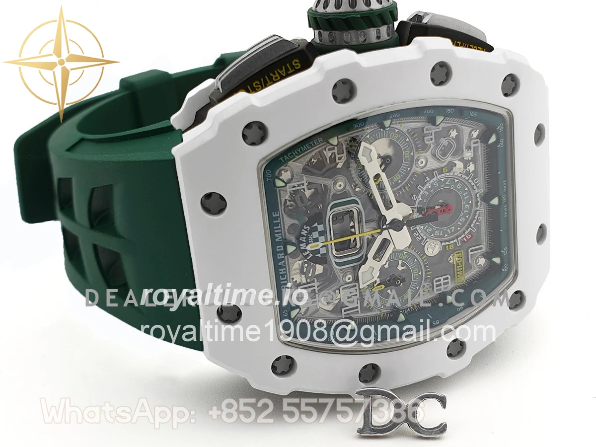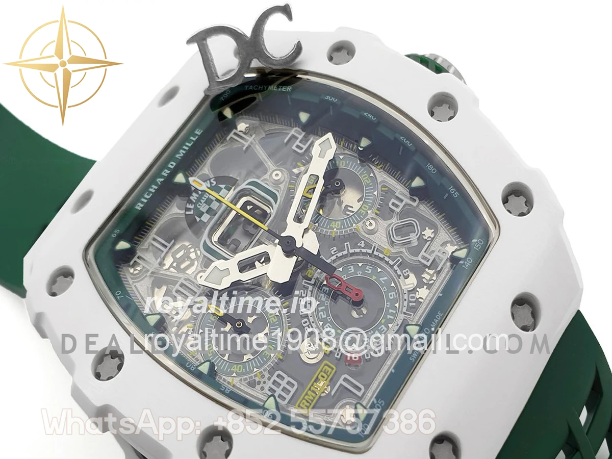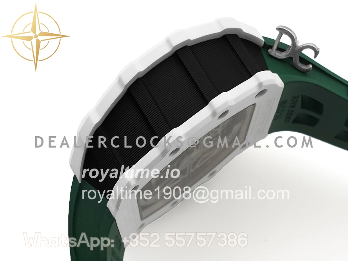 -Premium Construction- Latest release of a highly detailed replication of the Richard Mille RM 011 Le Mans Classic Chronograph in Green on White Rubber Strap limited edition. Size: 50.5mm x 41mm x 18mm Movement: Modified 7750 chronograph automatic movement with skeletionized date Functions: Hours, minutes, sub-seconds, date and chronograph Case: Ceramic front and rear bezels Crystal: Scratch-proof sapphire crystal Dial: Skeleton dial Bezel: White ceramic Strap: Green rubber strap Clasp: Titanium deployant clasp Water resistance: >30 Meters