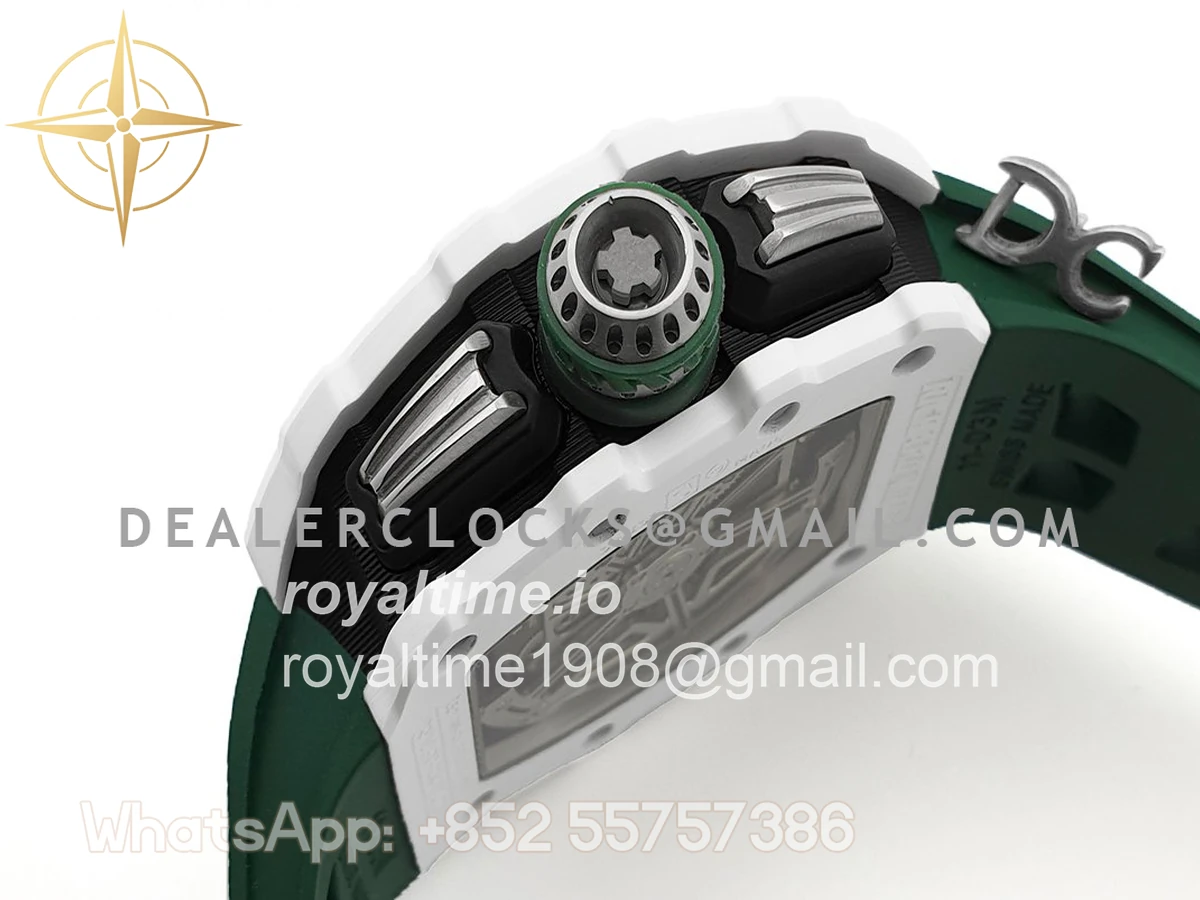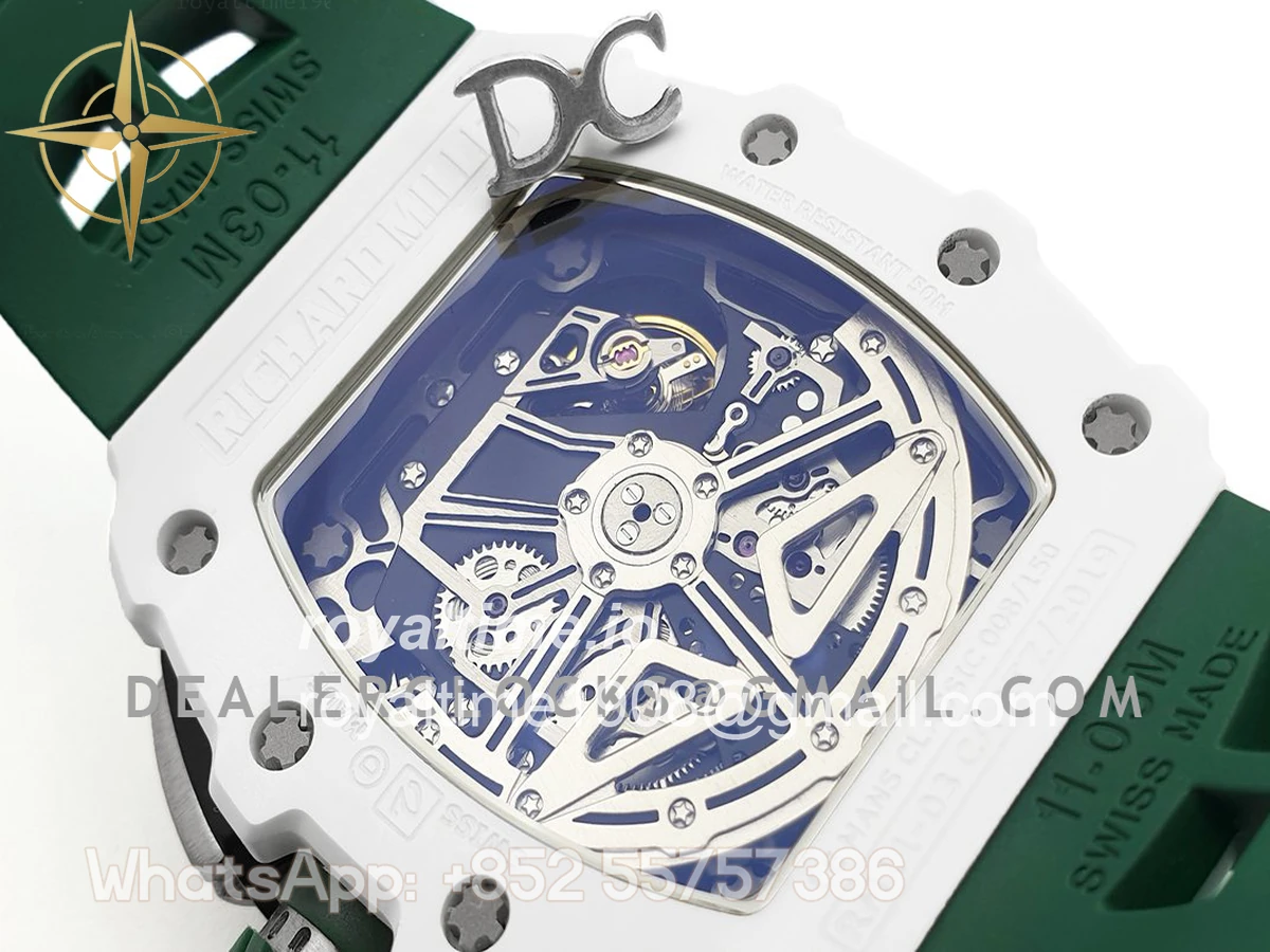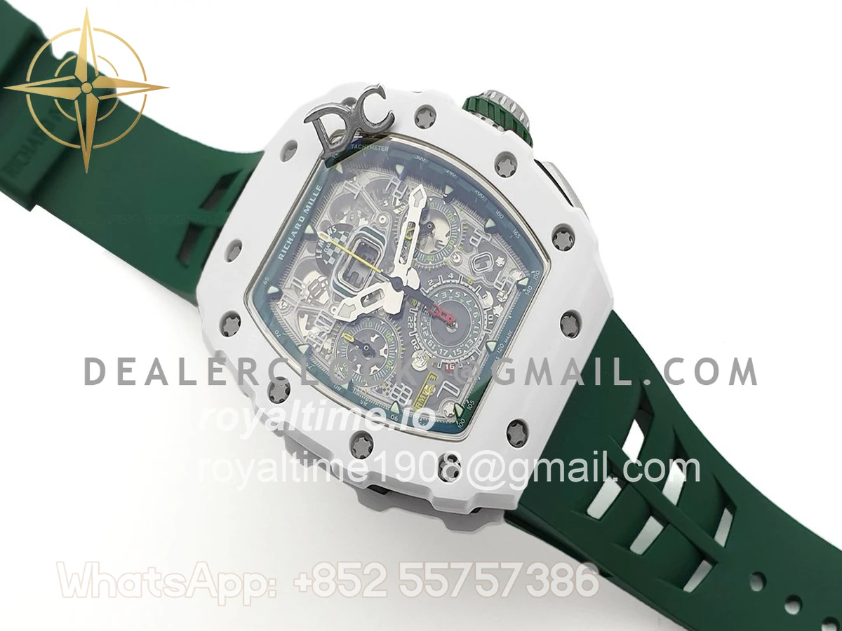 -Premium Construction- Latest release of a highly detailed replication of the Richard Mille RM 011 Le Mans Classic Chronograph in Green on White Rubber Strap limited edition. Size: 50.5mm x 41mm x 18mm Movement: Modified 7750 chronograph automatic movement with skeletionized date Functions: Hours, minutes, sub-seconds, date and chronograph Case: Ceramic front and rear bezels Crystal: Scratch-proof sapphire crystal Dial: Skeleton dial Bezel: White ceramic Strap: Green rubber strap Clasp: Titanium deployant clasp Water resistance: >30 Meters