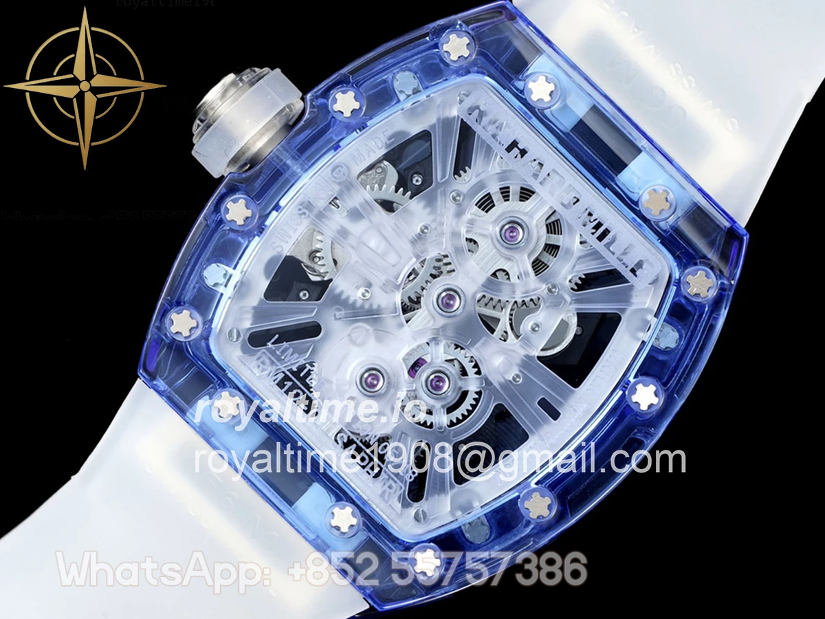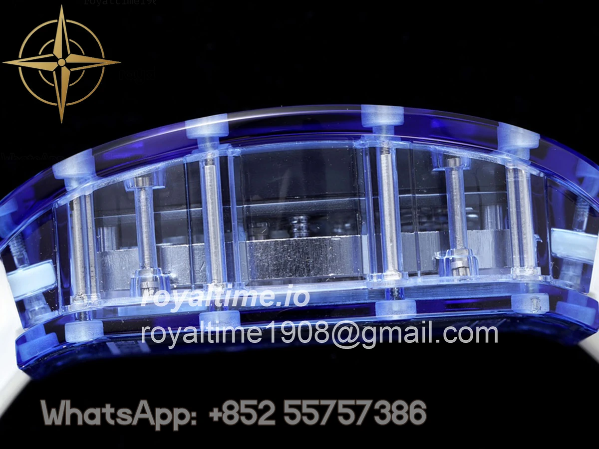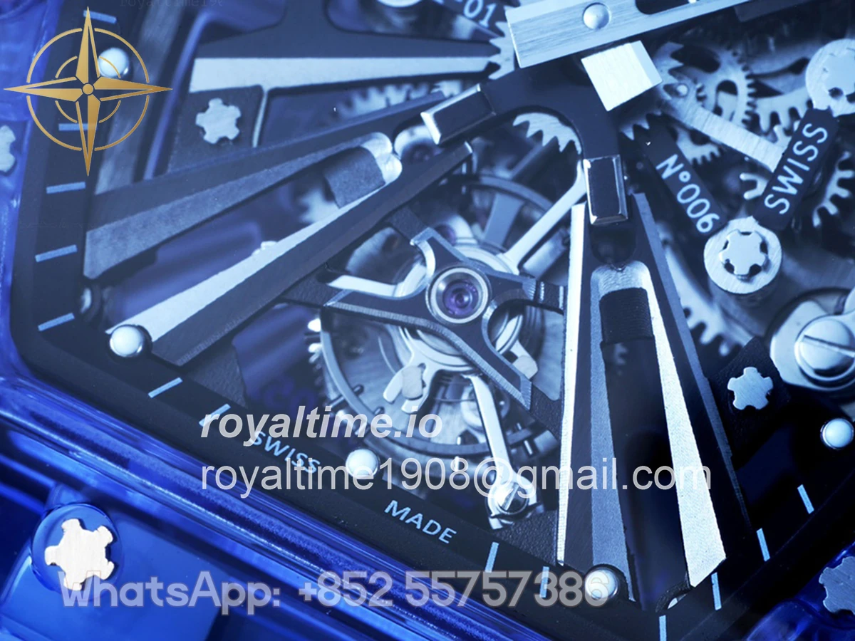 Size: 49mm x 43mm x 16mm Movement: Asian hand winding tourbillon movement Functions: Hours and minutes display Case: Transparent Composite Material Case (Factory claimed made with Sapphire) Crystal: Scratch-proof sapphire crystal Dial: Skeleton dial Bezel: Blue transparent bezel Strap: Transparent rubber strap with deployant clasp Water resistance: <20 meters
