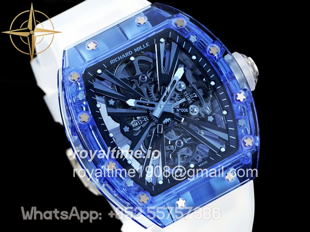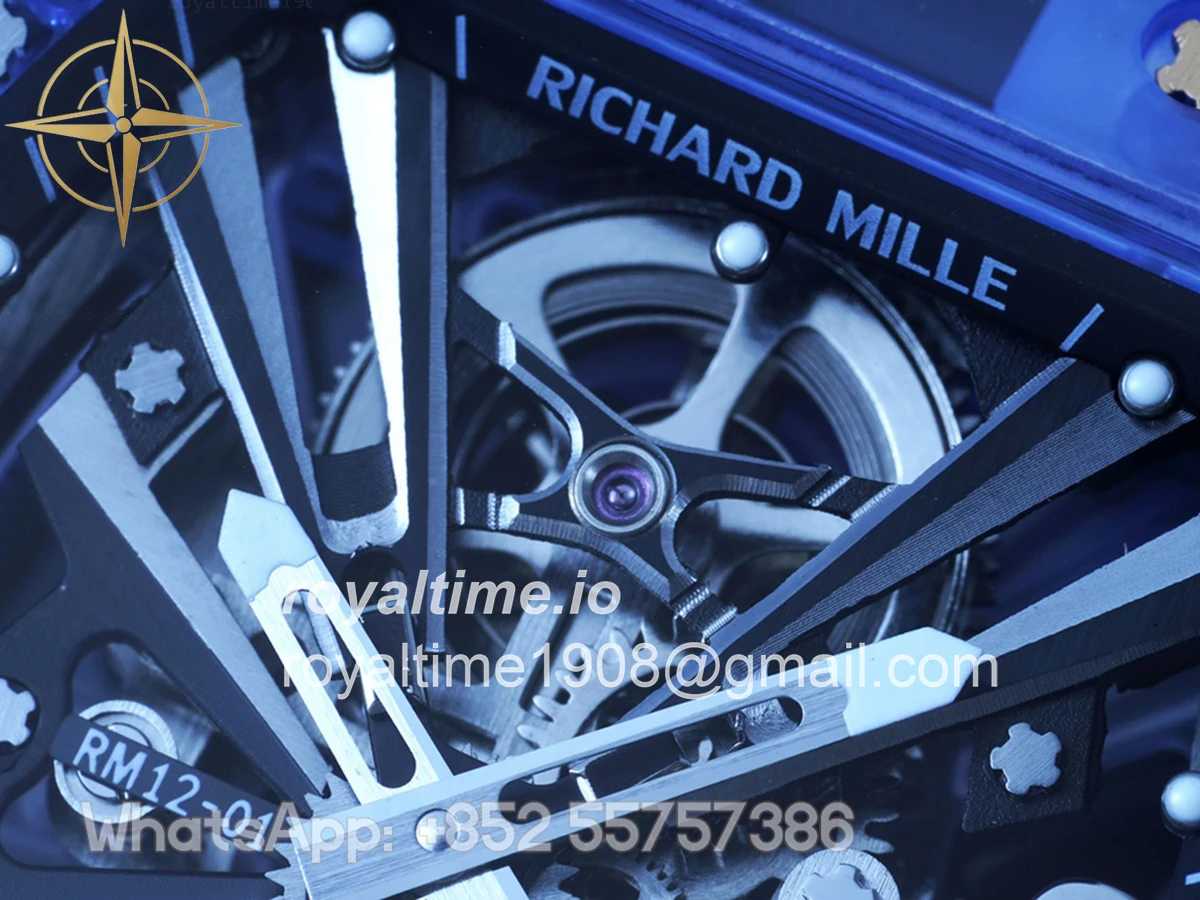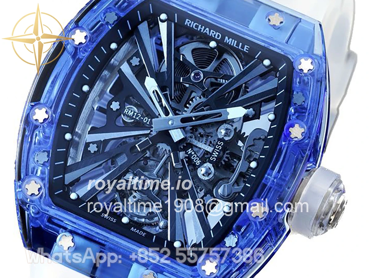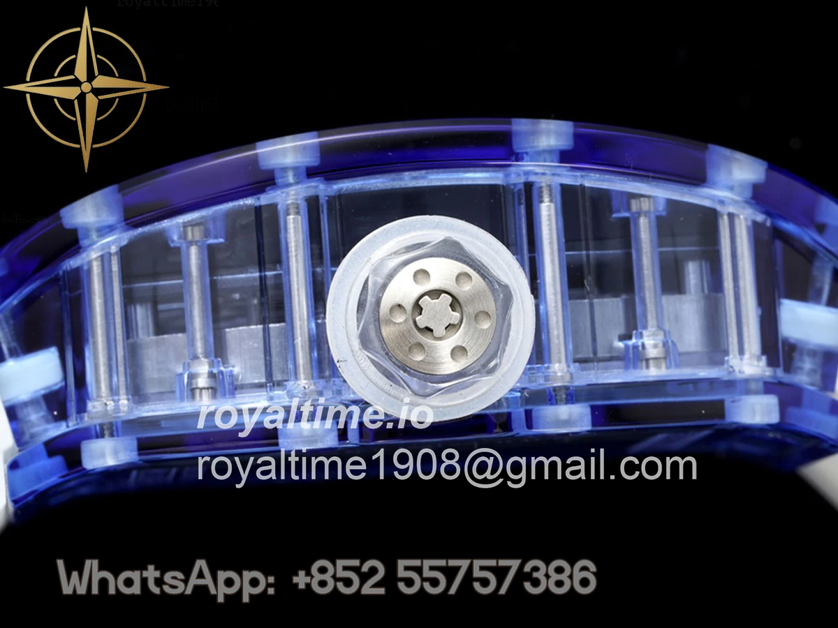 Size: 49mm x 43mm x 16mm Movement: Asian hand winding tourbillon movement Functions: Hours and minutes display Case: Transparent Composite Material Case (Factory claimed made with Sapphire) Crystal: Scratch-proof sapphire crystal Dial: Skeleton dial Bezel: Blue transparent bezel Strap: Transparent rubber strap with deployant clasp Water resistance: <20 meters