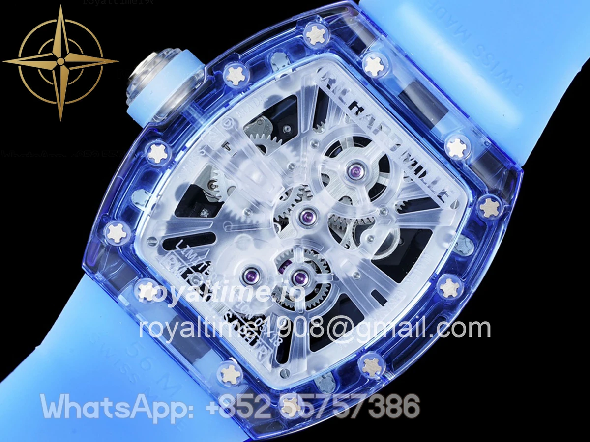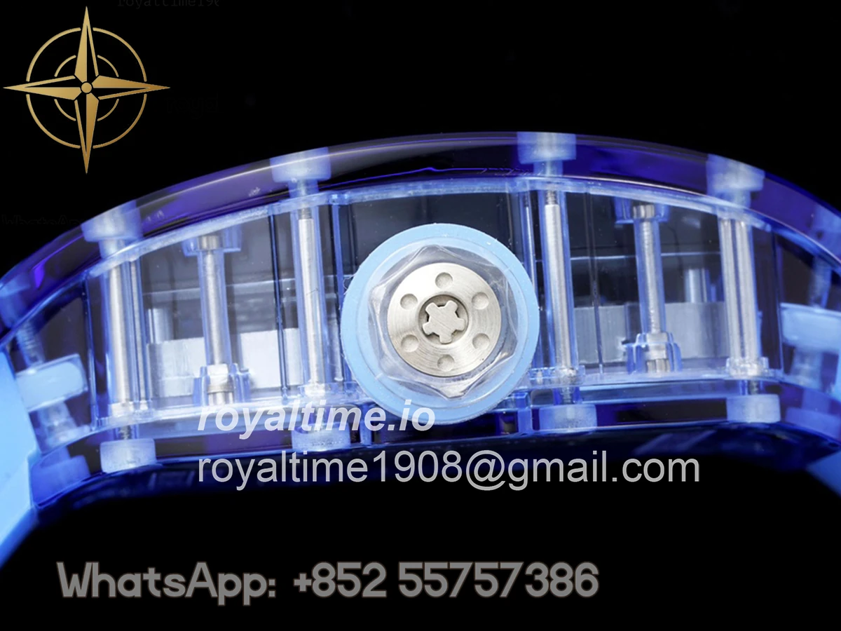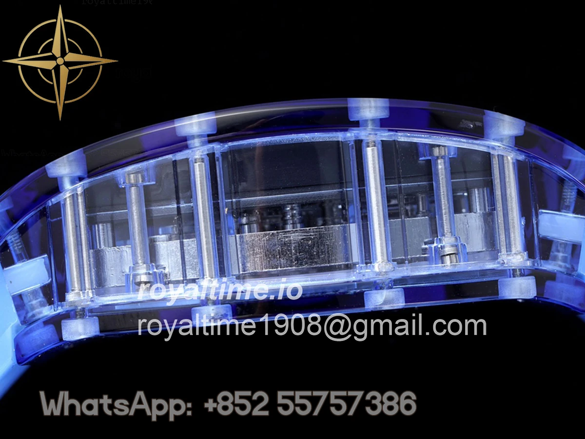 Size: 49mm x 43mm x 16mm Movement: Asian hand winding tourbillon movement Functions: Hours and minutes display Case: Transparent Composite Material Case (Factory claimed made with Sapphire) Crystal: Scratch-proof sapphire crystal Dial: Skeleton dial Bezel: Blue transparent bezel Strap: Blue rubber strap with deployant clasp Water resistance: <20 meters