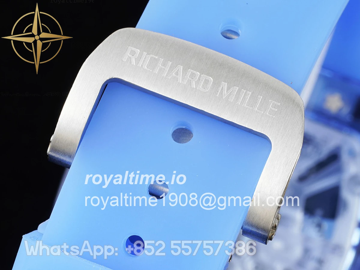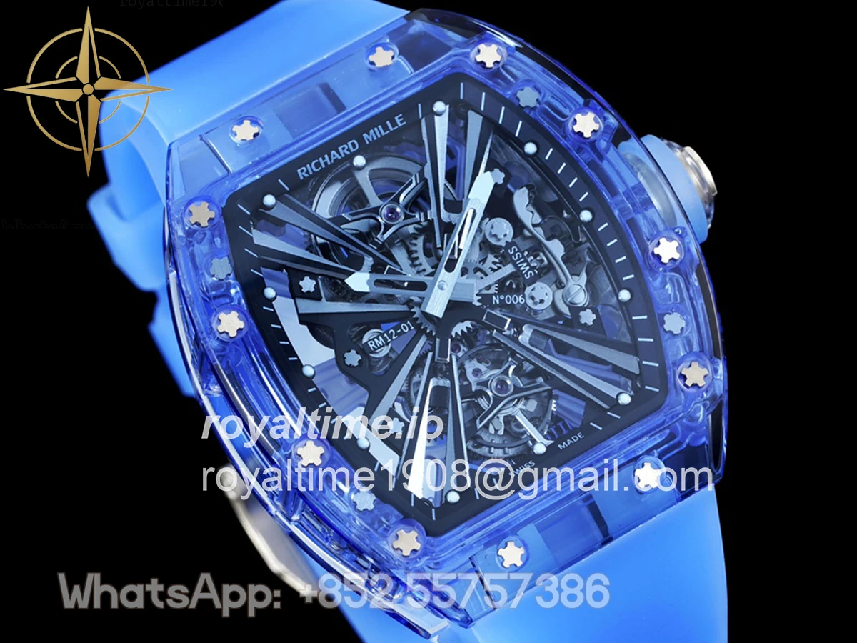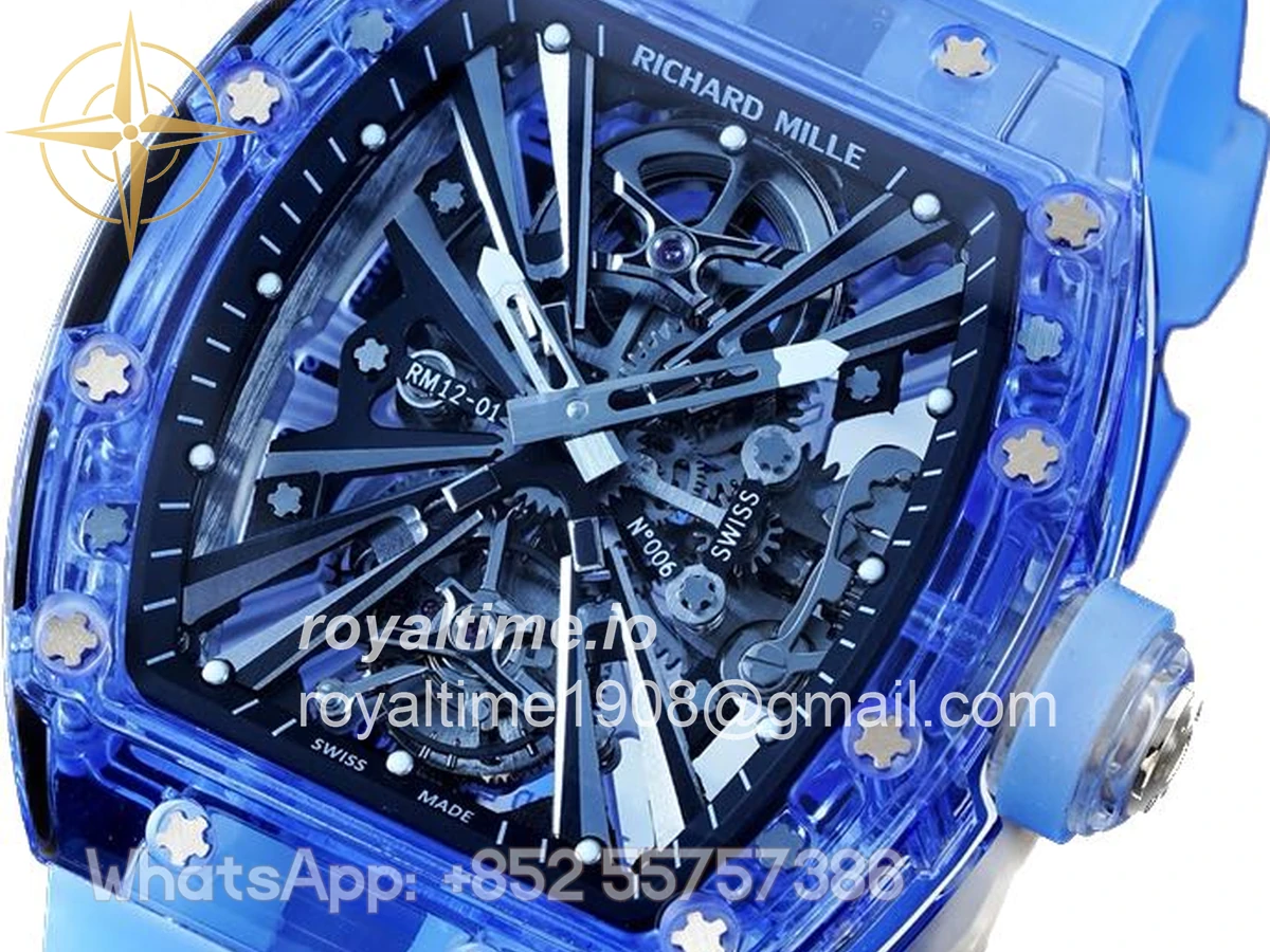 Size: 49mm x 43mm x 16mm Movement: Asian hand winding tourbillon movement Functions: Hours and minutes display Case: Transparent Composite Material Case (Factory claimed made with Sapphire) Crystal: Scratch-proof sapphire crystal Dial: Skeleton dial Bezel: Blue transparent bezel Strap: Blue rubber strap with deployant clasp Water resistance: <20 meters