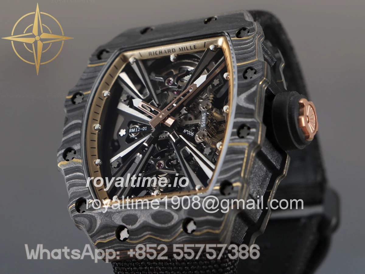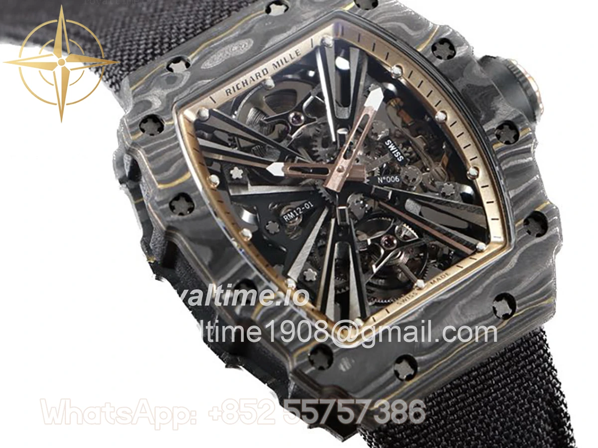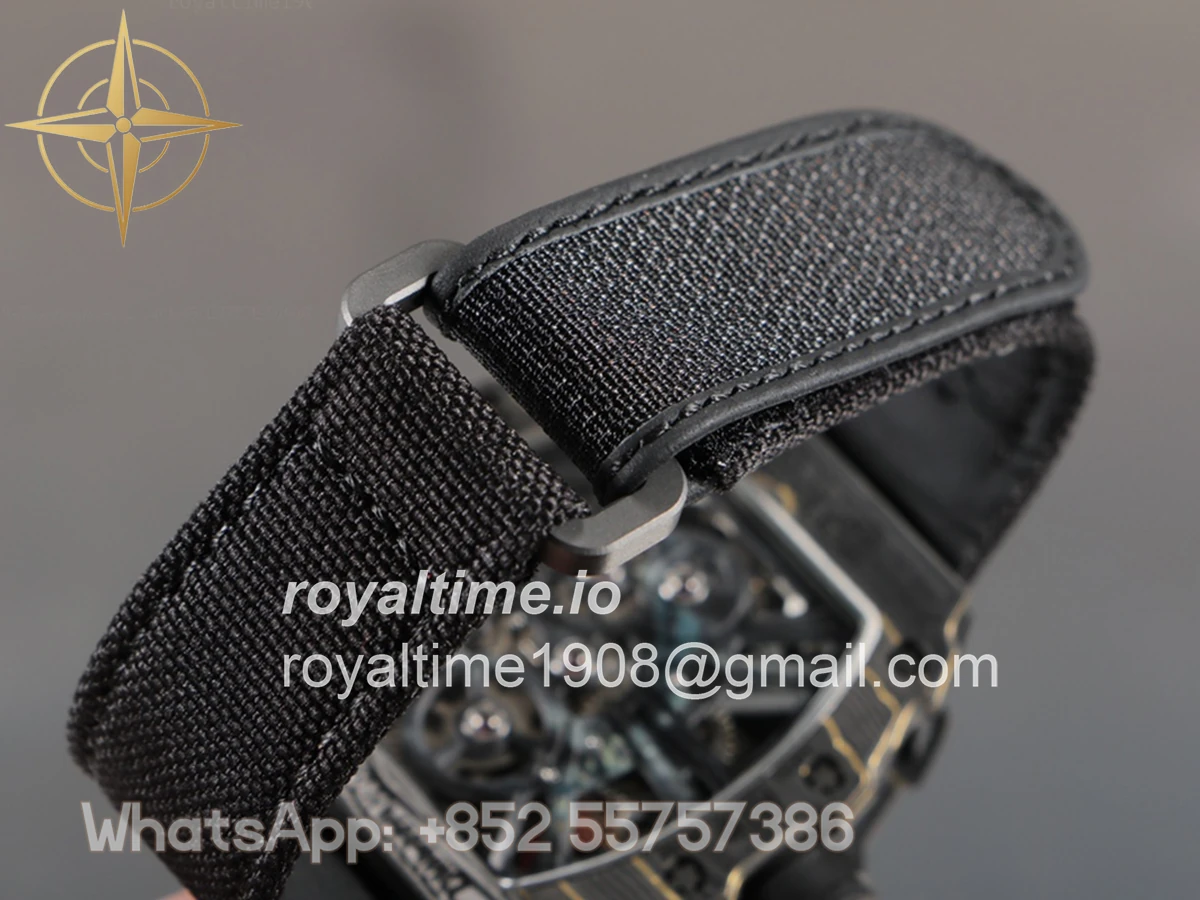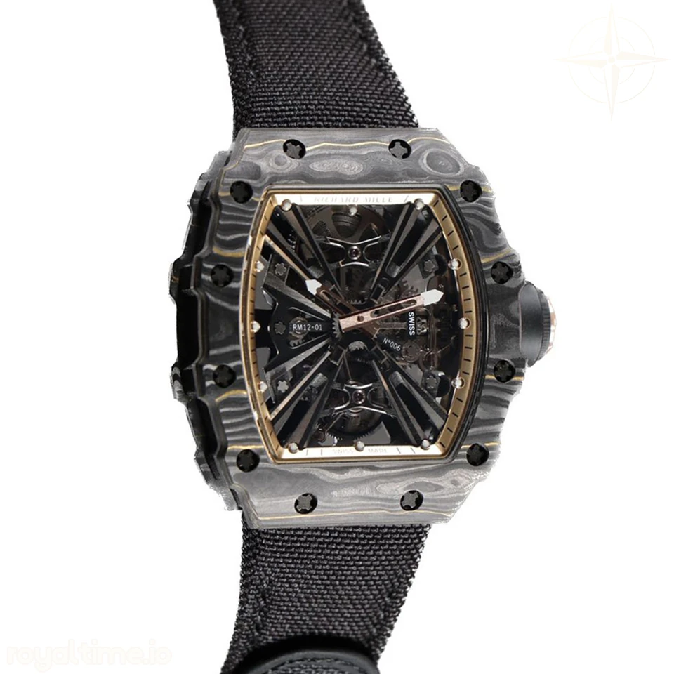 Size: 51mm x 17.5mm x 30mm Movement: Asian hand winding tourbillon movement Functions: Hours and minutes display Case: PVD plated stainless steel case Crystal: Scratch-proof sapphire crystal Dial: Skeleton dial with gold indent Bezel: Forged carbon bezel Strap: Black nylon strap with deployant clasp Water resistance: <20 meters