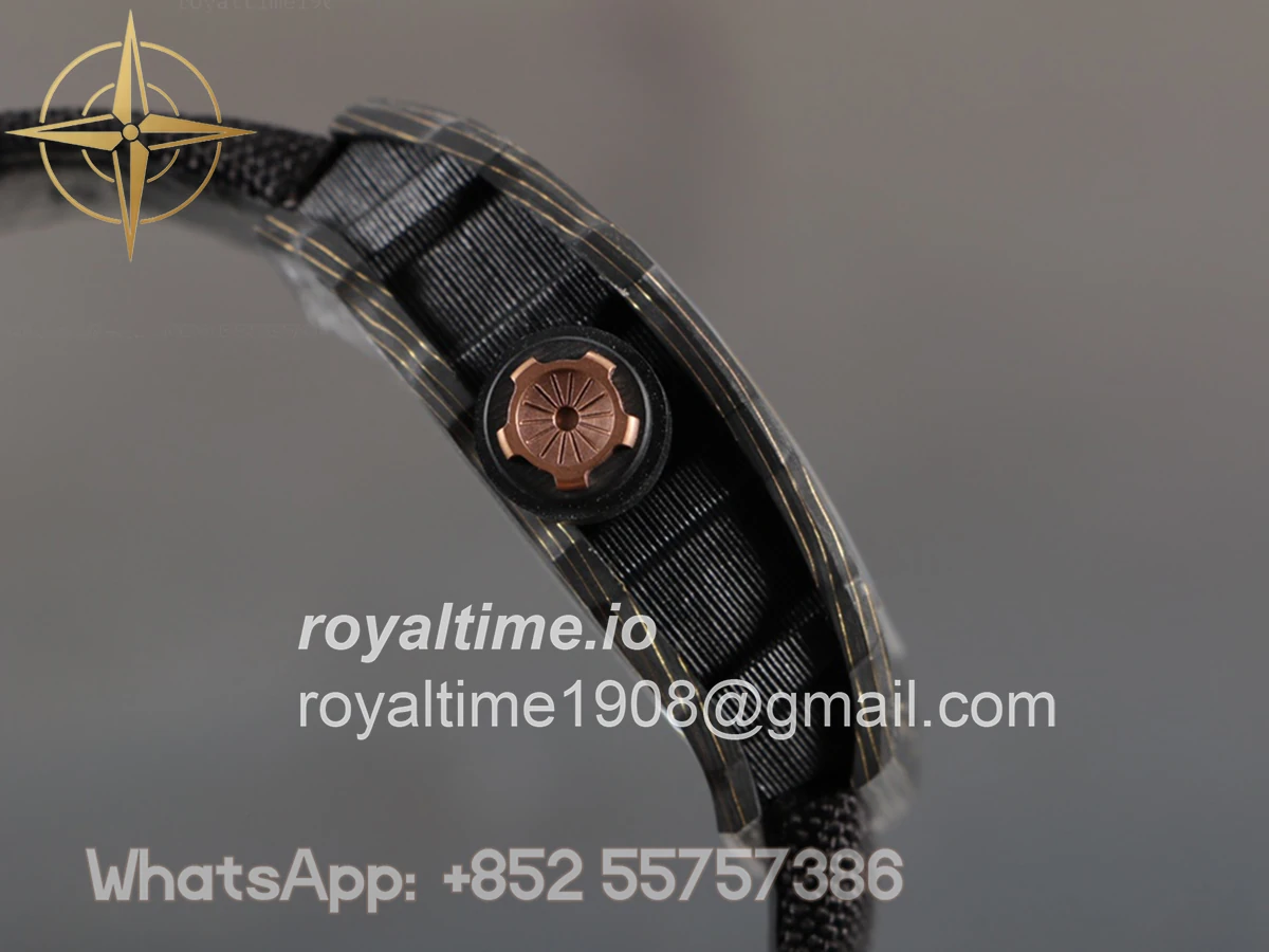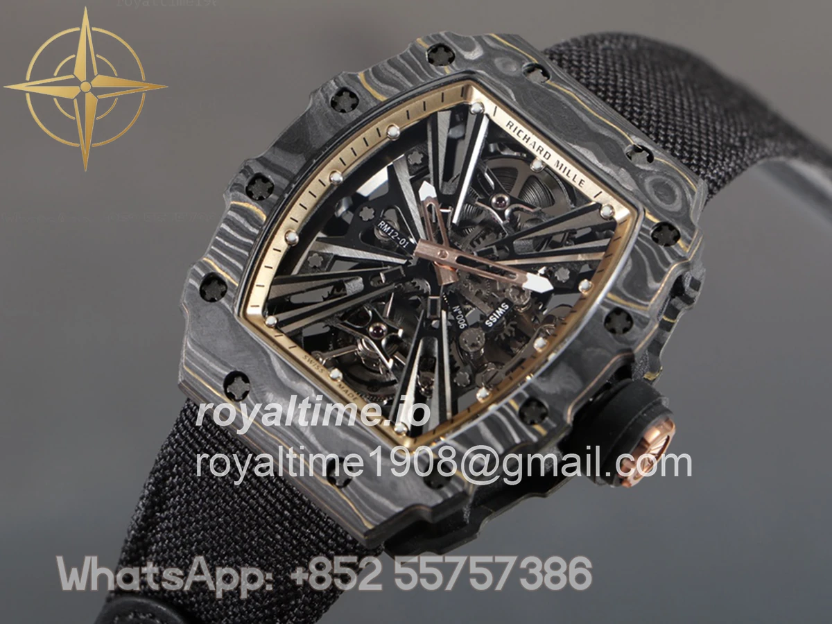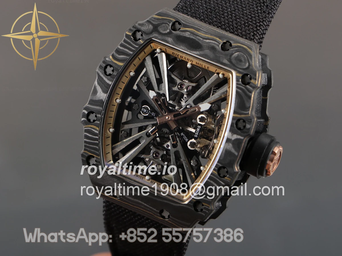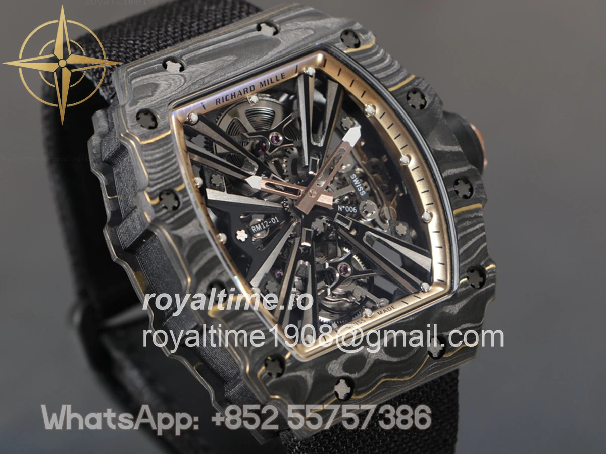 Size: 51mm x 17.5mm x 30mm Movement: Asian hand winding tourbillon movement Functions: Hours and minutes display Case: PVD plated stainless steel case Crystal: Scratch-proof sapphire crystal Dial: Skeleton dial with gold indent Bezel: Forged carbon bezel Strap: Black nylon strap with deployant clasp Water resistance: <20 meters