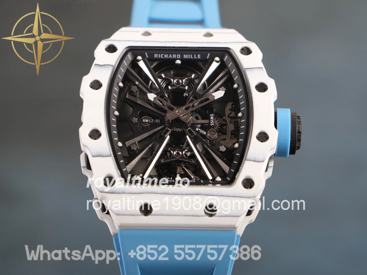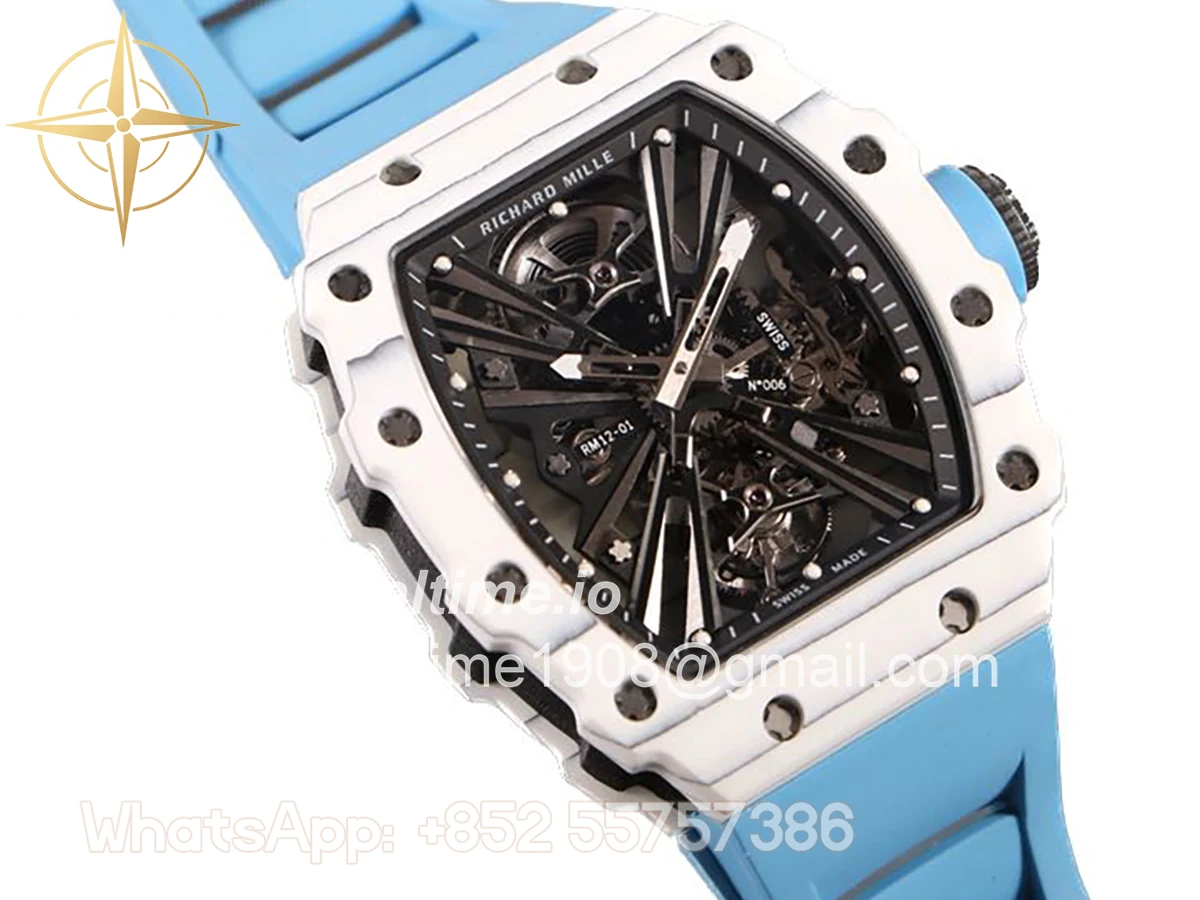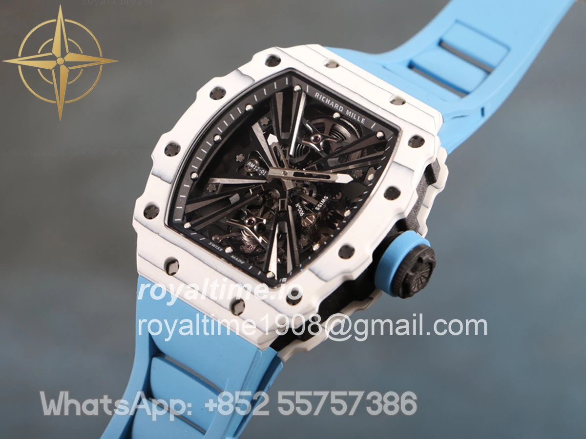 Size: 51mm x 17.5mm x 30mm Movement: Asian hand winding tourbillon movement Functions: Hours and minutes display Case: PVD plated stainless steel case Crystal: Scratch-proof sapphire crystal Dial: Skeleton dial Bezel: Forged white carbon bezel Strap: Blue rubber strap with deployant clasp Water resistance: <20 meters