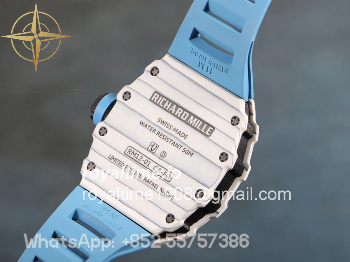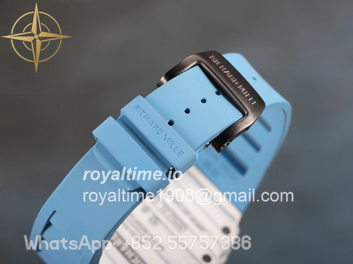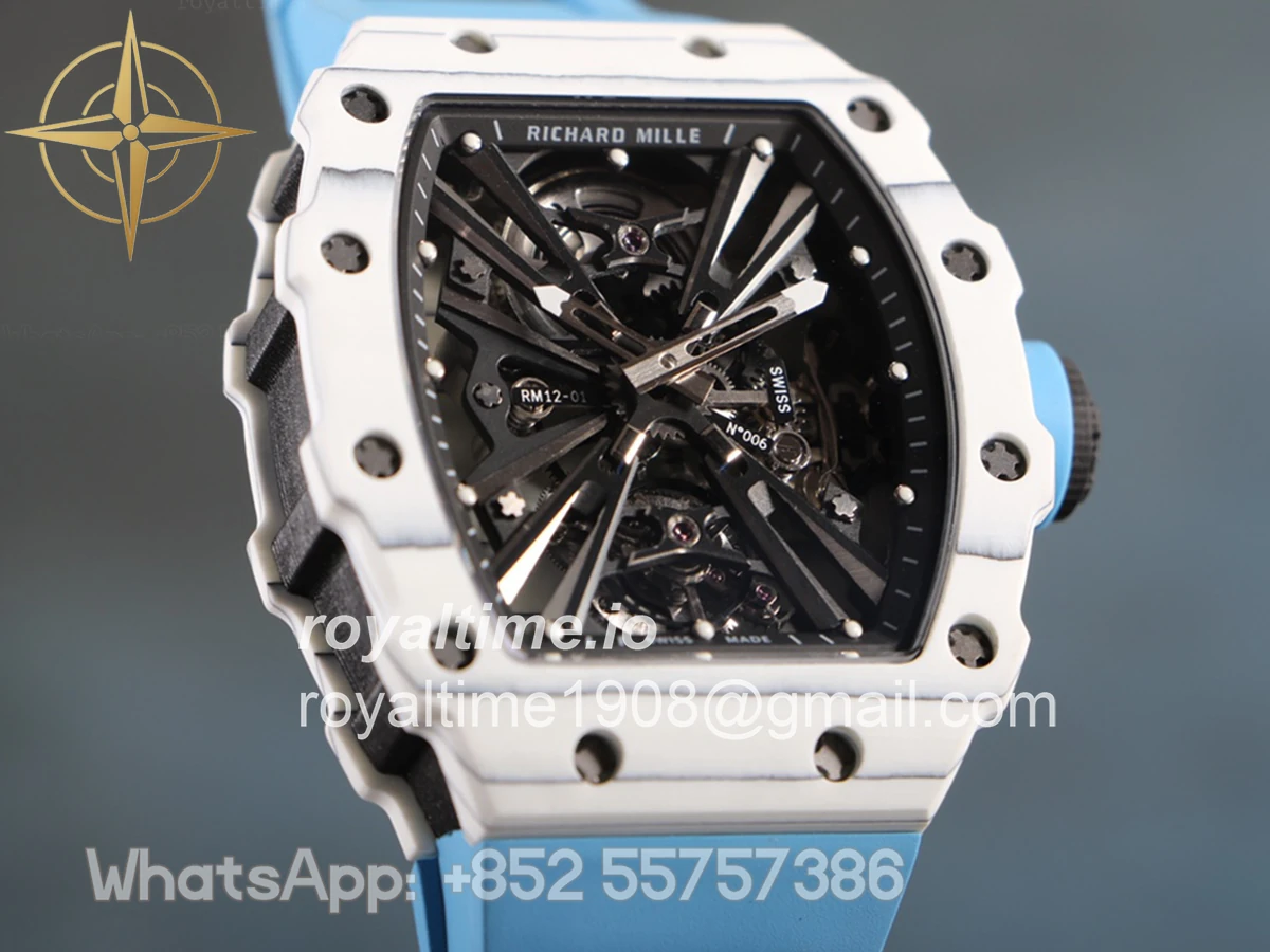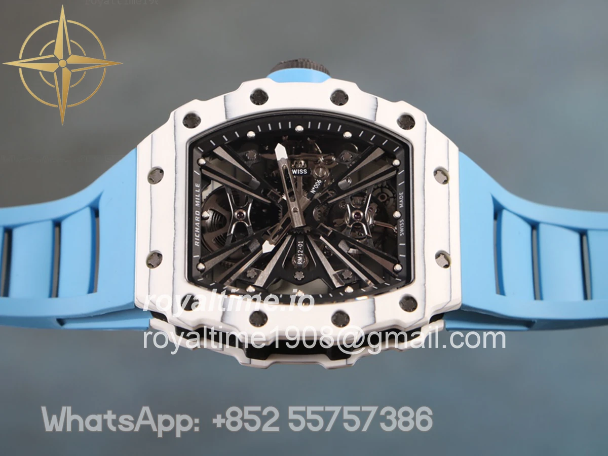 Size: 51mm x 17.5mm x 30mm Movement: Asian hand winding tourbillon movement Functions: Hours and minutes display Case: PVD plated stainless steel case Crystal: Scratch-proof sapphire crystal Dial: Skeleton dial Bezel: Forged white carbon bezel Strap: Blue rubber strap with deployant clasp Water resistance: <20 meters