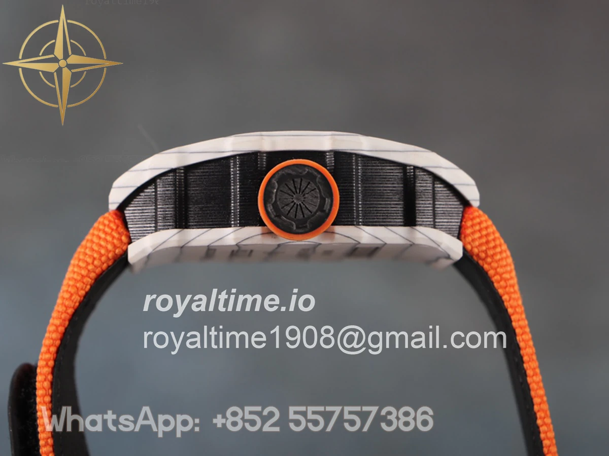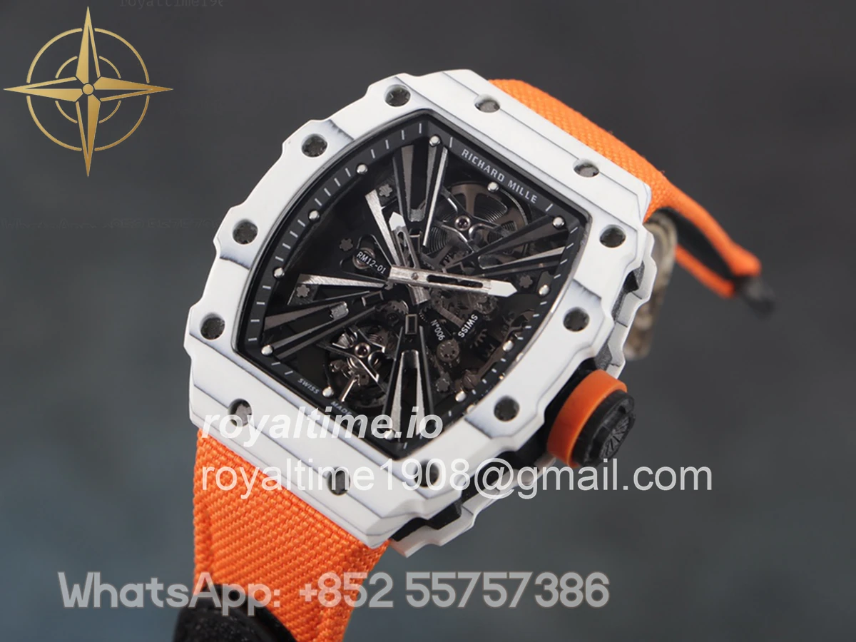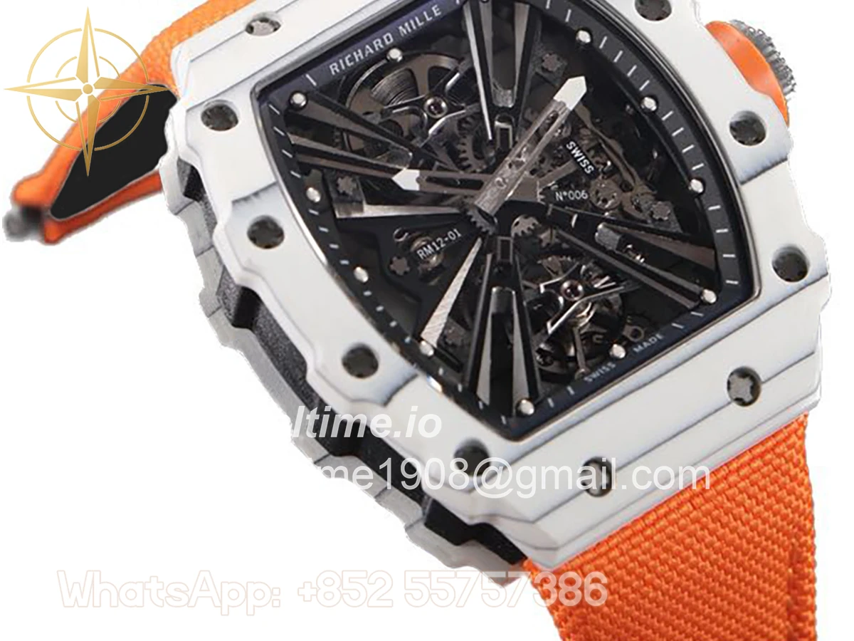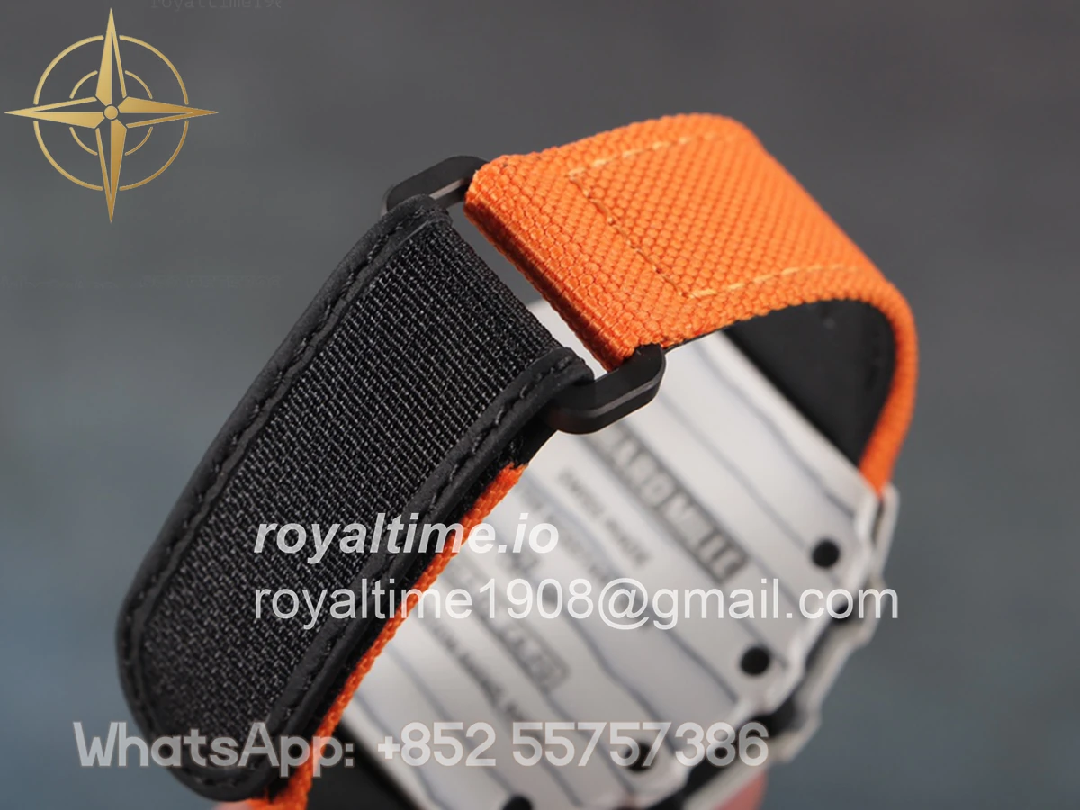 Size: 51mm x 17.5mm x 30mm Movement: Asian hand winding tourbillon movement Functions: Hours and minutes display Case: PVD plated stainless steel case Crystal: Scratch-proof sapphire crystal Dial: Skeleton dial Bezel: Forged white carbon bezel Strap: Orange nylon strap with deployant clasp Water resistance: <20 meters