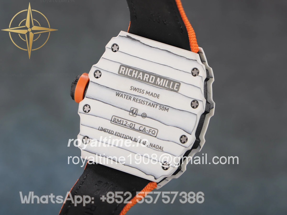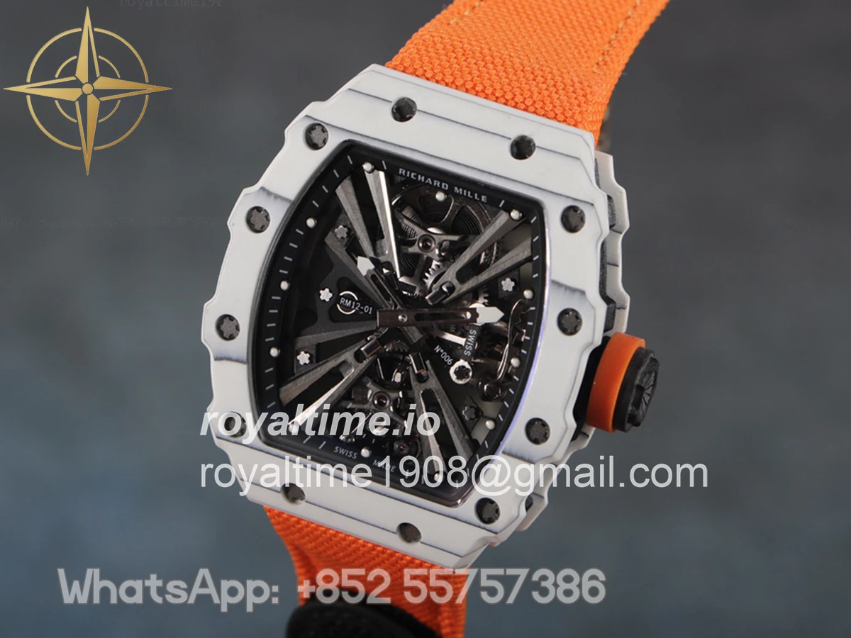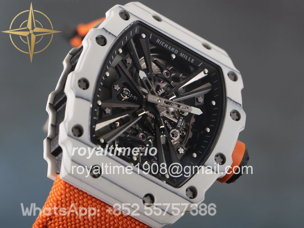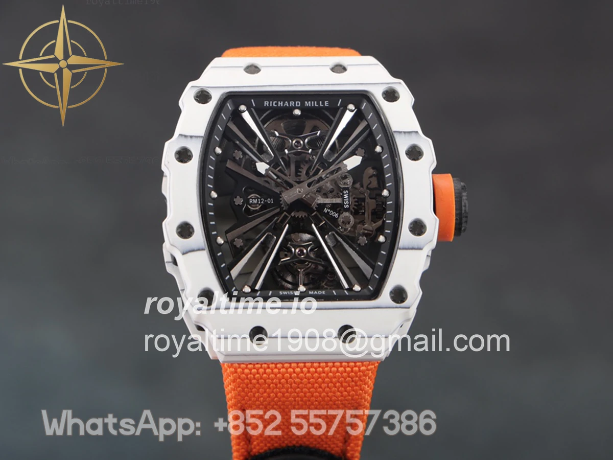 Size: 51mm x 17.5mm x 30mm Movement: Asian hand winding tourbillon movement Functions: Hours and minutes display Case: PVD plated stainless steel case Crystal: Scratch-proof sapphire crystal Dial: Skeleton dial Bezel: Forged white carbon bezel Strap: Orange nylon strap with deployant clasp Water resistance: <20 meters