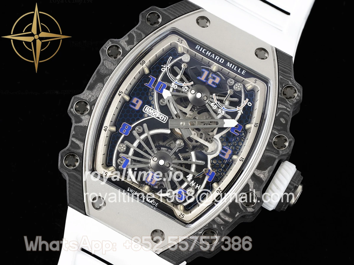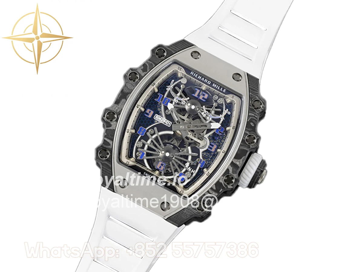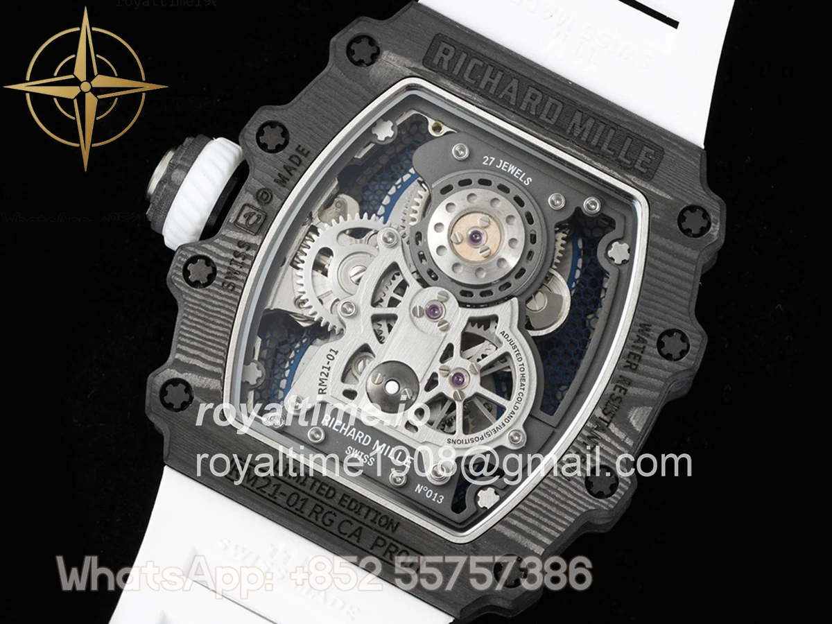 Size: 51mm x 42.5mm x 16.5mm Movement: Asian hand winding tourbillon movement Functions: Hours and minutes display Case: Solid stainless steel case Crystal: Scratch-proof sapphire crystal Dial: Skeleton dial Bezel: Forged carbon and steel bezel Strap: White rubber strap with deployant clasp Water resistance: <20 meters