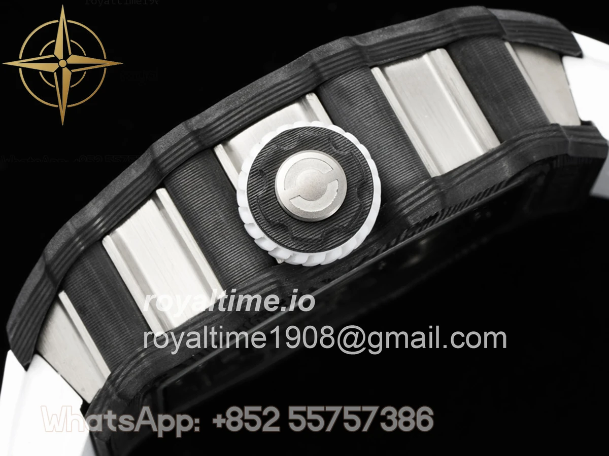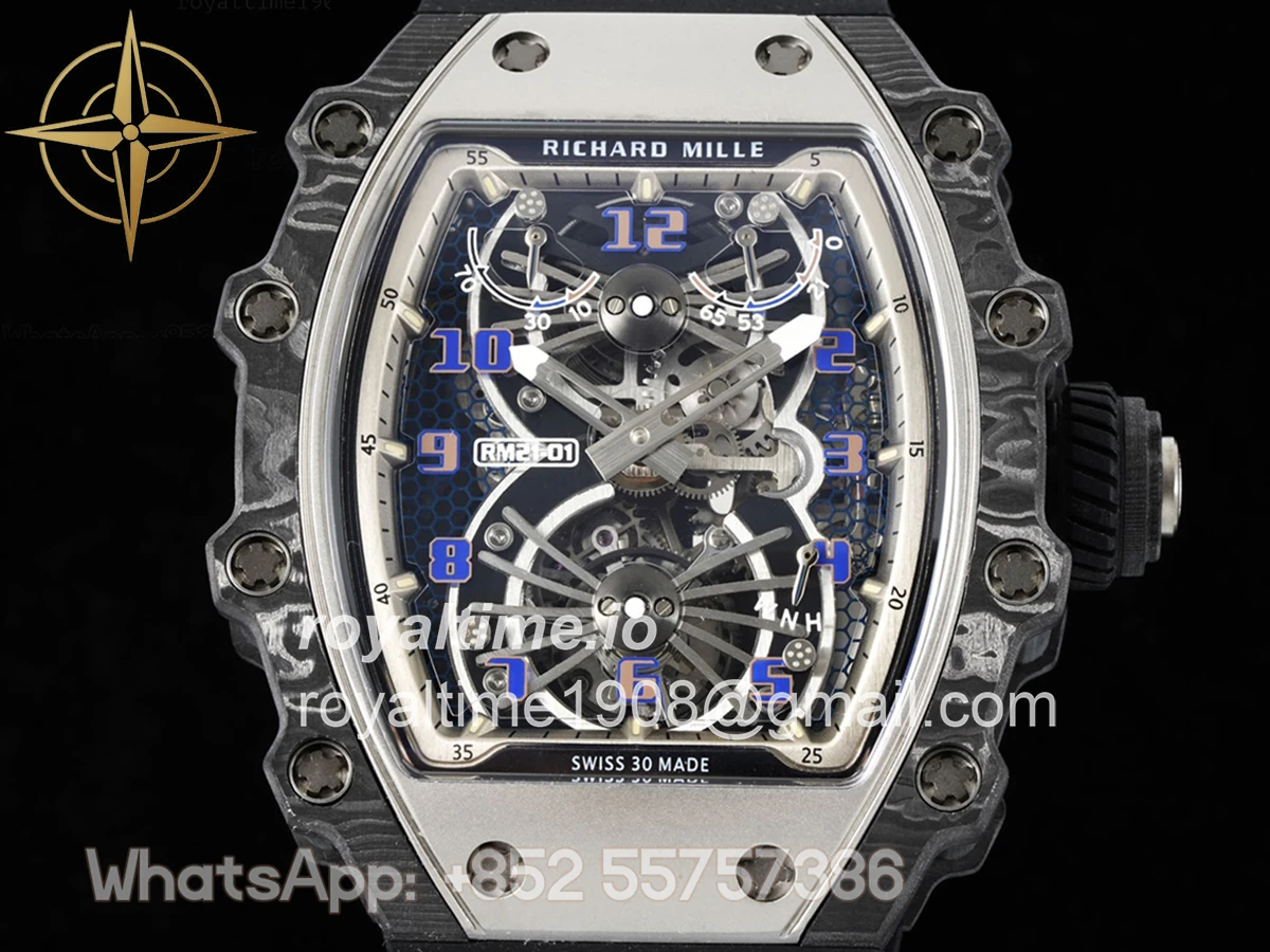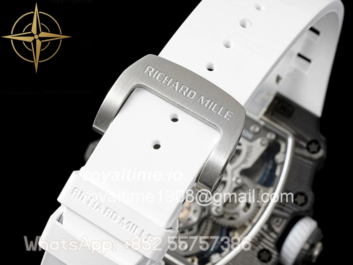 Size: 51mm x 42.5mm x 16.5mm Movement: Asian hand winding tourbillon movement Functions: Hours and minutes display Case: Solid stainless steel case Crystal: Scratch-proof sapphire crystal Dial: Skeleton dial Bezel: Forged carbon and steel bezel Strap: White rubber strap with deployant clasp Water resistance: <20 meters