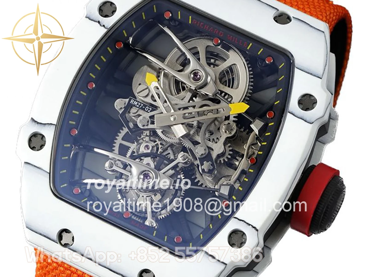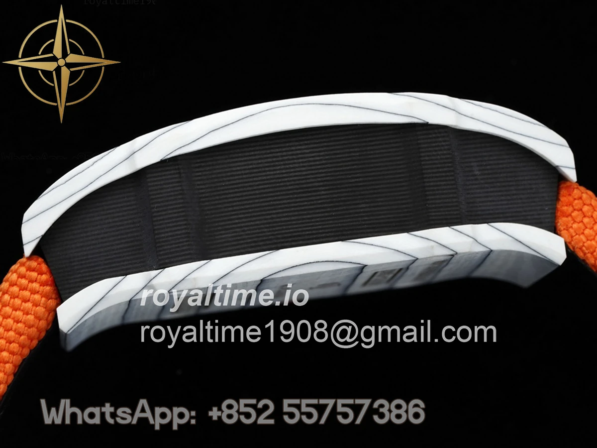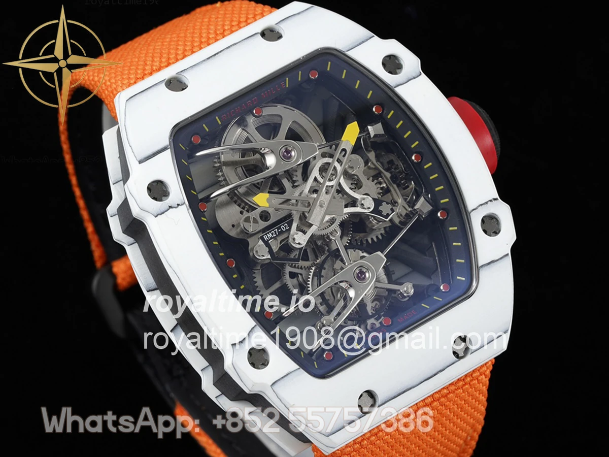 Size: 41.5mm x 50.5mm x 15mm Movement: Asian hand winding tourbillon movement Functions: Hours and minutes display Case: Forged carbon case Crystal: Scratch-proof sapphire crystal Dial: Skeleton dial Bezel: White forged carbon bezel Strap: Orange nylon strap with tang buckle Water resistance: <20 meters