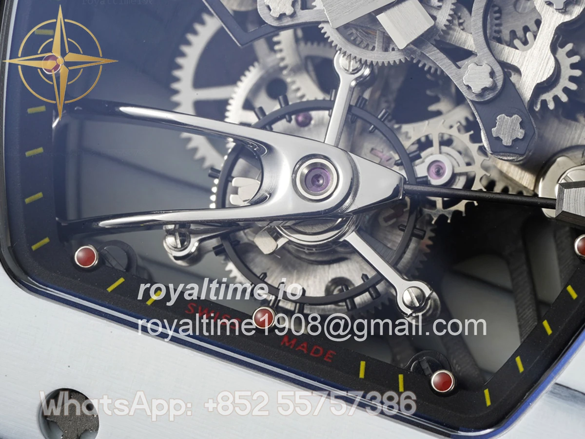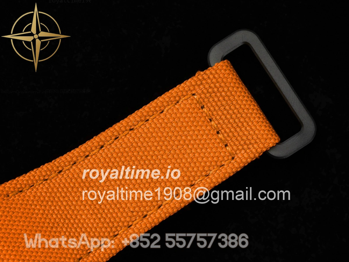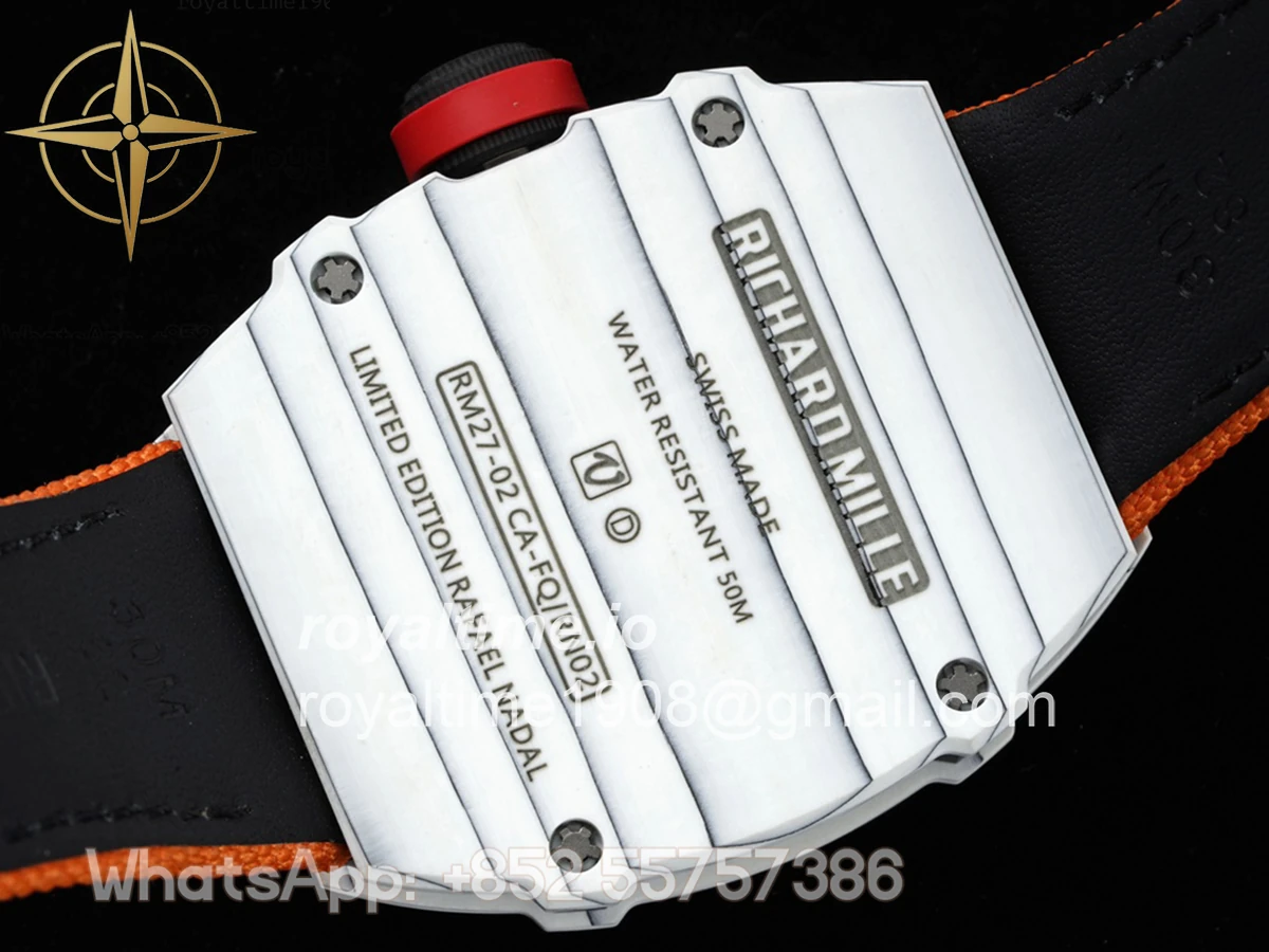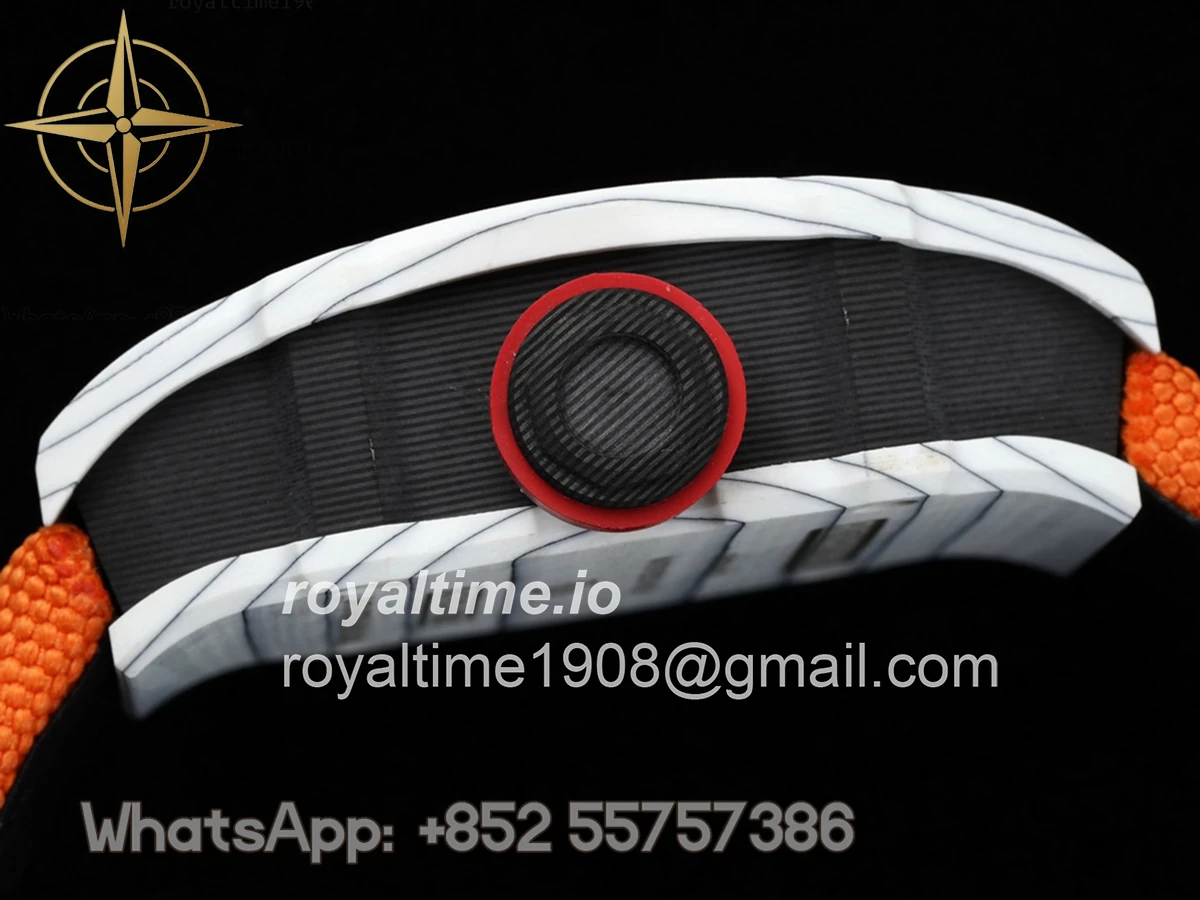 Size: 41.5mm x 50.5mm x 15mm Movement: Asian hand winding tourbillon movement Functions: Hours and minutes display Case: Forged carbon case Crystal: Scratch-proof sapphire crystal Dial: Skeleton dial Bezel: White forged carbon bezel Strap: Orange nylon strap with tang buckle Water resistance: <20 meters