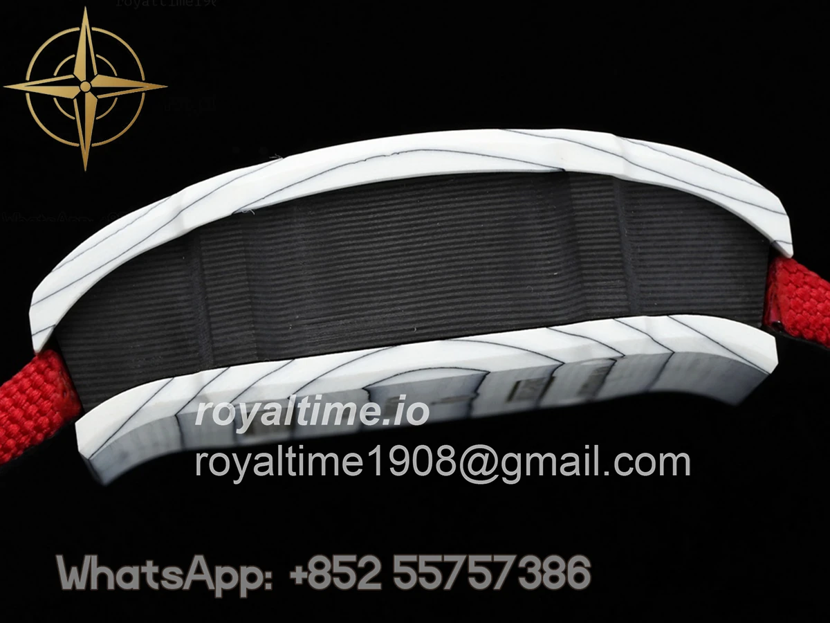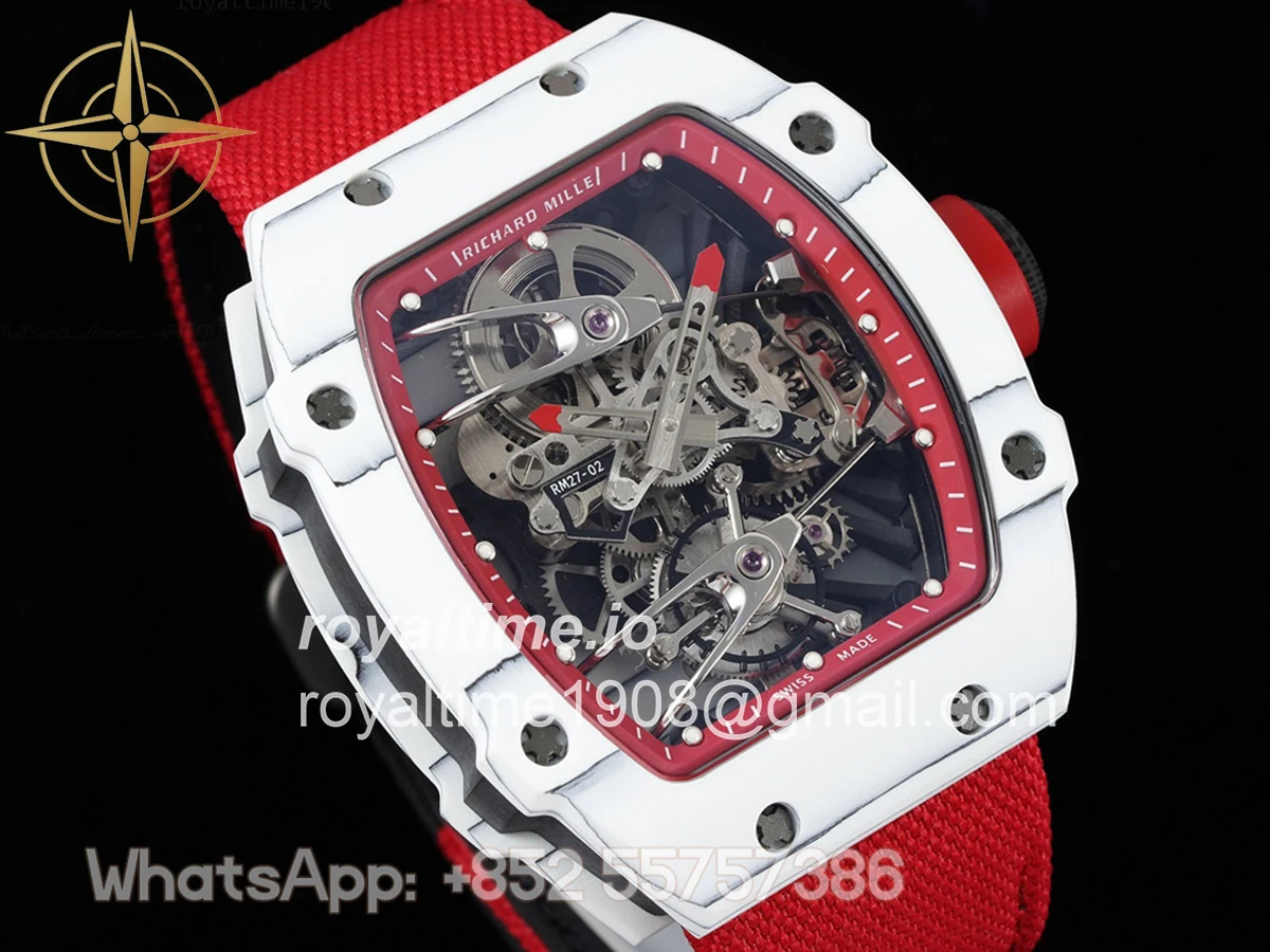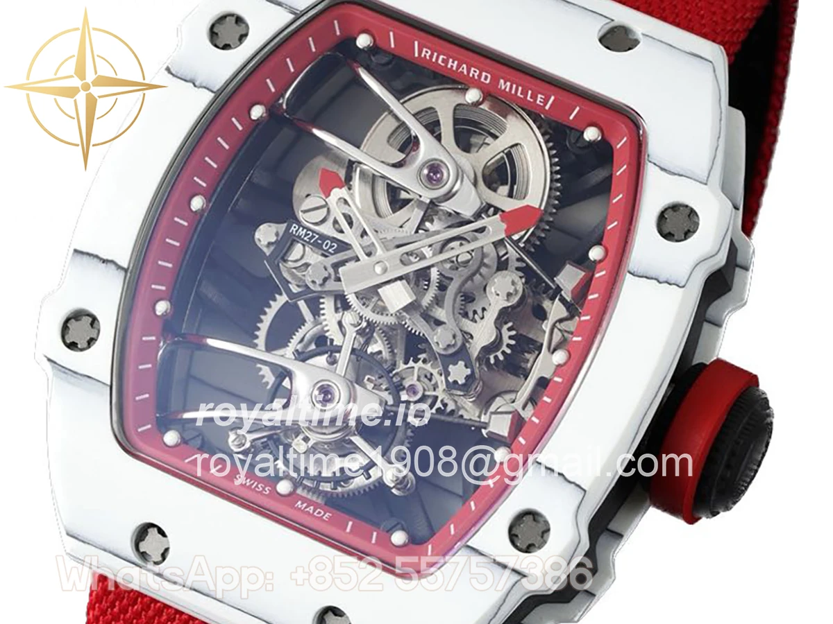 Size: 41.5mm x 50.5mm x 15mm Movement: Asian hand winding tourbillon movement Functions: Hours and minutes display Case: Forged carbon case Crystal: Scratch-proof sapphire crystal Dial: Skeleton dial Bezel: White forged carbon bezel Strap: Red nylon strap with tang buckle Water resistance: <20 meters