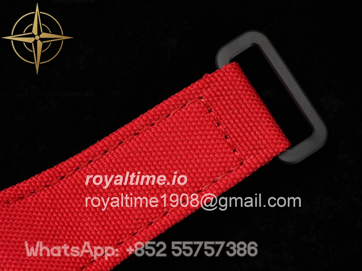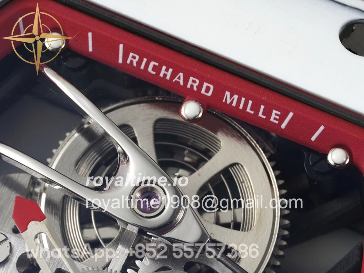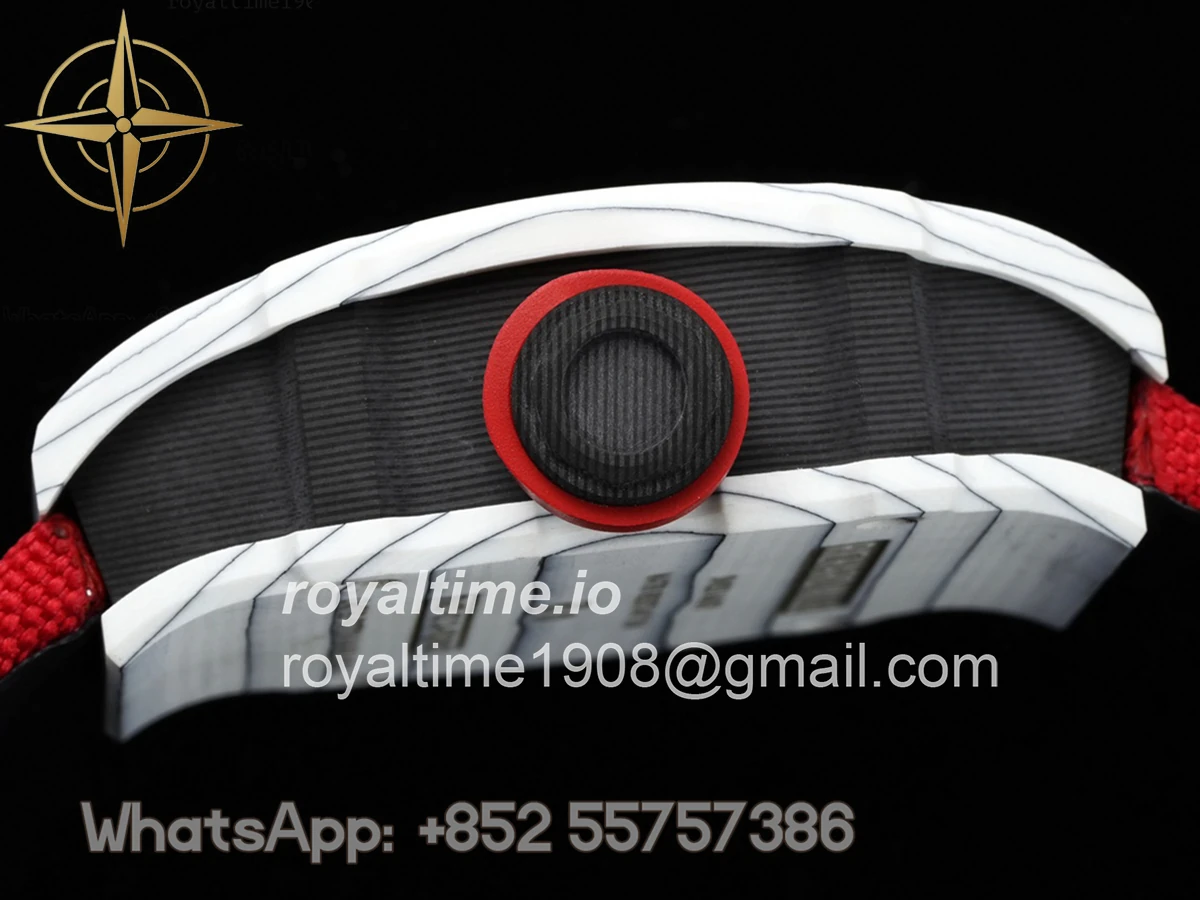 Size: 41.5mm x 50.5mm x 15mm Movement: Asian hand winding tourbillon movement Functions: Hours and minutes display Case: Forged carbon case Crystal: Scratch-proof sapphire crystal Dial: Skeleton dial Bezel: White forged carbon bezel Strap: Red nylon strap with tang buckle Water resistance: <20 meters