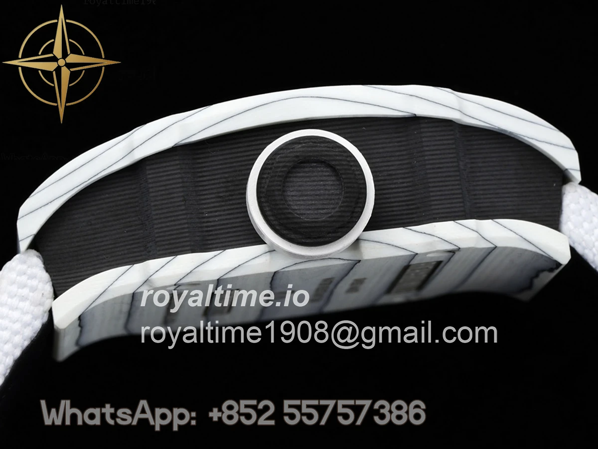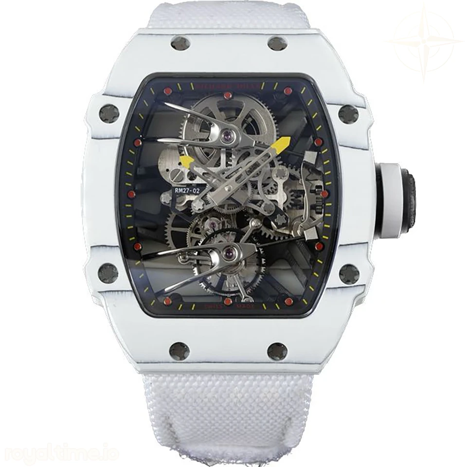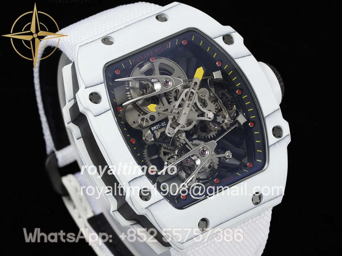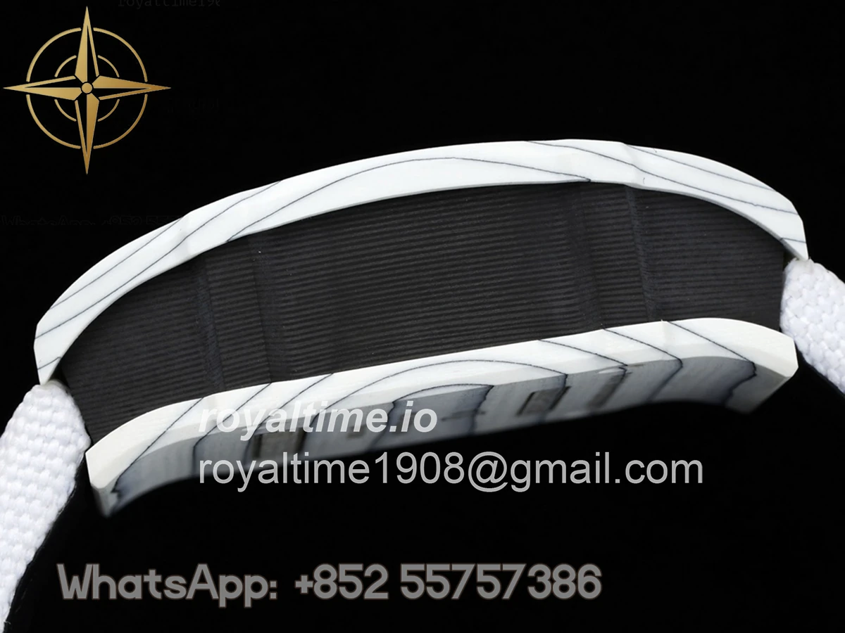 Size: 41.5mm x 50.5mm x 15mm Movement: Asian hand winding tourbillon movement Functions: Hours and minutes display Case: Forged carbon case Crystal: Scratch-proof sapphire crystal Dial: Skeleton dial Bezel: White forged carbon bezel Strap: White nylon strap with tang buckle Water resistance: <20 meters
