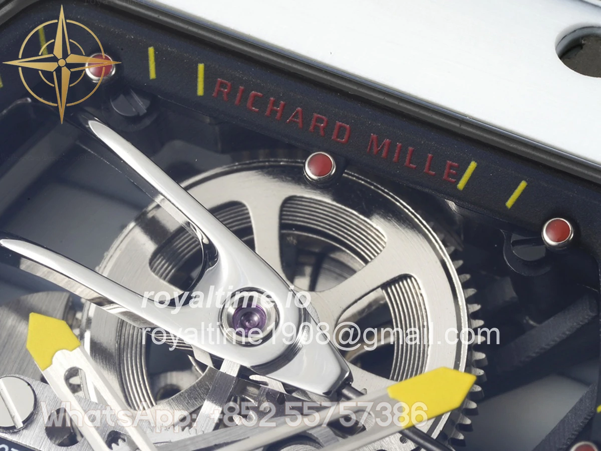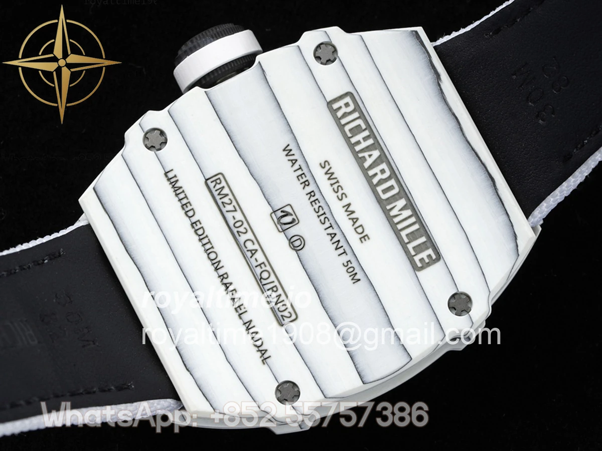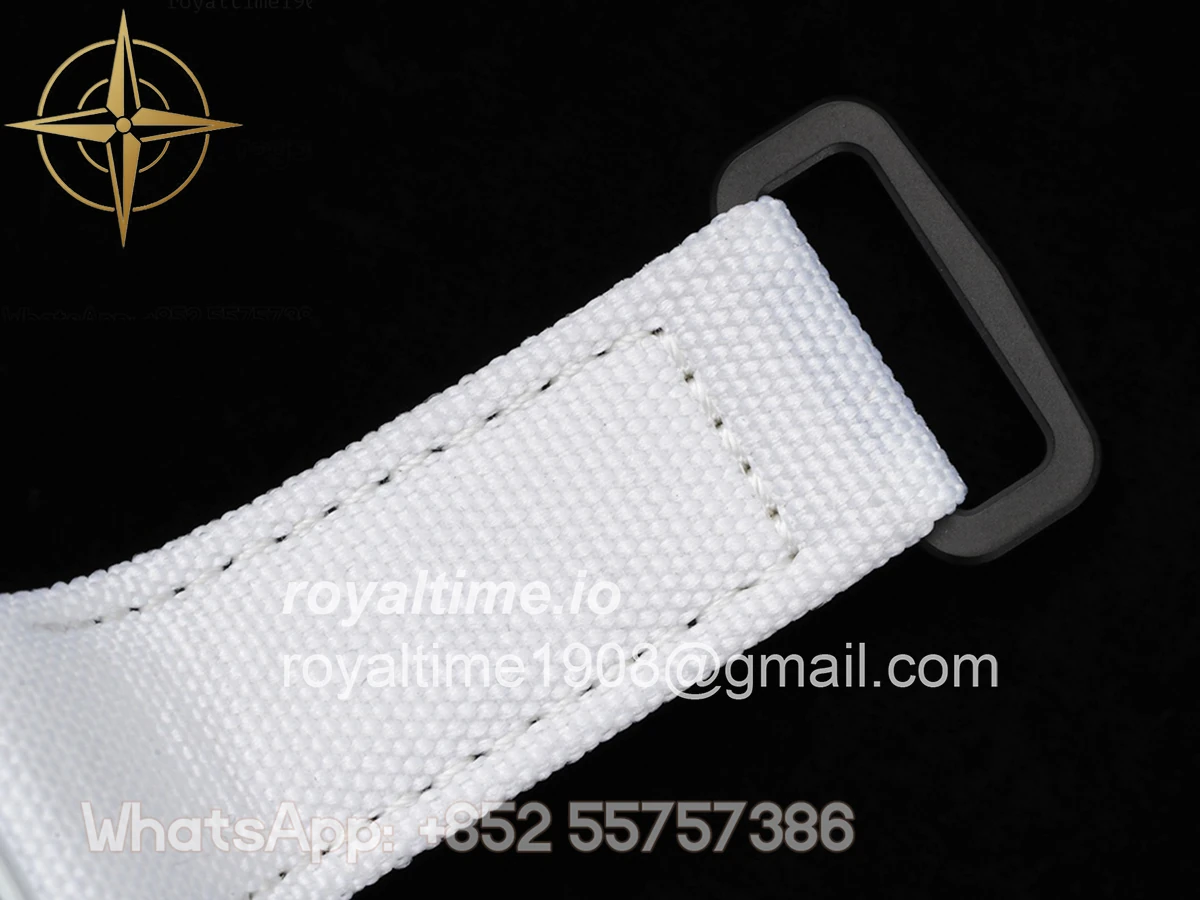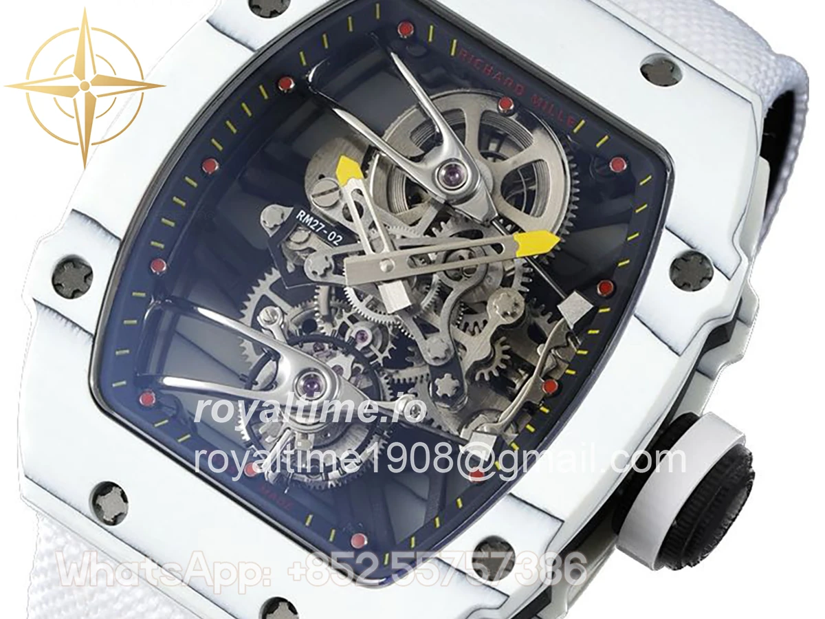 Size: 41.5mm x 50.5mm x 15mm Movement: Asian hand winding tourbillon movement Functions: Hours and minutes display Case: Forged carbon case Crystal: Scratch-proof sapphire crystal Dial: Skeleton dial Bezel: White forged carbon bezel Strap: White nylon strap with tang buckle Water resistance: <20 meters