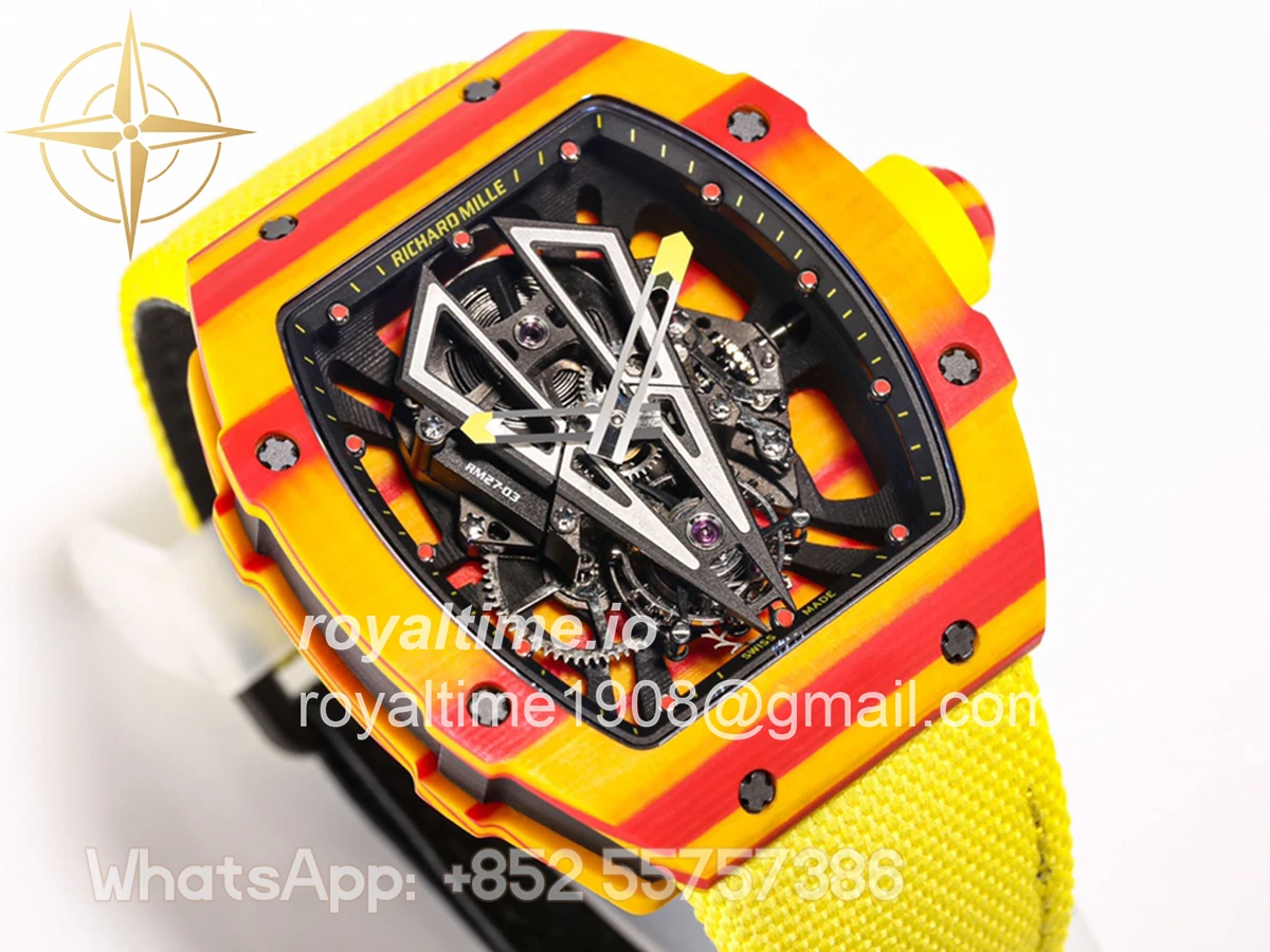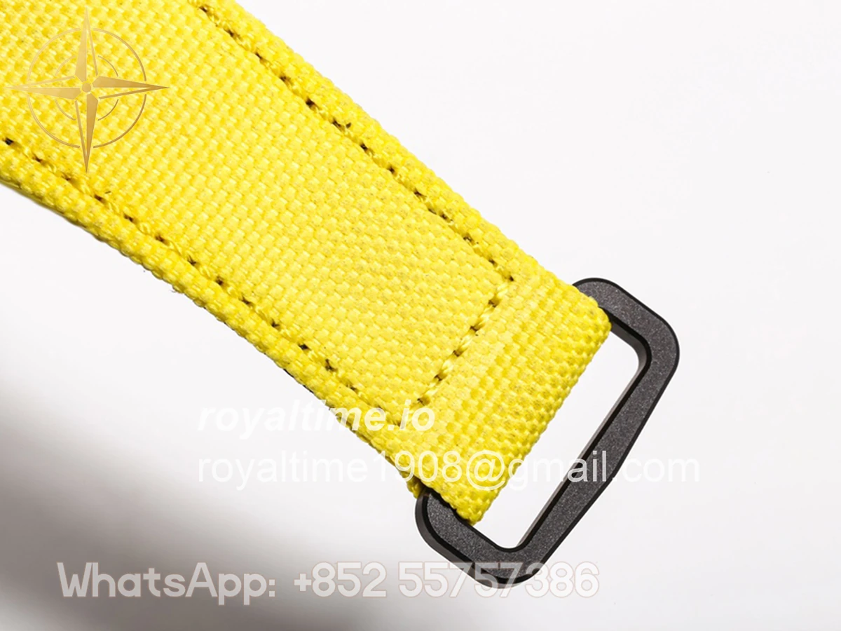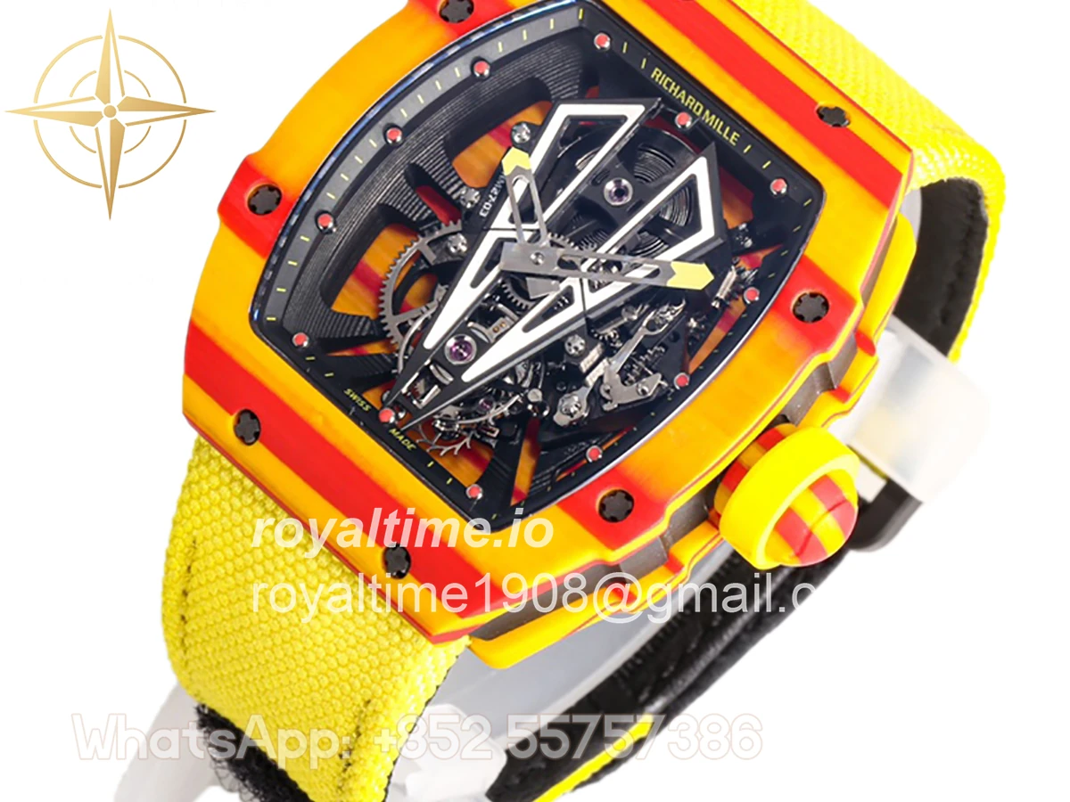 Size: 41mm x 48mm x 13mm Movement: Manual hand-winding tourbillon movement Functions: Hours, minutes and seconds display Case: Quartz TPT case with PVD plated midcase Crystal: Scratch-proof sapphire crystal Dial: Skeleton dial Bezel: Quartz TPT bezel Strap: Yellow velcro strap Water resistance: <20 meters