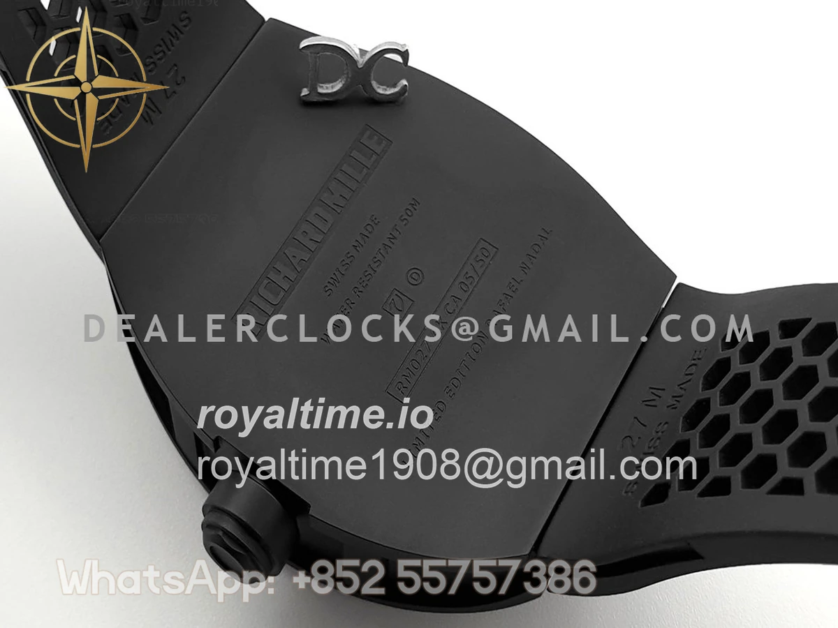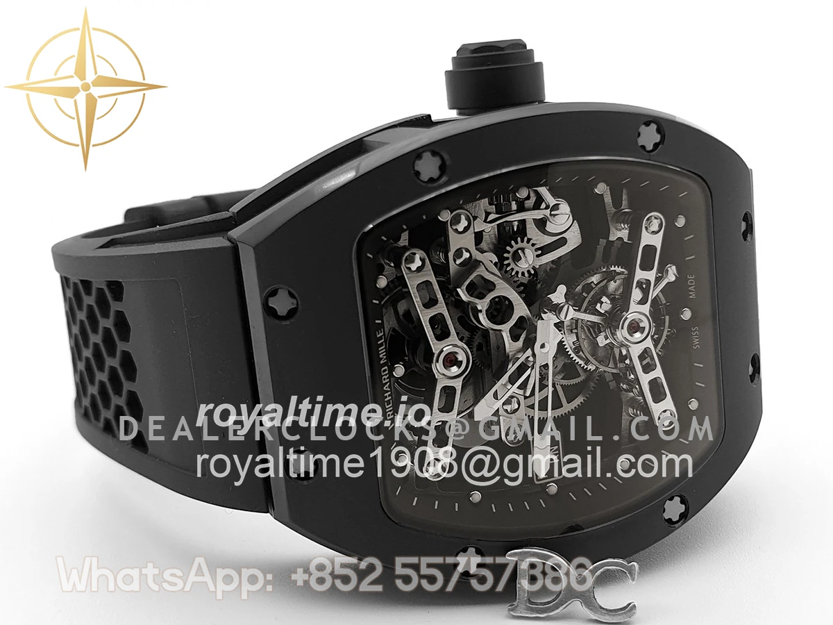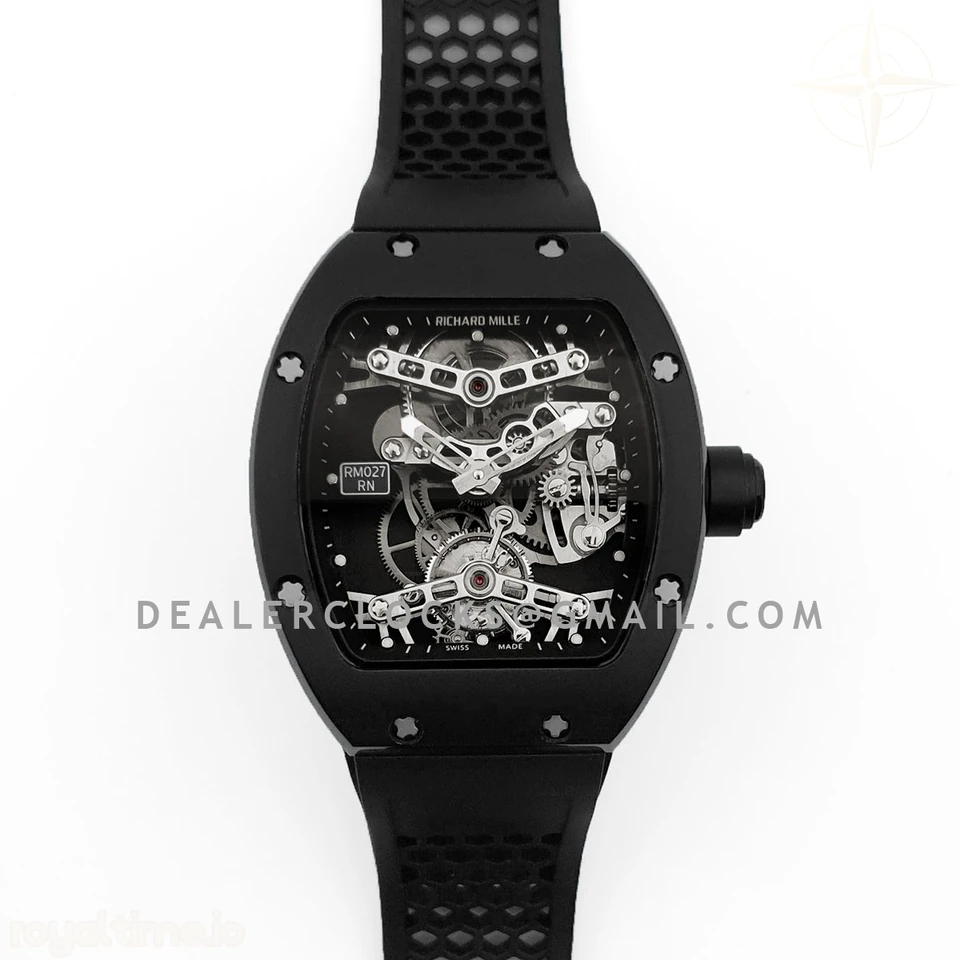 High quality replication of the visually striking Richard Mille RM27 Tourbillon Rafael Nadal on black rubber strap. Size: 51mm x 17.5mm x 30mm Movement: Asian hand winding tourbillon movement Functions: Hours and minutes display Case: PVD plated stainless steel case Crystal: Scratch-proof sapphire crystal Dial: Skeleton dial Bezel: PVD plated stainless steel bezel Strap: Black rubber strap with tang buckle Water resistance: >20 meters