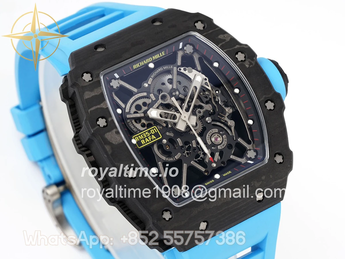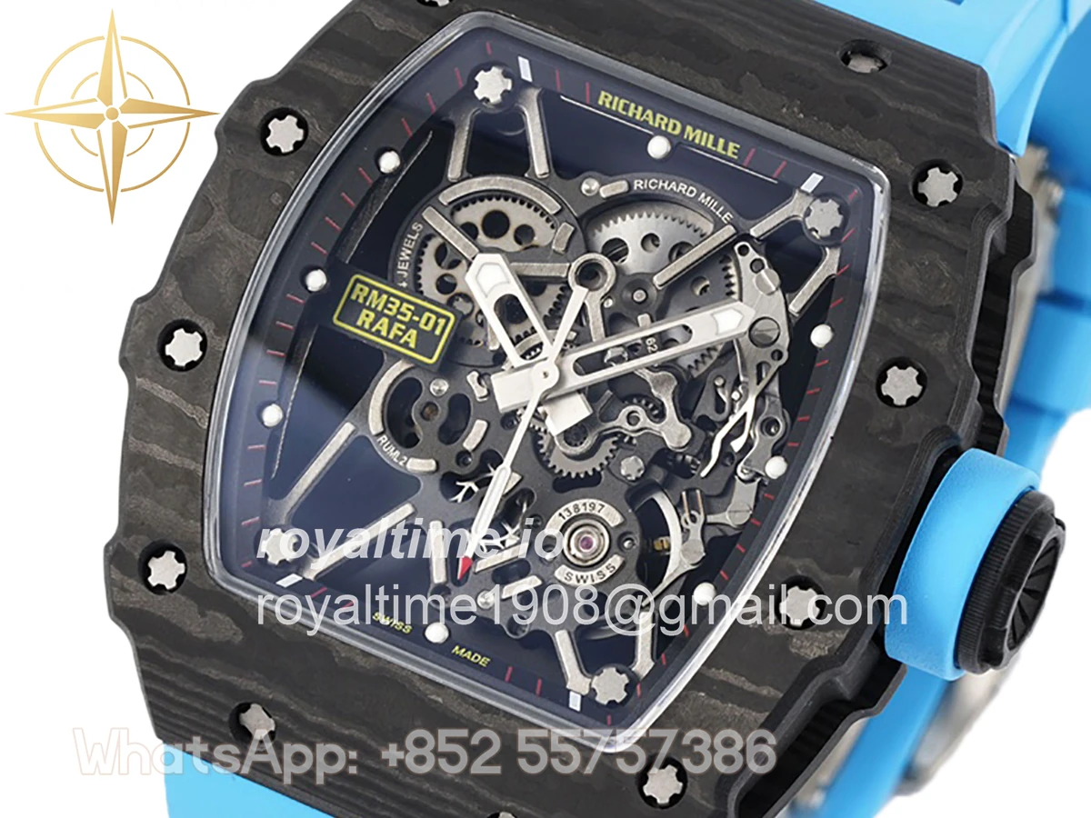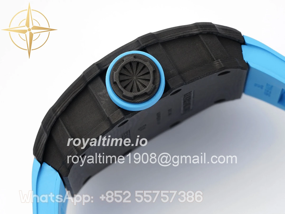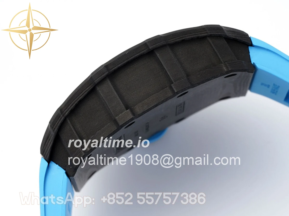 Size: 43mm x 49.9mm x 13.5mm Movement: Asian clone RMUL2 manual movement, working spring wheel at same position as genuine watch, very close to genuine looking. Functions: Hours, minutes and seconds display Case: Black carbon case Crystal: Scratch-proof sapphire crystal with AR coating Dial: Skeleton dial Bezel: Black carbon bezel Strap: Blue rubber strap Clasp: High quality deployment clasp Water resistance: <20 Meters