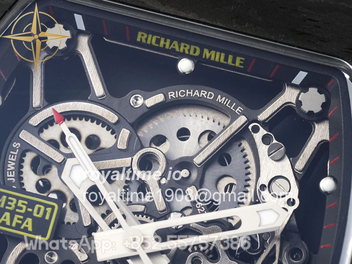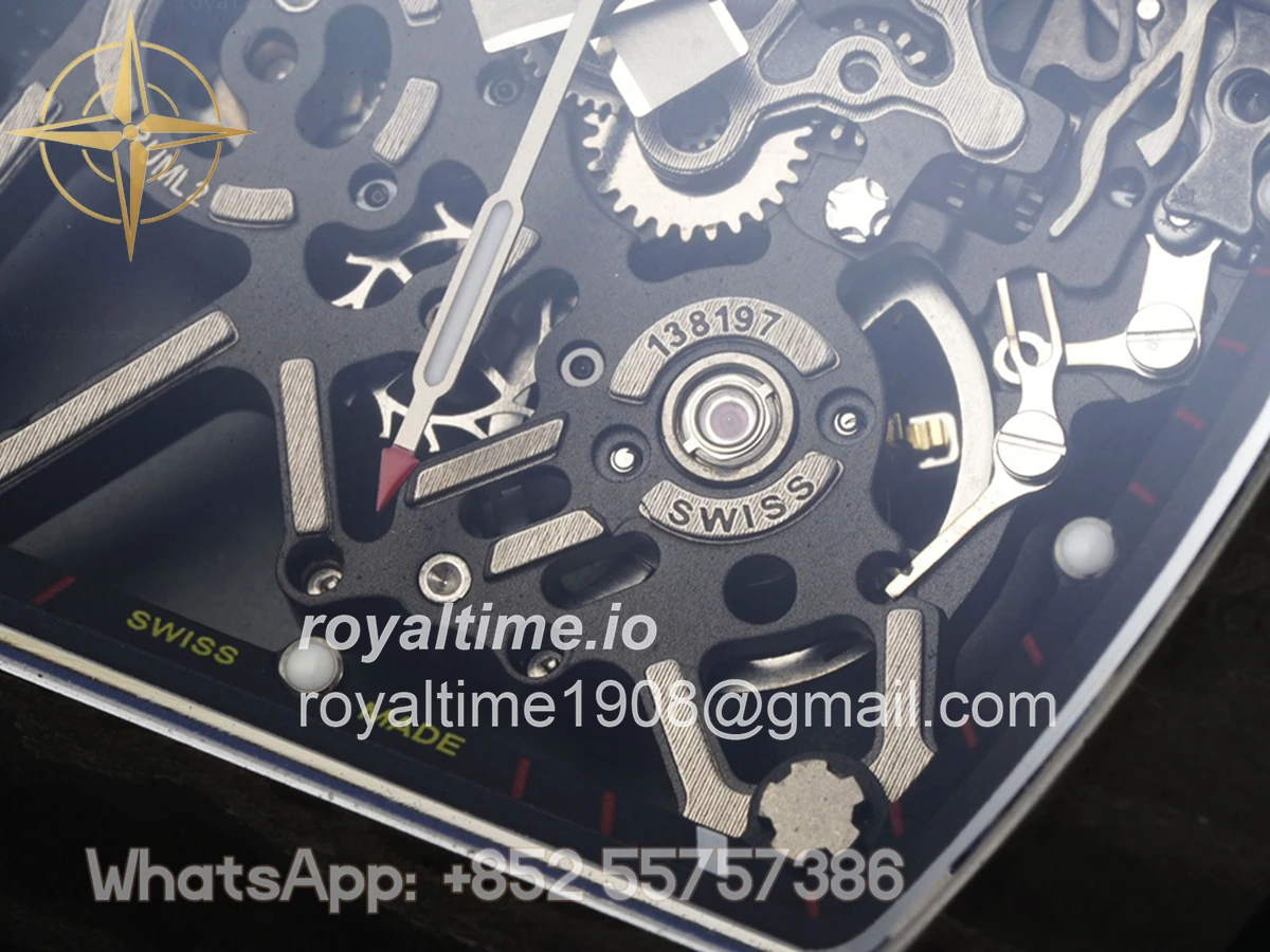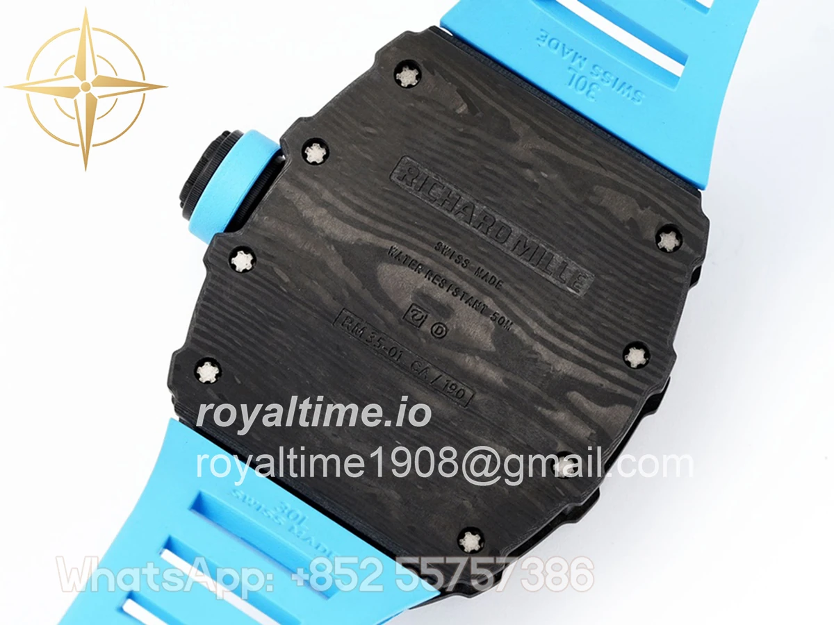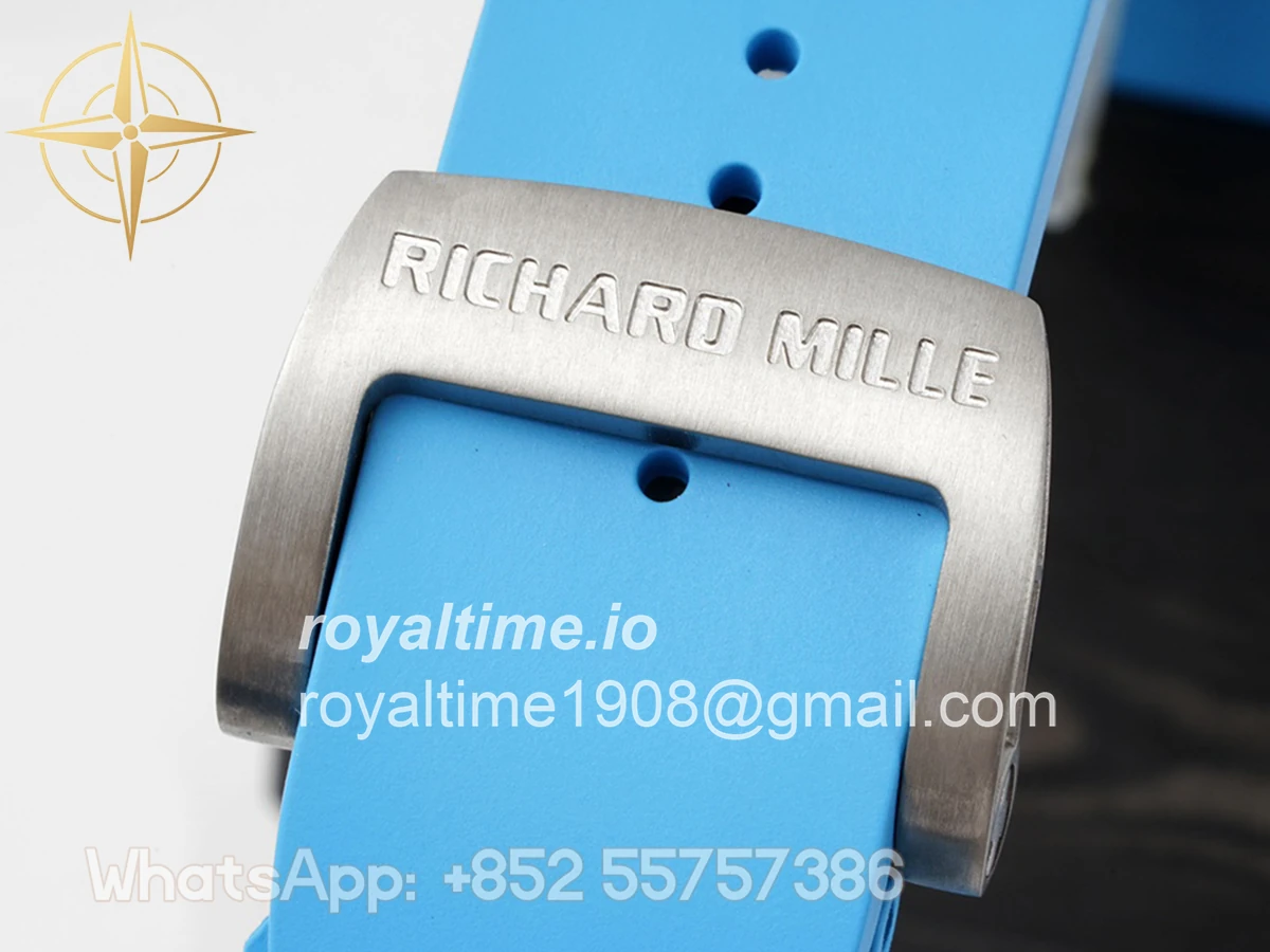 Size: 43mm x 49.9mm x 13.5mm Movement: Asian clone RMUL2 manual movement, working spring wheel at same position as genuine watch, very close to genuine looking. Functions: Hours, minutes and seconds display Case: Black carbon case Crystal: Scratch-proof sapphire crystal with AR coating Dial: Skeleton dial Bezel: Black carbon bezel Strap: Blue rubber strap Clasp: High quality deployment clasp Water resistance: <20 Meters