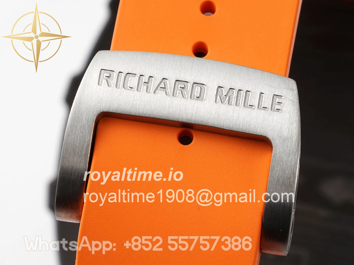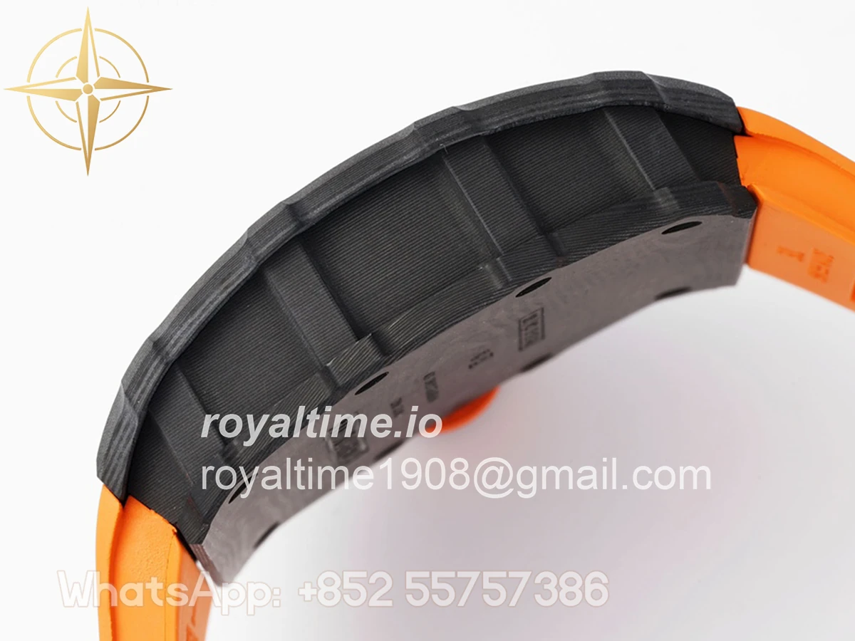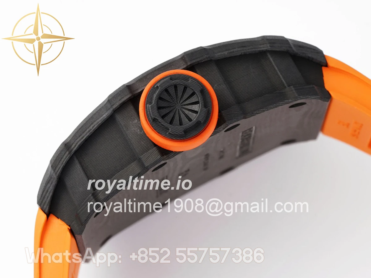 Size: 43mm x 49.9mm x 13.5mm Movement: Asian clone RMUL2 manual movement, working spring wheel at same position as genuine watch, very close to genuine looking. Functions: Hours, minutes and seconds display Case: Black carbon case Crystal: Scratch-proof sapphire crystal with AR coating Dial: Skeleton dial Bezel: Black carbon bezel Strap: Orange rubber strap Clasp: High quality deployment clasp Water resistance: <20 Meters