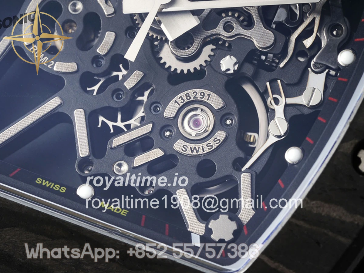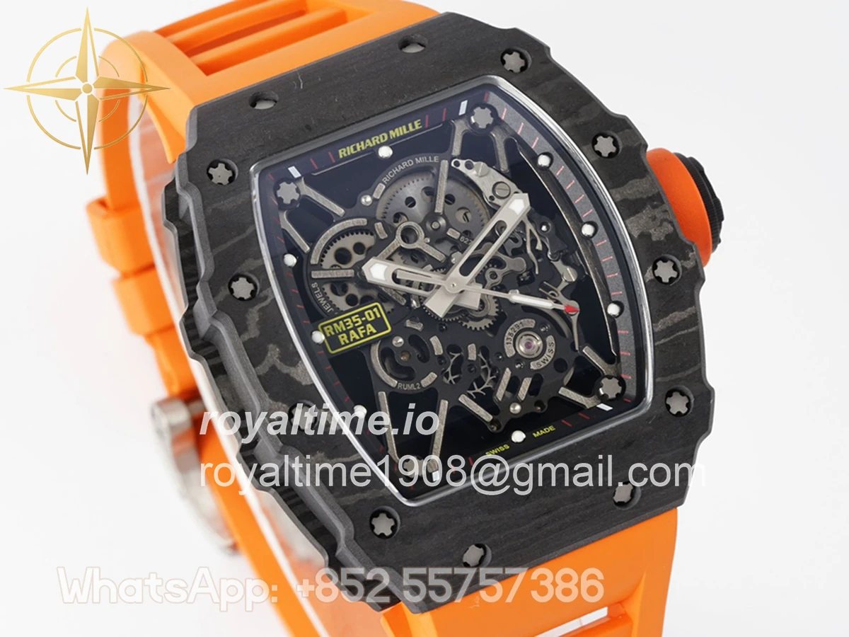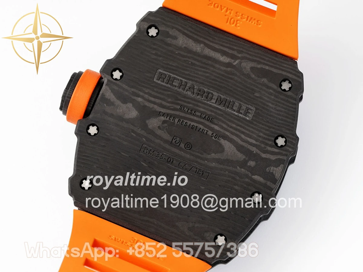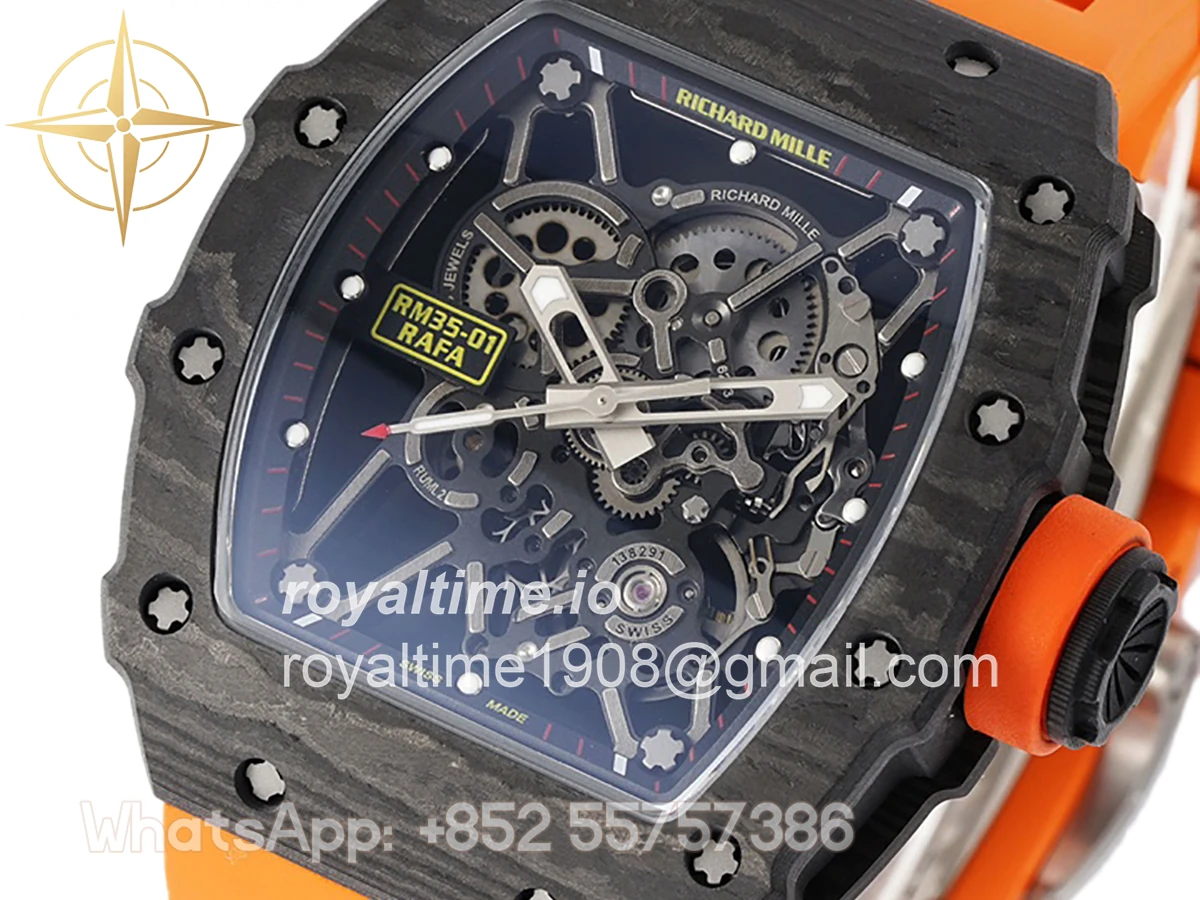 Size: 43mm x 49.9mm x 13.5mm Movement: Asian clone RMUL2 manual movement, working spring wheel at same position as genuine watch, very close to genuine looking. Functions: Hours, minutes and seconds display Case: Black carbon case Crystal: Scratch-proof sapphire crystal with AR coating Dial: Skeleton dial Bezel: Black carbon bezel Strap: Orange rubber strap Clasp: High quality deployment clasp Water resistance: <20 Meters