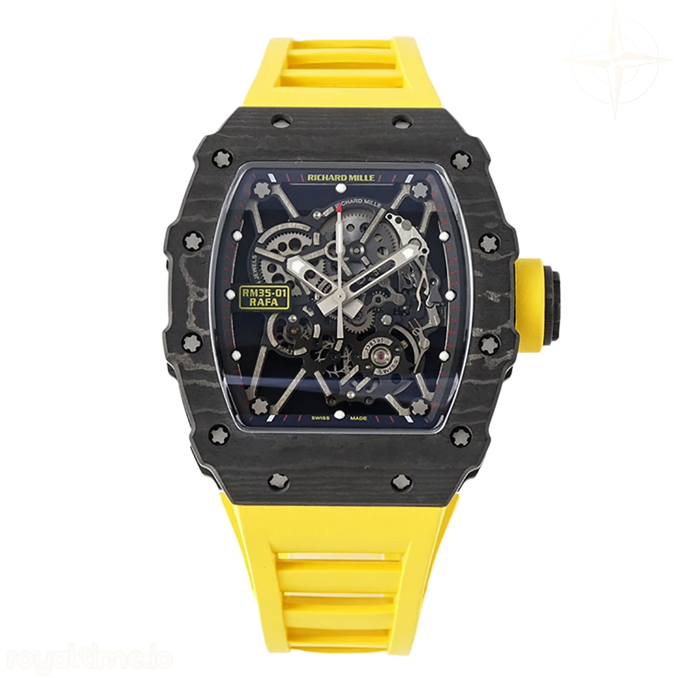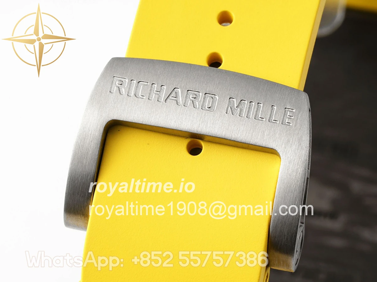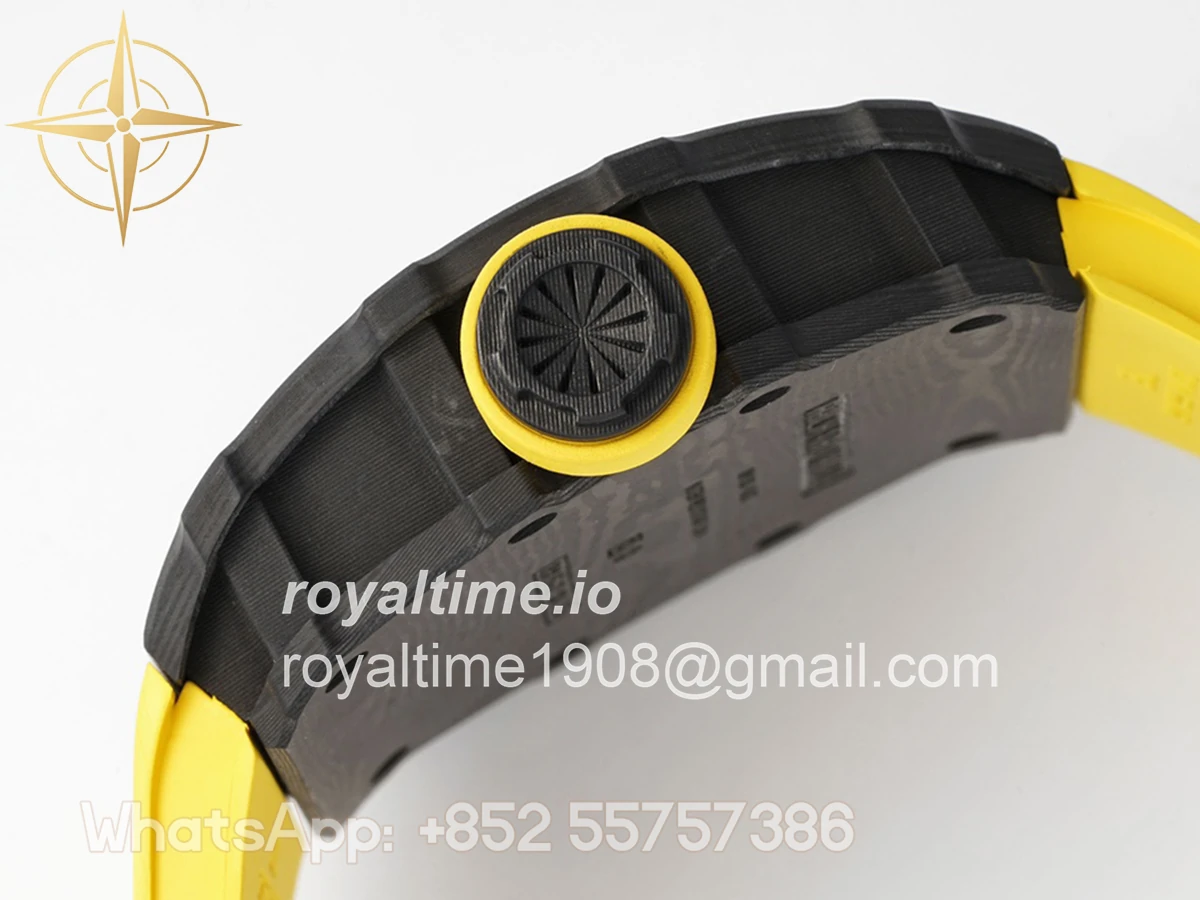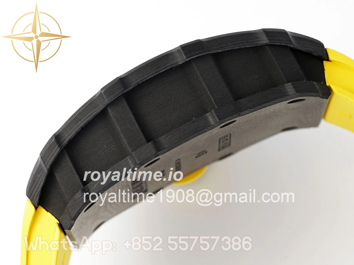 Size: 43mm x 49.9mm x 13.5mm Movement: Asian clone RMUL2 manual movement, working spring wheel at same position as genuine watch, very close to genuine looking. Functions: Hours, minutes and seconds display Case: Black carbon case Crystal: Scratch-proof sapphire crystal with AR coating Dial: Skeleton dial Bezel: Black carbon bezel Strap: Yellow rubber strap Clasp: High quality deployment clasp Water resistance: <20 Meters