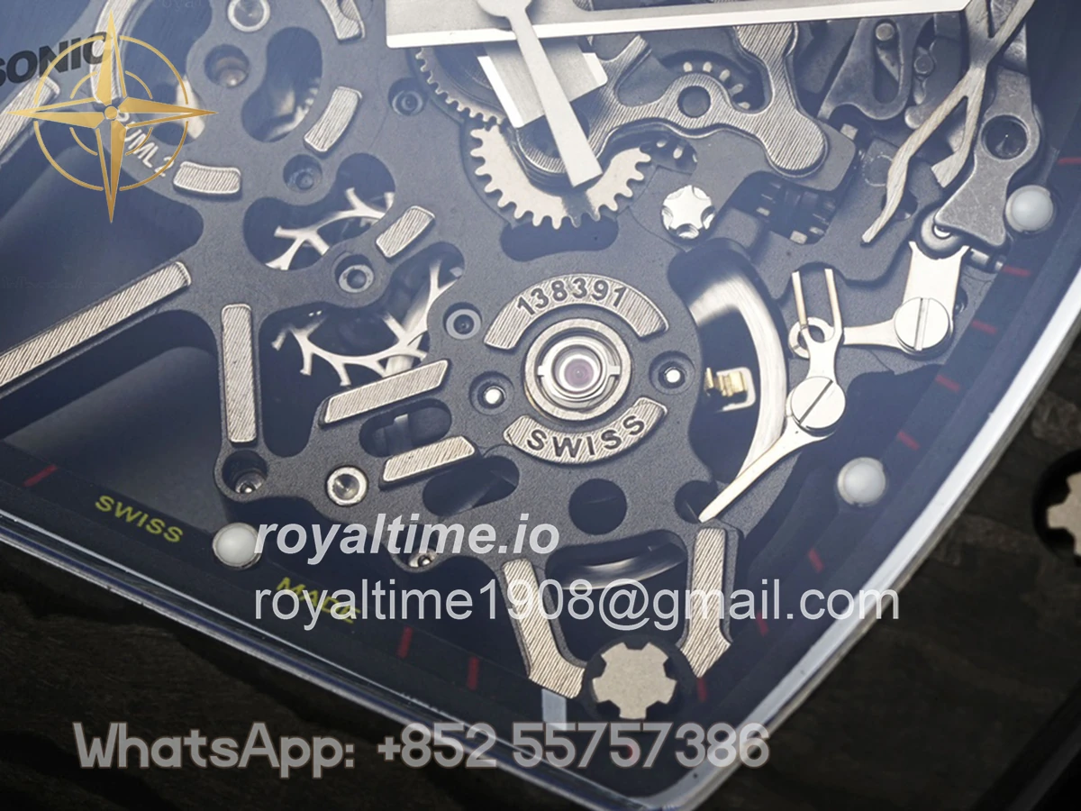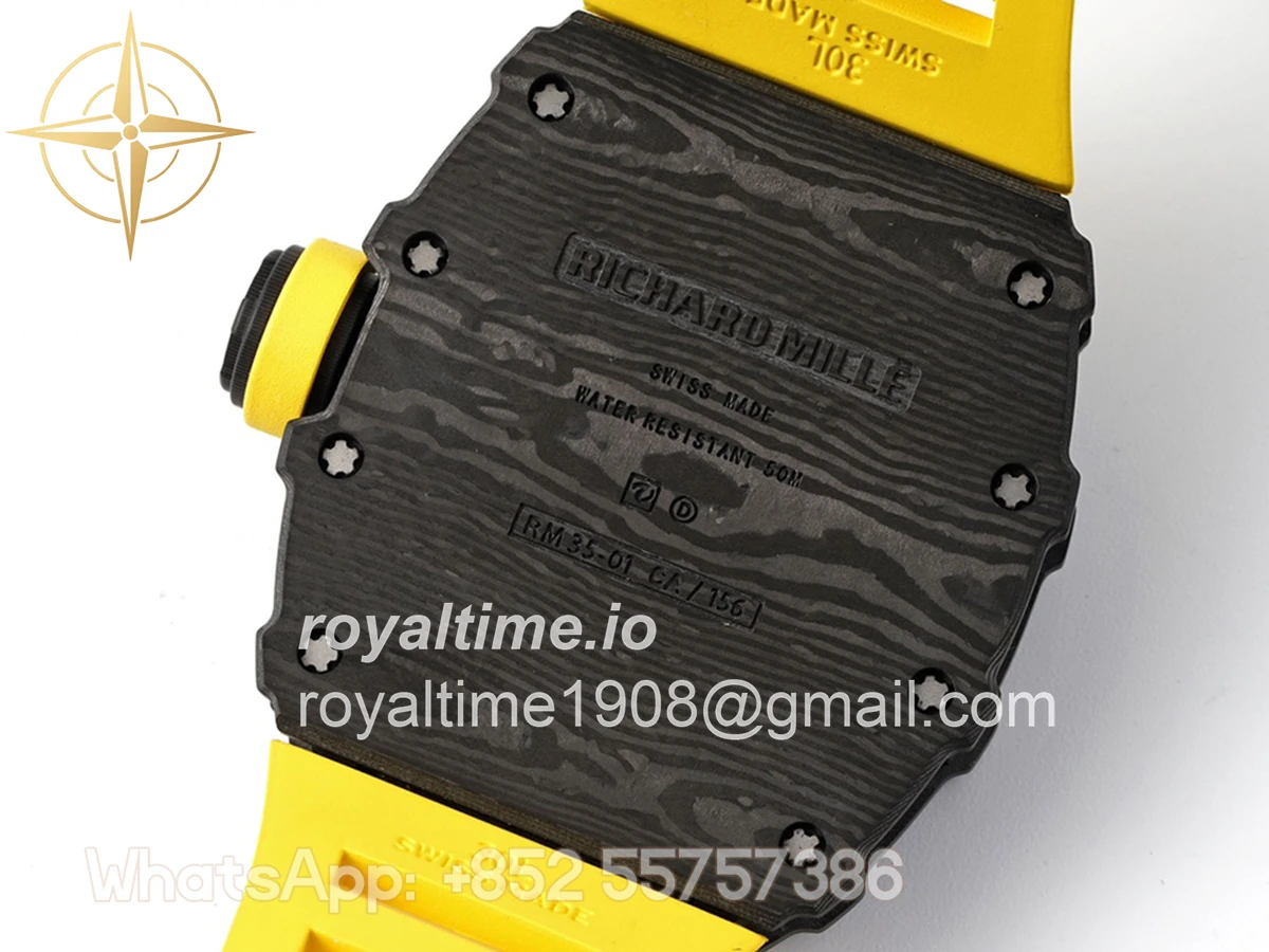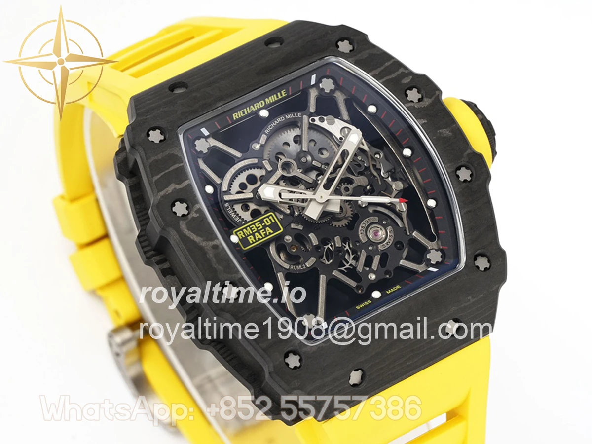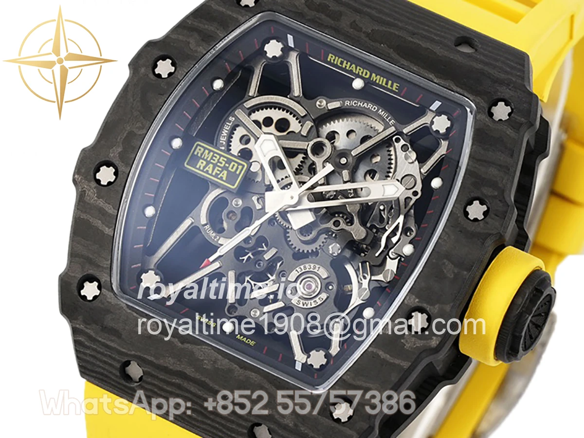 Size: 43mm x 49.9mm x 13.5mm Movement: Asian clone RMUL2 manual movement, working spring wheel at same position as genuine watch, very close to genuine looking. Functions: Hours, minutes and seconds display Case: Black carbon case Crystal: Scratch-proof sapphire crystal with AR coating Dial: Skeleton dial Bezel: Black carbon bezel Strap: Yellow rubber strap Clasp: High quality deployment clasp Water resistance: <20 Meters