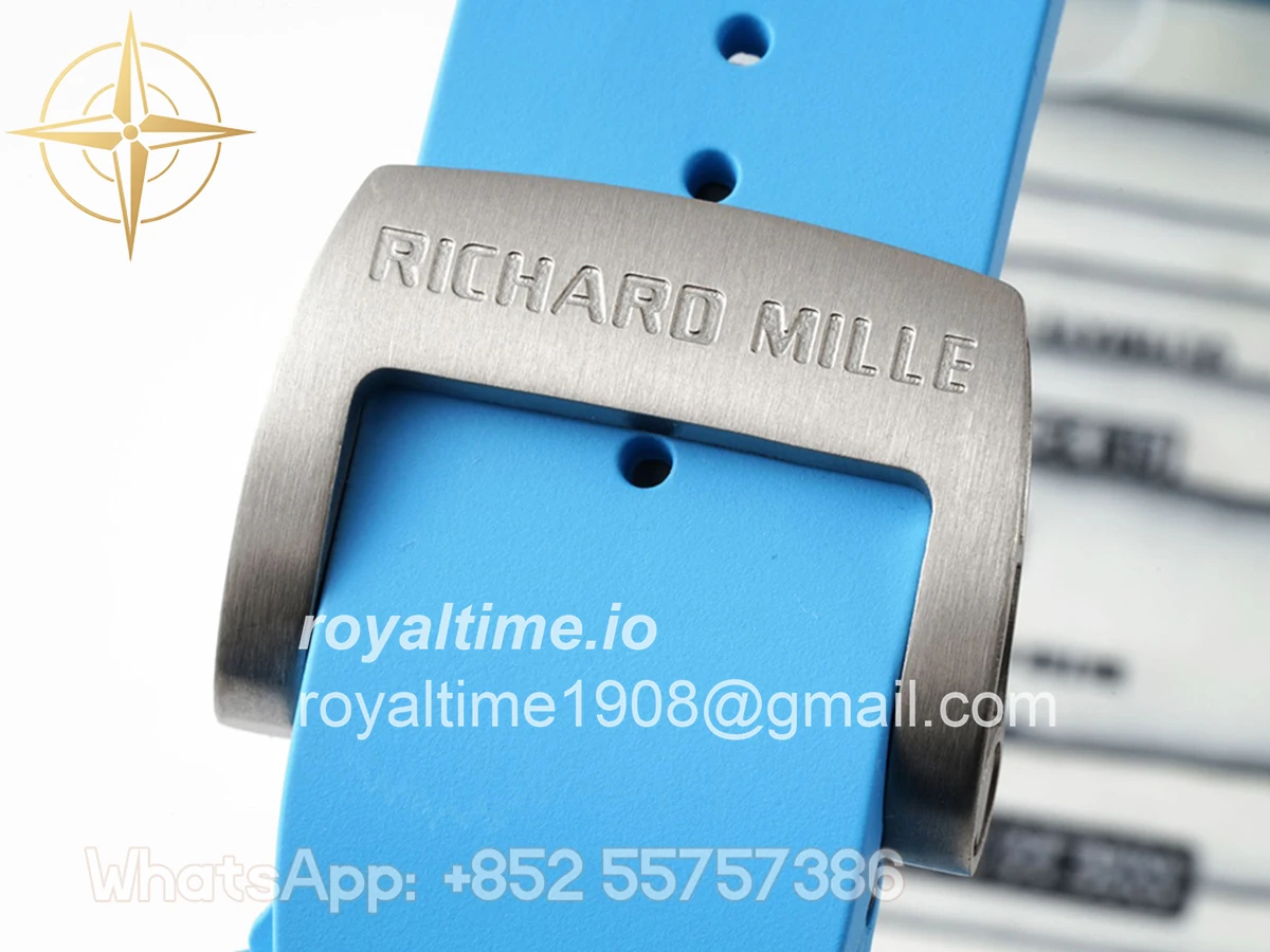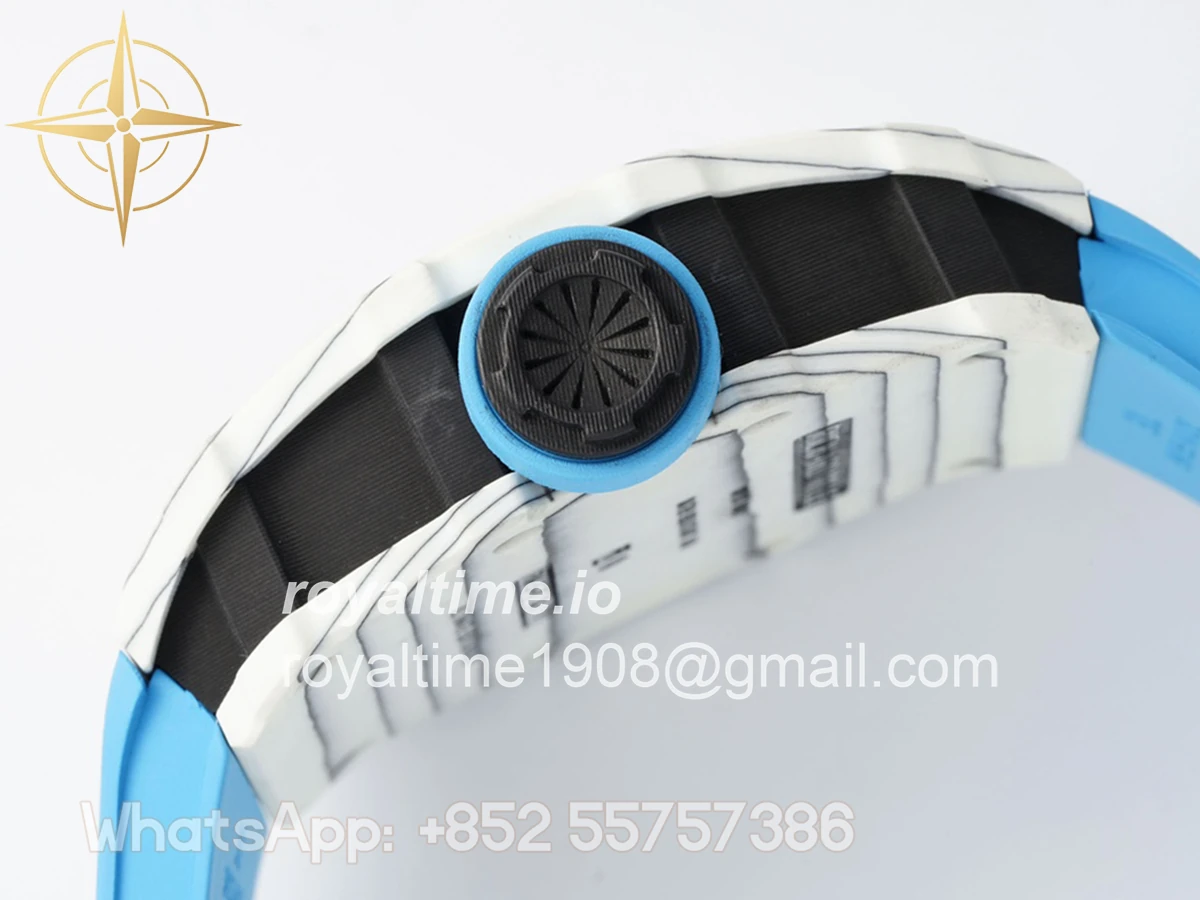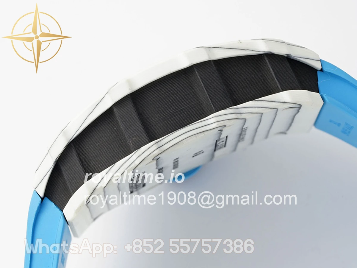 Size: 43mm x 49.9mm x 13.5mm Movement: Asian clone RMUL2 manual movement, working spring wheel at same position as genuine watch, very close to genuine looking. Functions: Hours, minutes and seconds display Case: White carbon case Crystal: Scratch-proof sapphire crystal with AR coating Dial: Skeleton dial Bezel: White carbon bezel Strap: Blue rubber strap Clasp: High quality deployment clasp Water resistance: <20 Meters