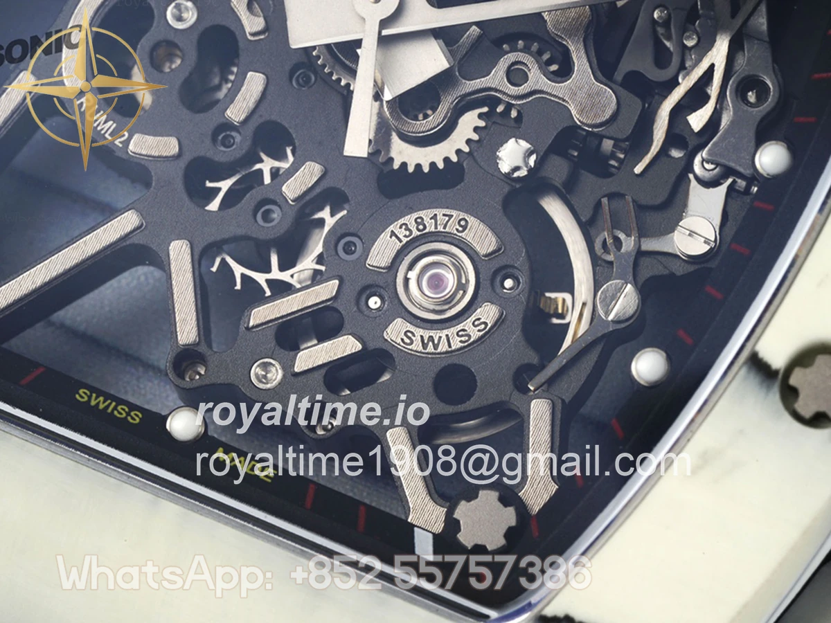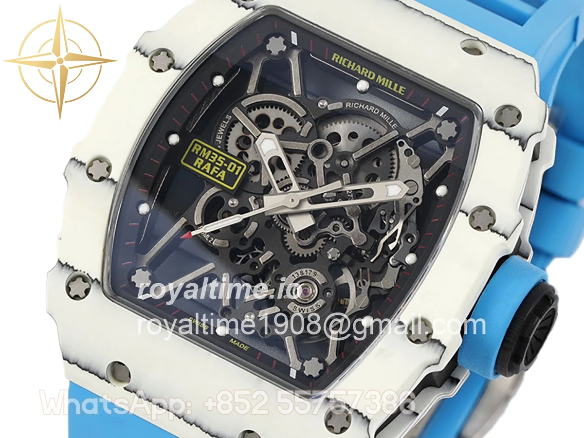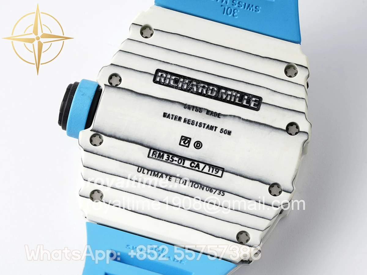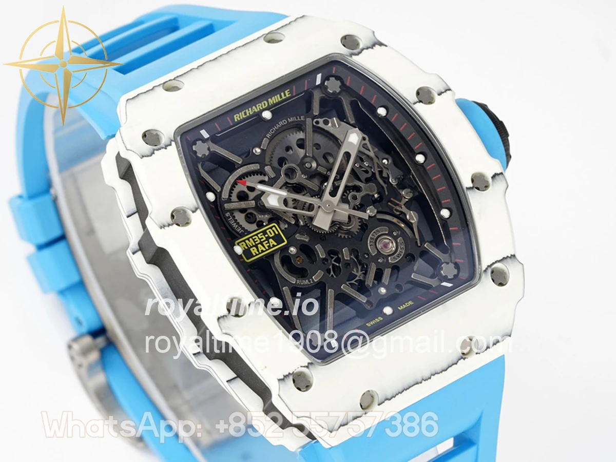 Size: 43mm x 49.9mm x 13.5mm Movement: Asian clone RMUL2 manual movement, working spring wheel at same position as genuine watch, very close to genuine looking. Functions: Hours, minutes and seconds display Case: White carbon case Crystal: Scratch-proof sapphire crystal with AR coating Dial: Skeleton dial Bezel: White carbon bezel Strap: Blue rubber strap Clasp: High quality deployment clasp Water resistance: <20 Meters