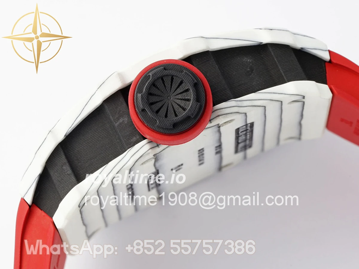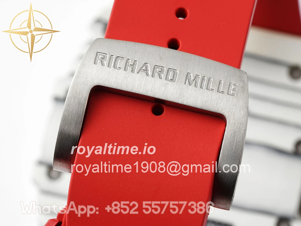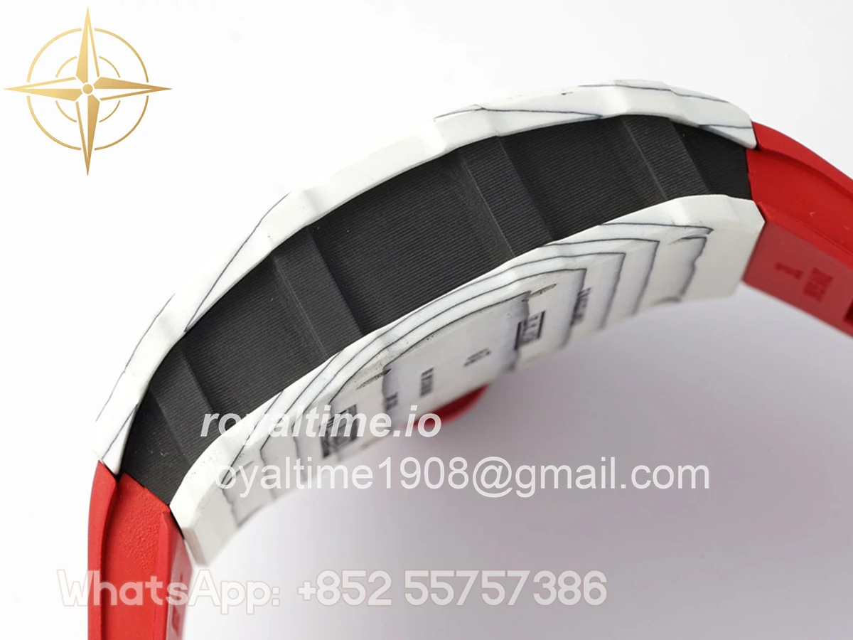 Size: 43mm x 49.9mm x 13.5mm Movement: Asian clone RMUL2 manual movement, working spring wheel at same position as genuine watch, very close to genuine looking. Functions: Hours, minutes and seconds display Case: White carbon case Crystal: Scratch-proof sapphire crystal with AR coating Dial: Skeleton dial Bezel: White carbon bezel Strap: Red rubber strap Clasp: High quality deployment clasp Water resistance: <20 Meters
