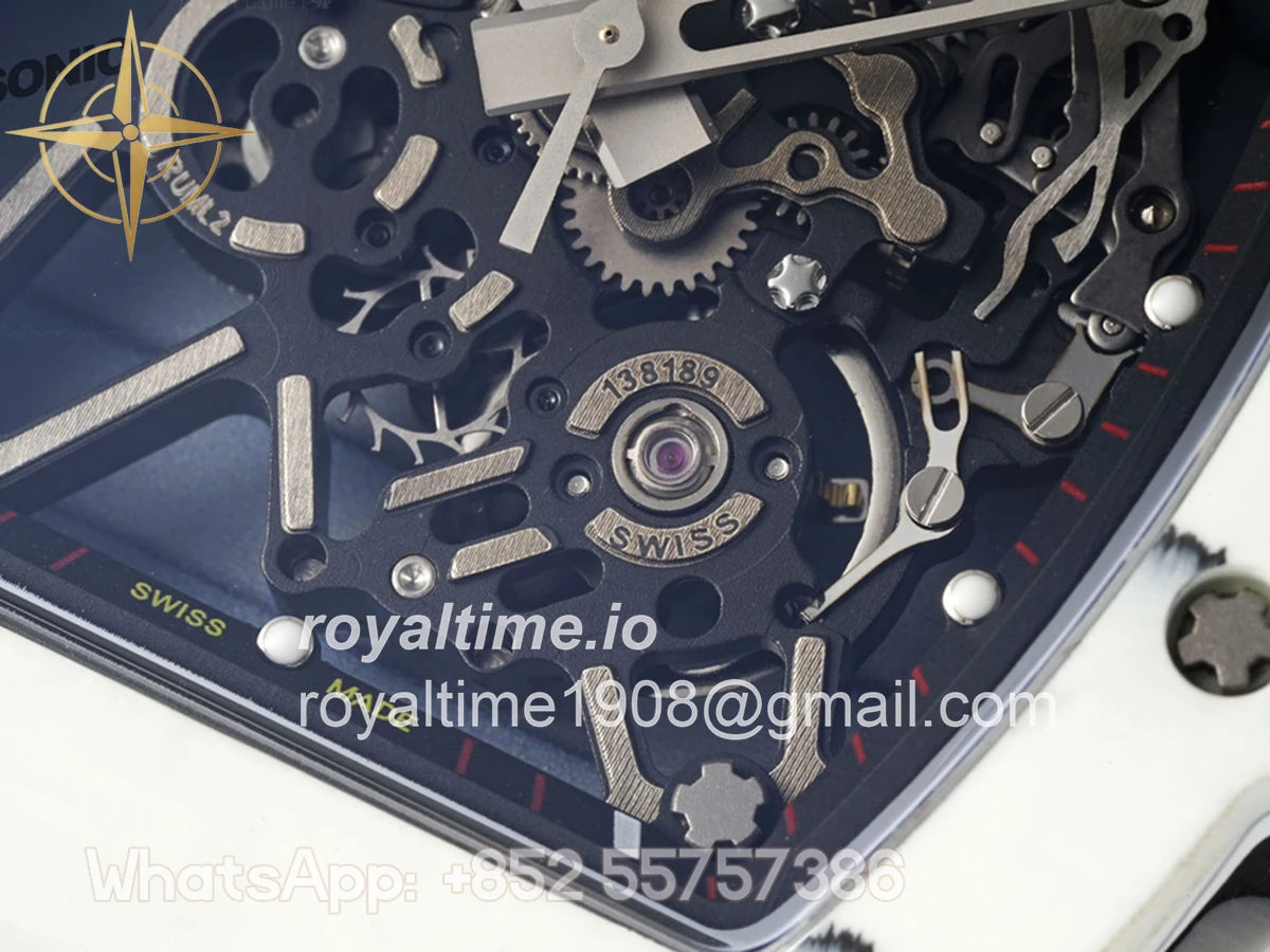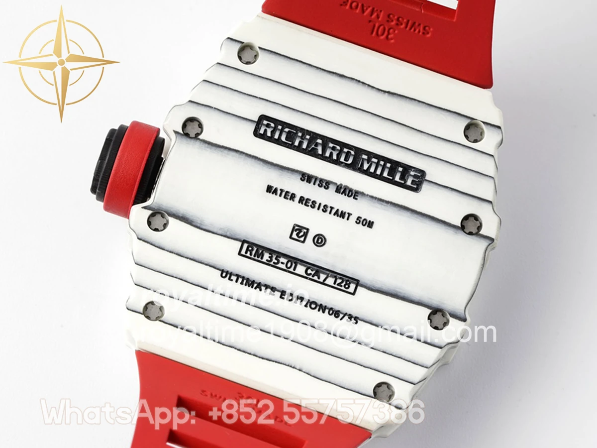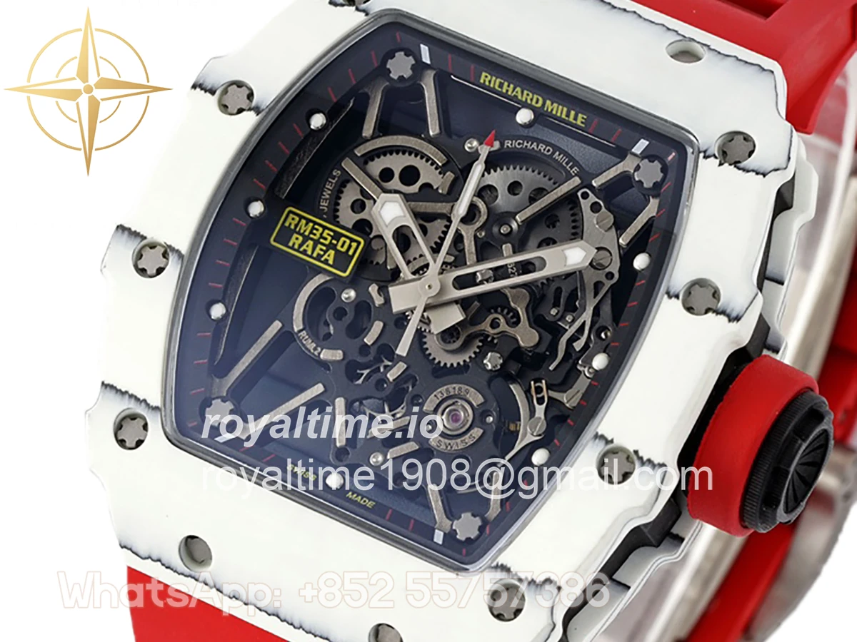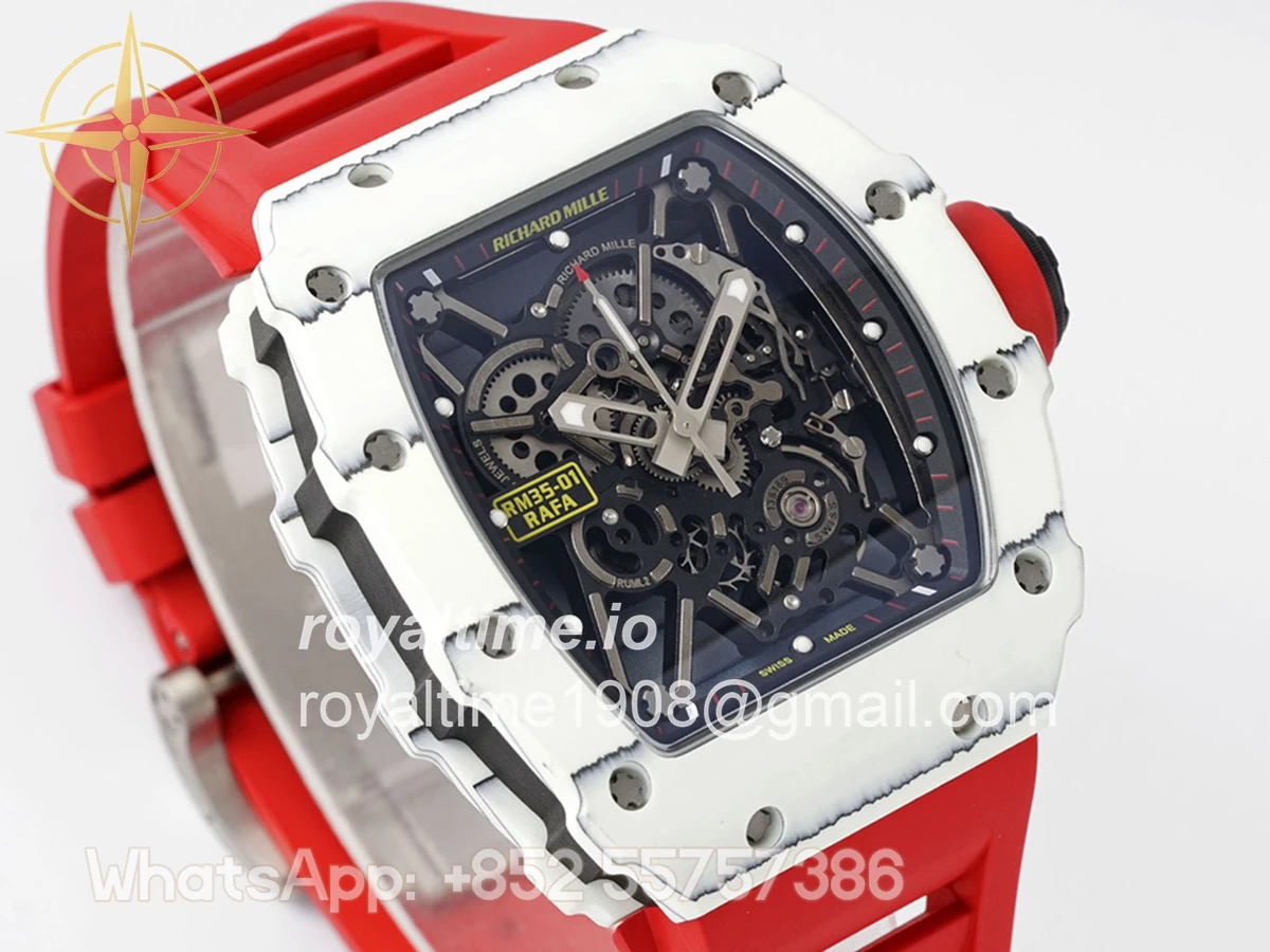 Size: 43mm x 49.9mm x 13.5mm Movement: Asian clone RMUL2 manual movement, working spring wheel at same position as genuine watch, very close to genuine looking. Functions: Hours, minutes and seconds display Case: White carbon case Crystal: Scratch-proof sapphire crystal with AR coating Dial: Skeleton dial Bezel: White carbon bezel Strap: Red rubber strap Clasp: High quality deployment clasp Water resistance: <20 Meters