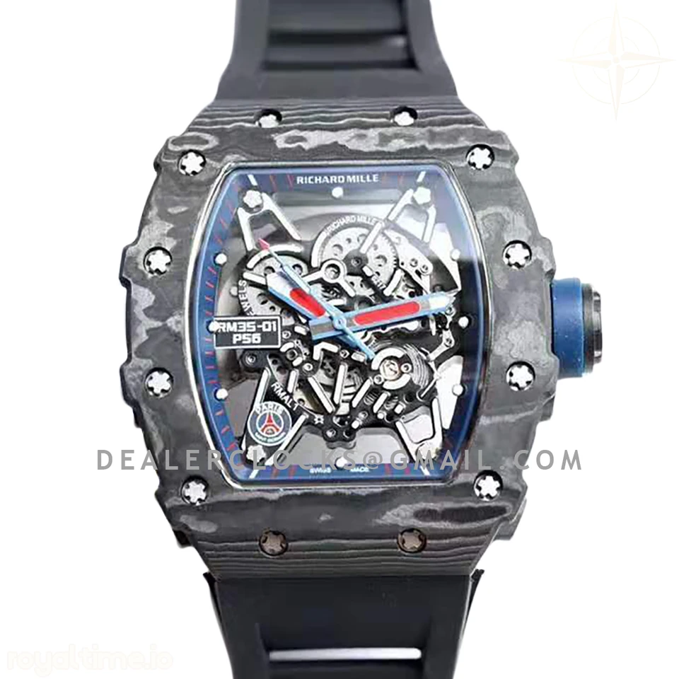 Size: 43mm x 50mm x 16.5mm Movement: Japanese MIYOTA 8215 automatic movement Functions: Hours, minutes and seconds display Case: Full forged carbon case Crystal: Scratch-proof sapphire crystal with blue tinted AR Dial: Skeleton dial Bezel: Forged carbon bezel Strap: Black rubber strap Water resistance: <20 meters