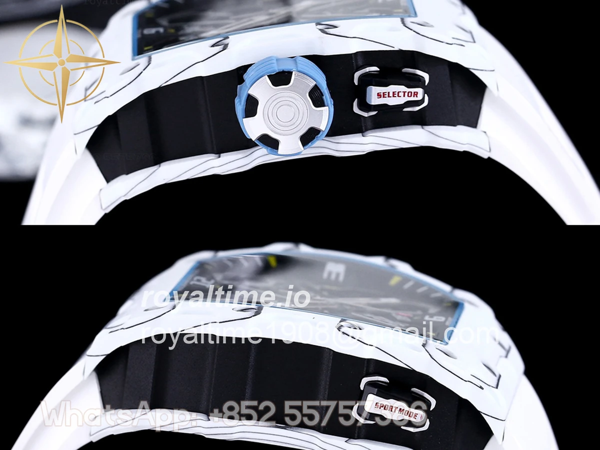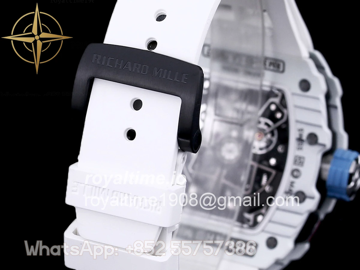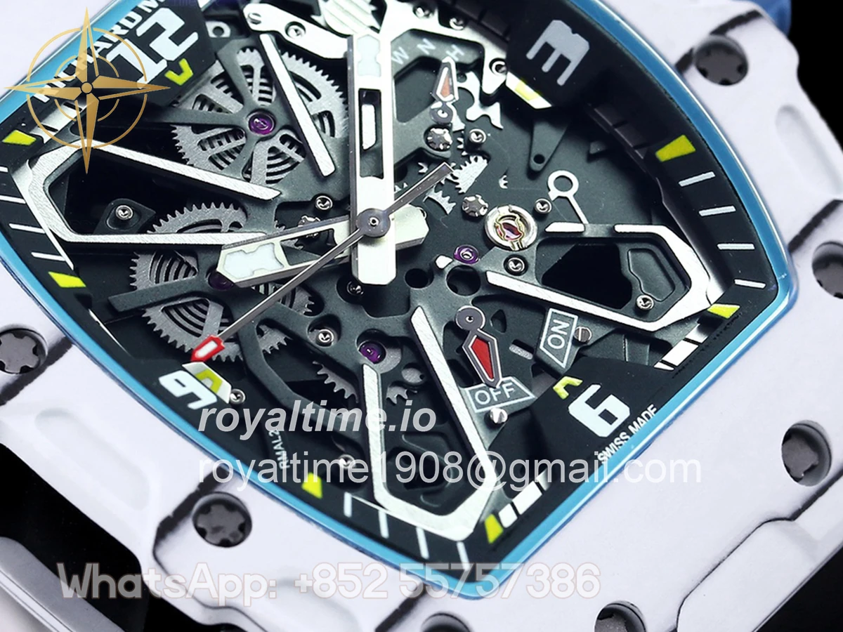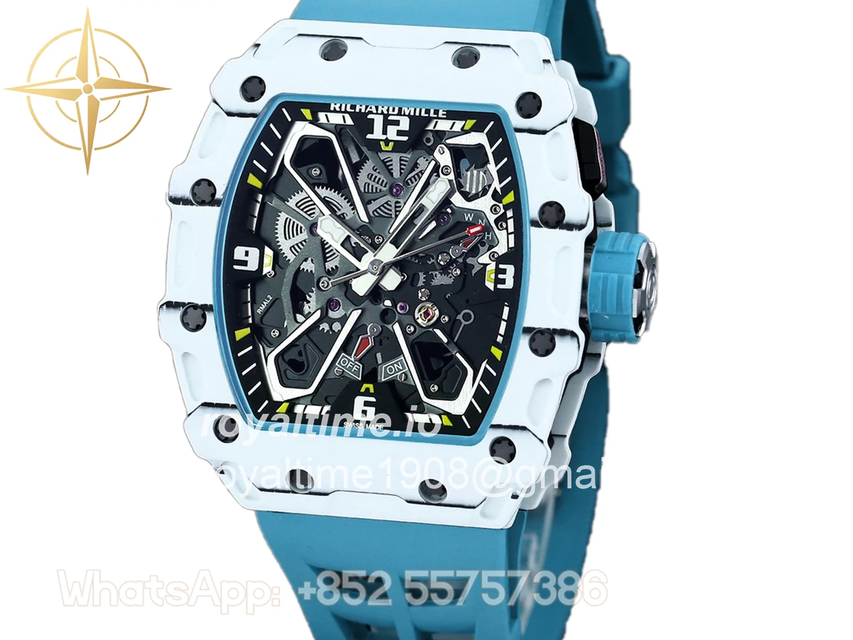 Size: 41.5mm x 50.5mm x 16mm Movement: Japanese MIYOTA 8215 Automatic Movement Functions: Hours, minutes and seconds display Case: White NTPT Carbon / Quartz TPT case Crystal: Scratch-proof sapphire crystal with blue tinted AR Dial: Skeleton dial Bezel: NTPT Carbon / Quartz TPT bezel Strap: Black, Blue, White strap Clasp: Deployment buckle Water resistance: Yes